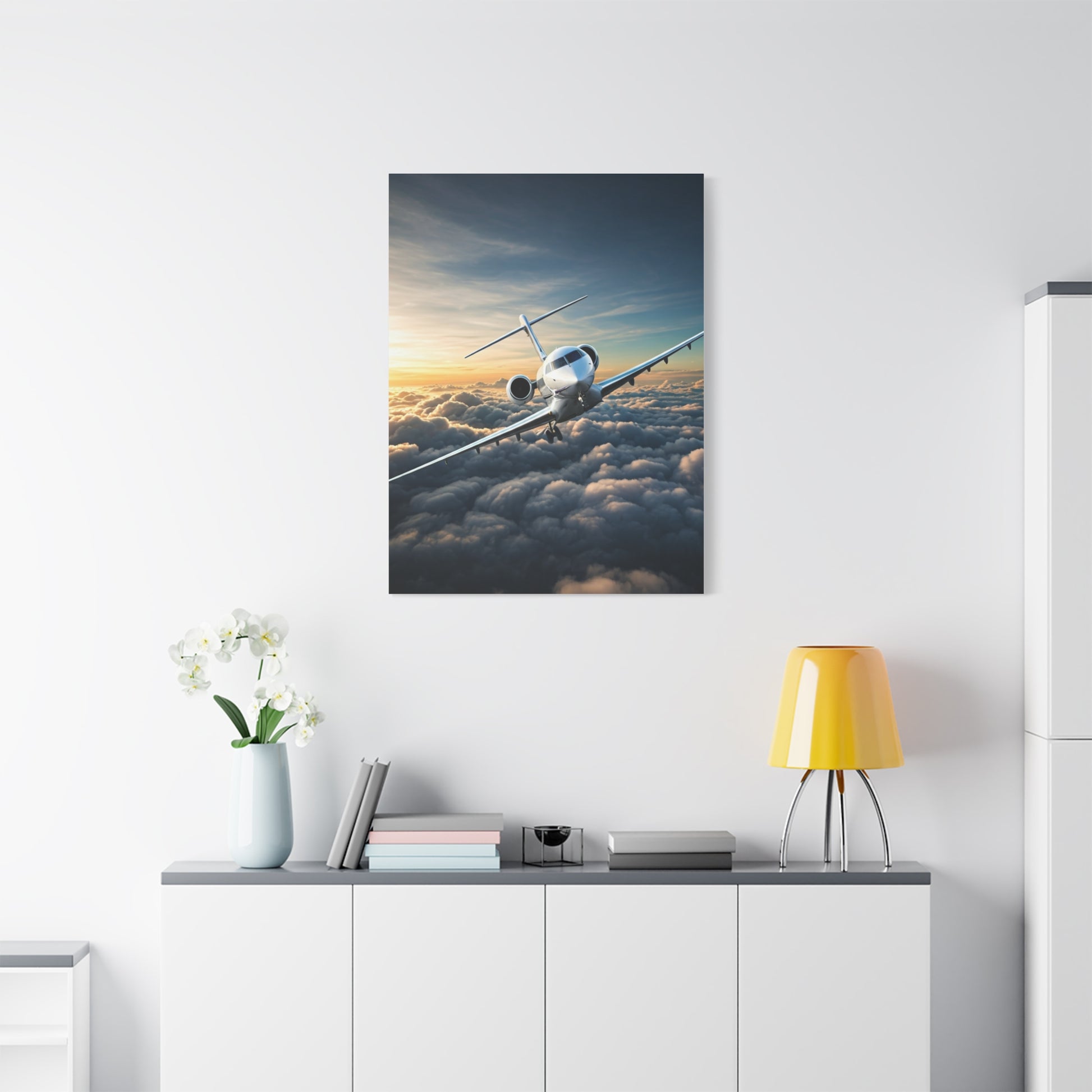 This inspiring artwork captures an aircraft gliding smoothly above endless clouds under a soft sunrise sky. The serene atmosphere conveys peace, possibility, and limitless horizons, making it an elegant piece for minimalist spaces, modern homes, or anyone dreaming of flight and discovery.