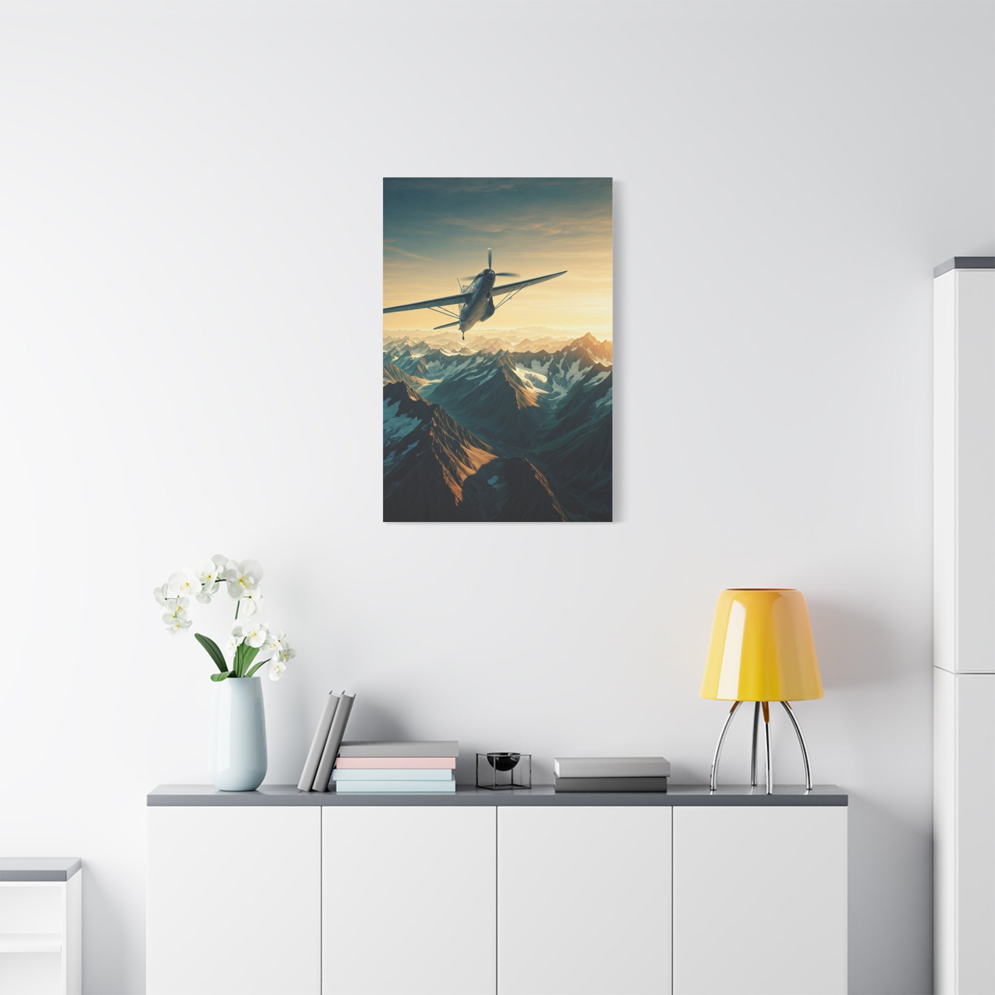 This inspiring artwork portrays a sleek aircraft soaring high above rugged mountain peaks, bathed in soft sunrise light. The vast landscape below evokes serenity, elevation, and the unstoppable pull of adventure. With a blend of crisp altitude and warm morning tones, this piece fits beautifully into modern interiors, travel-themed spaces, or anyone seeking wall décor that represents ambition and boundless possibility.