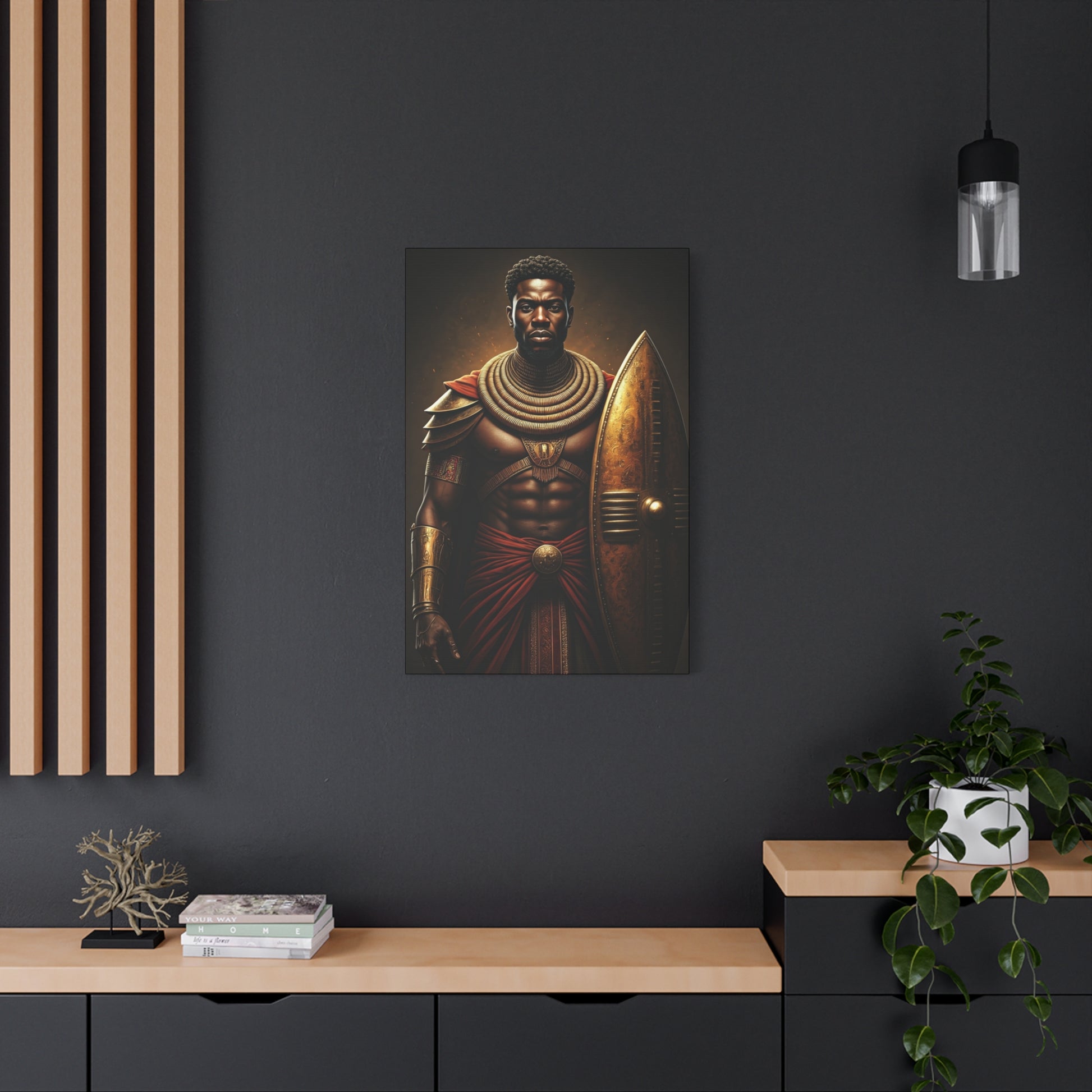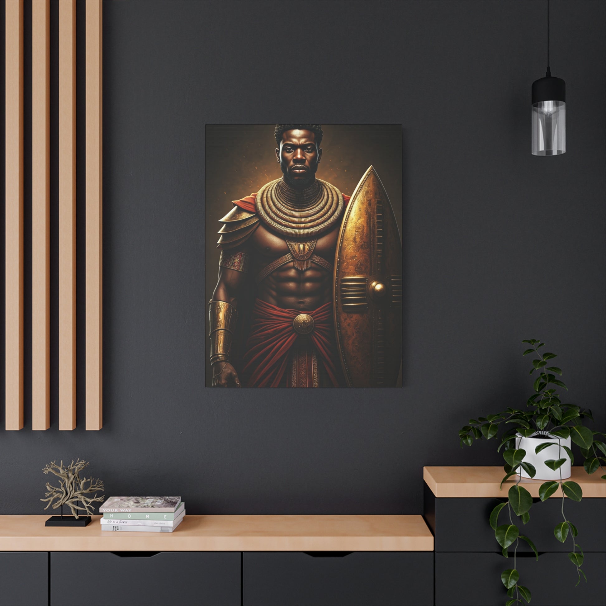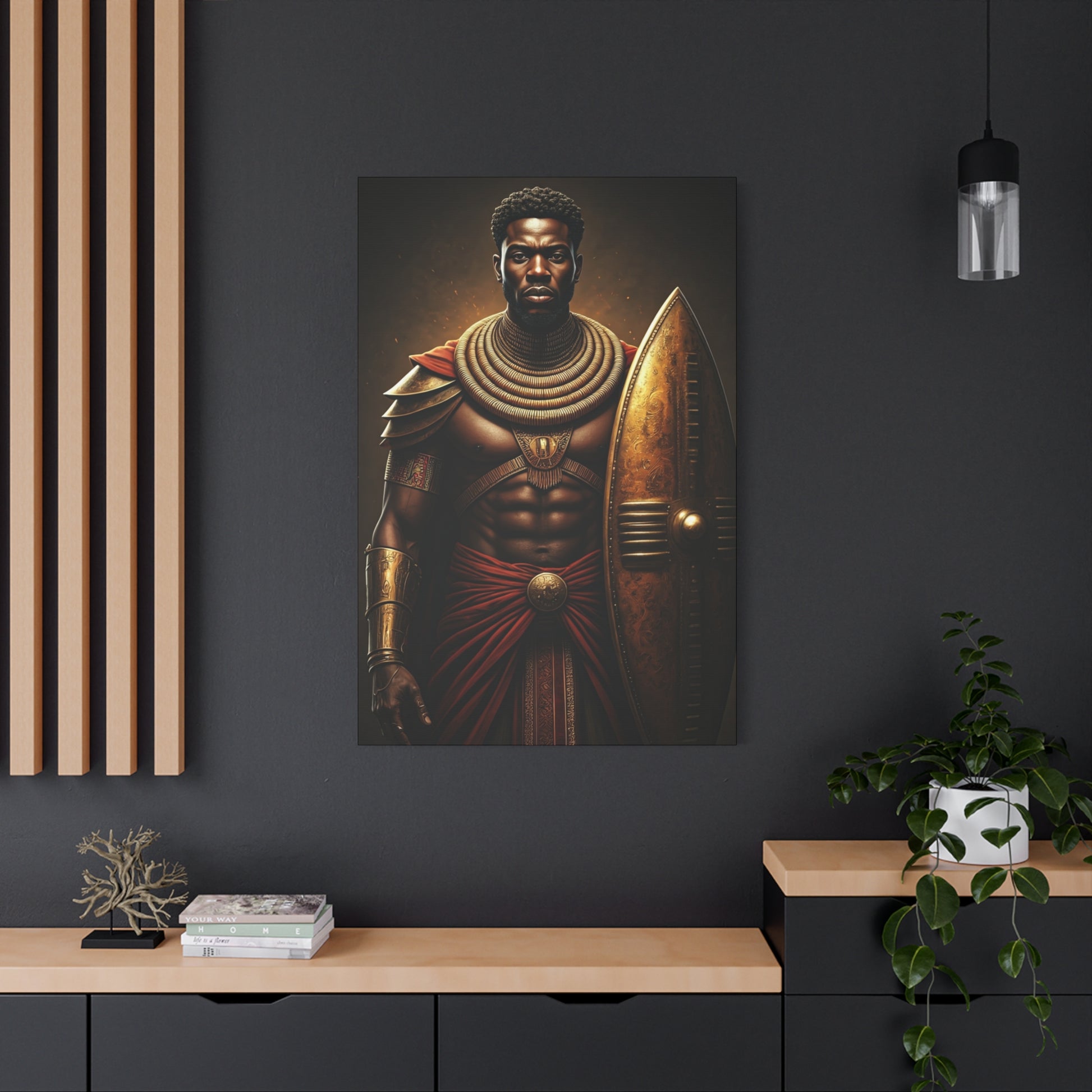 This striking artwork portrays a powerful African warrior adorned in regal armor, standing with strength beside a golden shield. Rich earthy tones and dramatic lighting create an atmosphere of honor, resilience, and ancestral pride. The detailed textures and commanding presence make this piece an ideal statement for modern interiors, cultural spaces, or bold décor themes. Perfect for collectors who appreciate heritage-inspired art and timeless warrior symbolism.