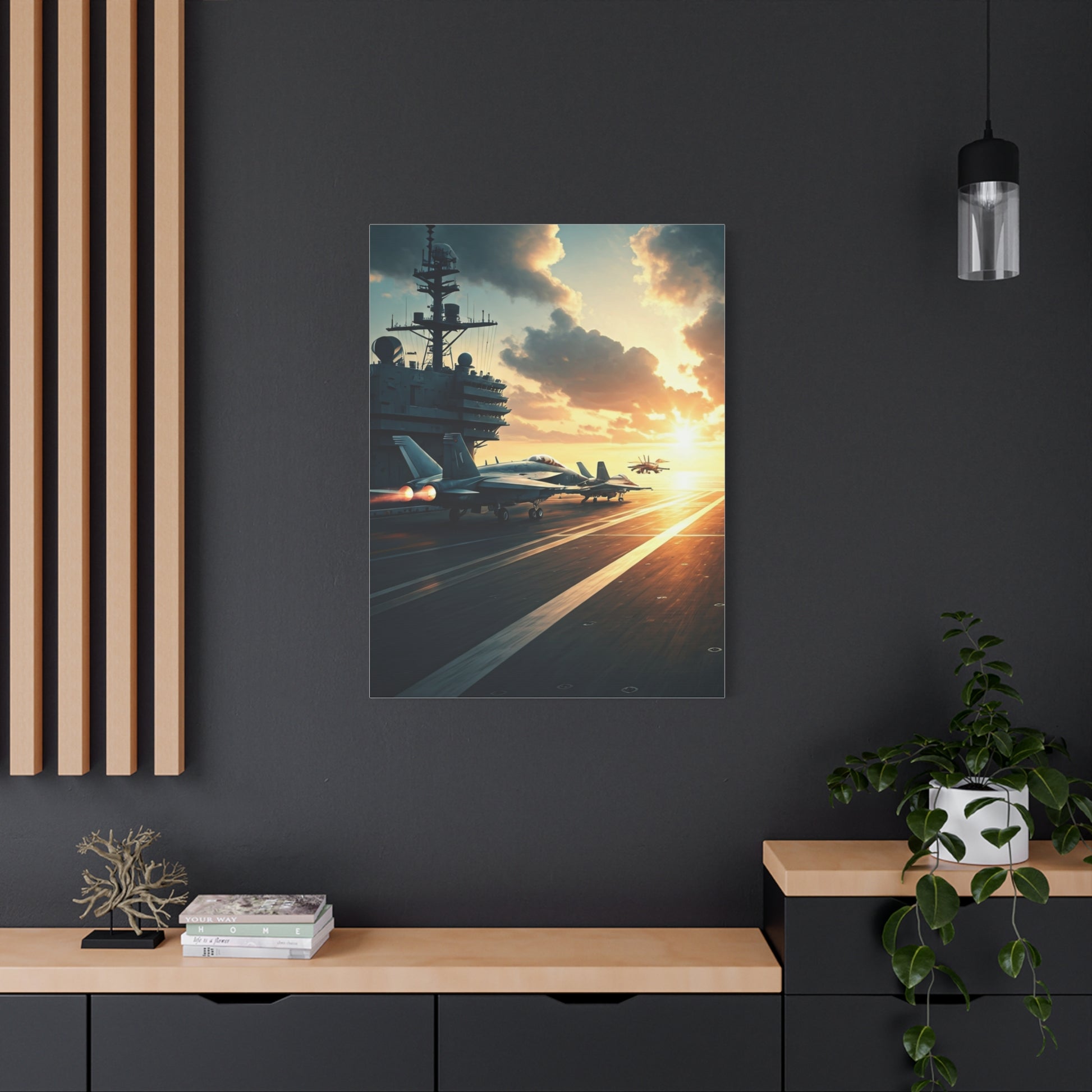 This dramatic wall art captures fighter jets positioned on an aircraft carrier runway beneath a golden sunrise. The commanding perspective and intense atmosphere symbolize strength, duty, and precision, making it the perfect décor choice for military aviation fans and bold contemporary rooms.