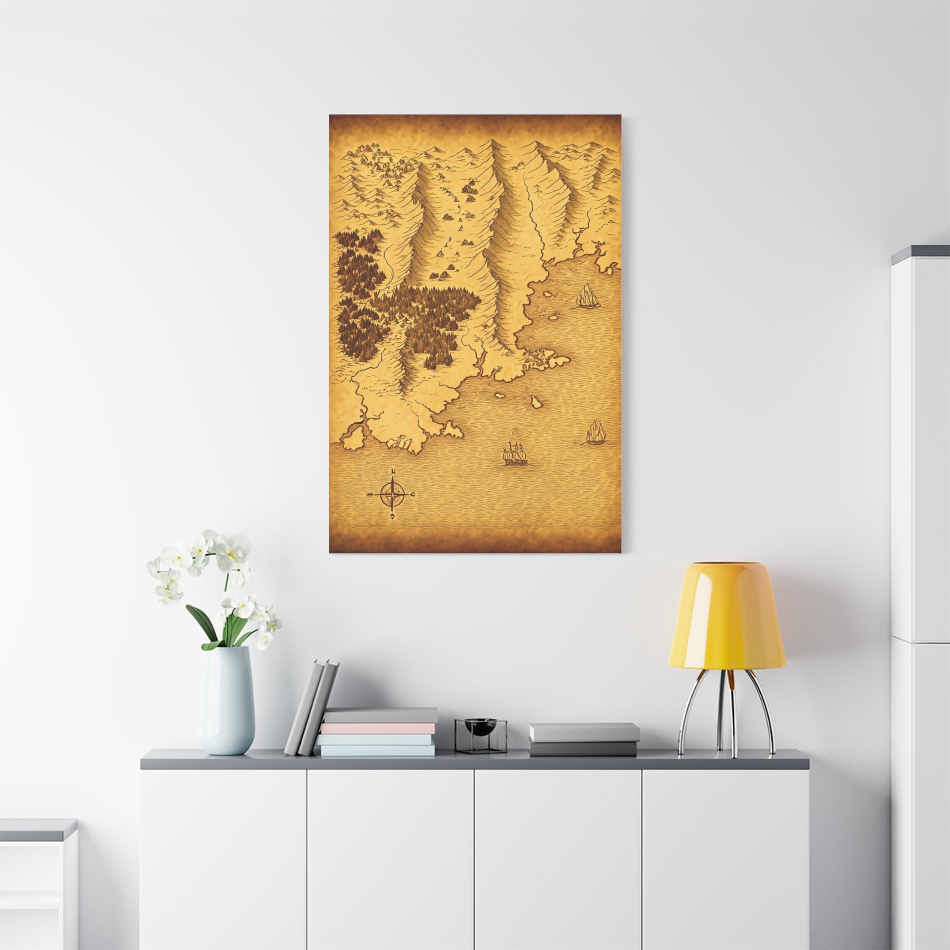 A timeless vintage world map design featuring warm parchment tones and an old compass detail. This artwork evokes the romance of historic exploration and navigation, making it perfect for travel lovers, study rooms, libraries, or classic office décor.