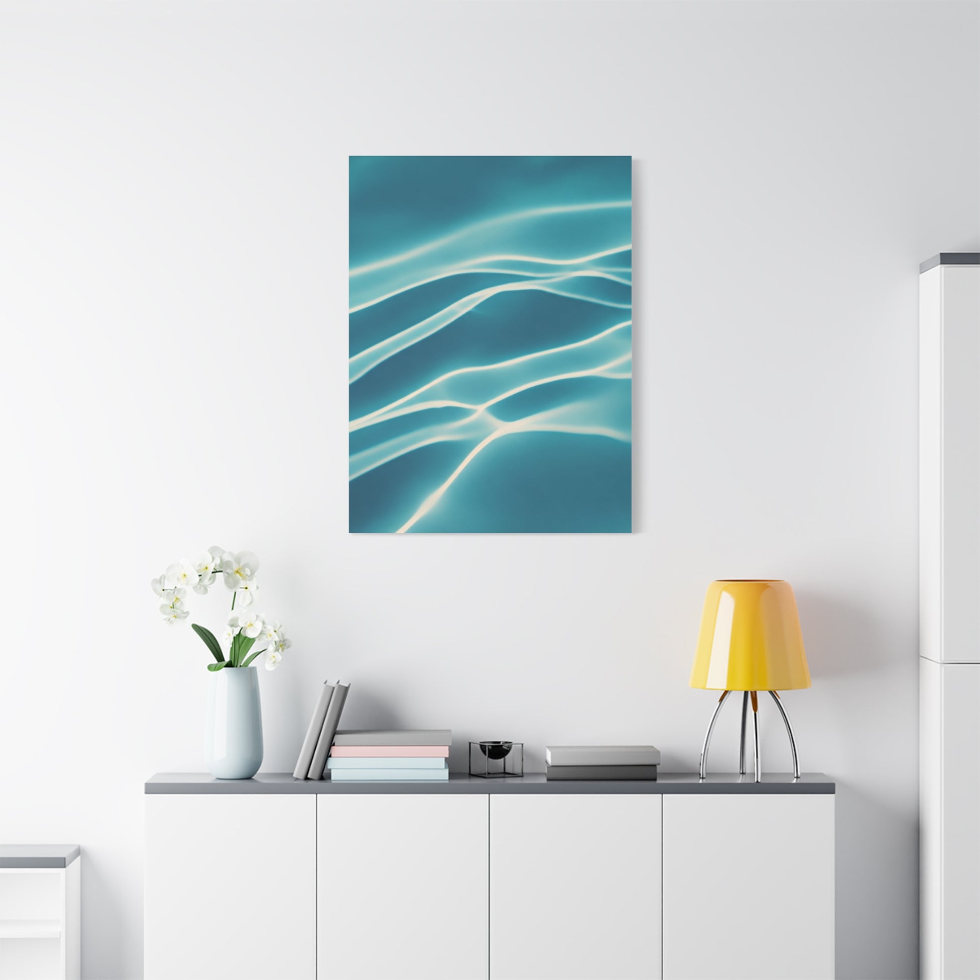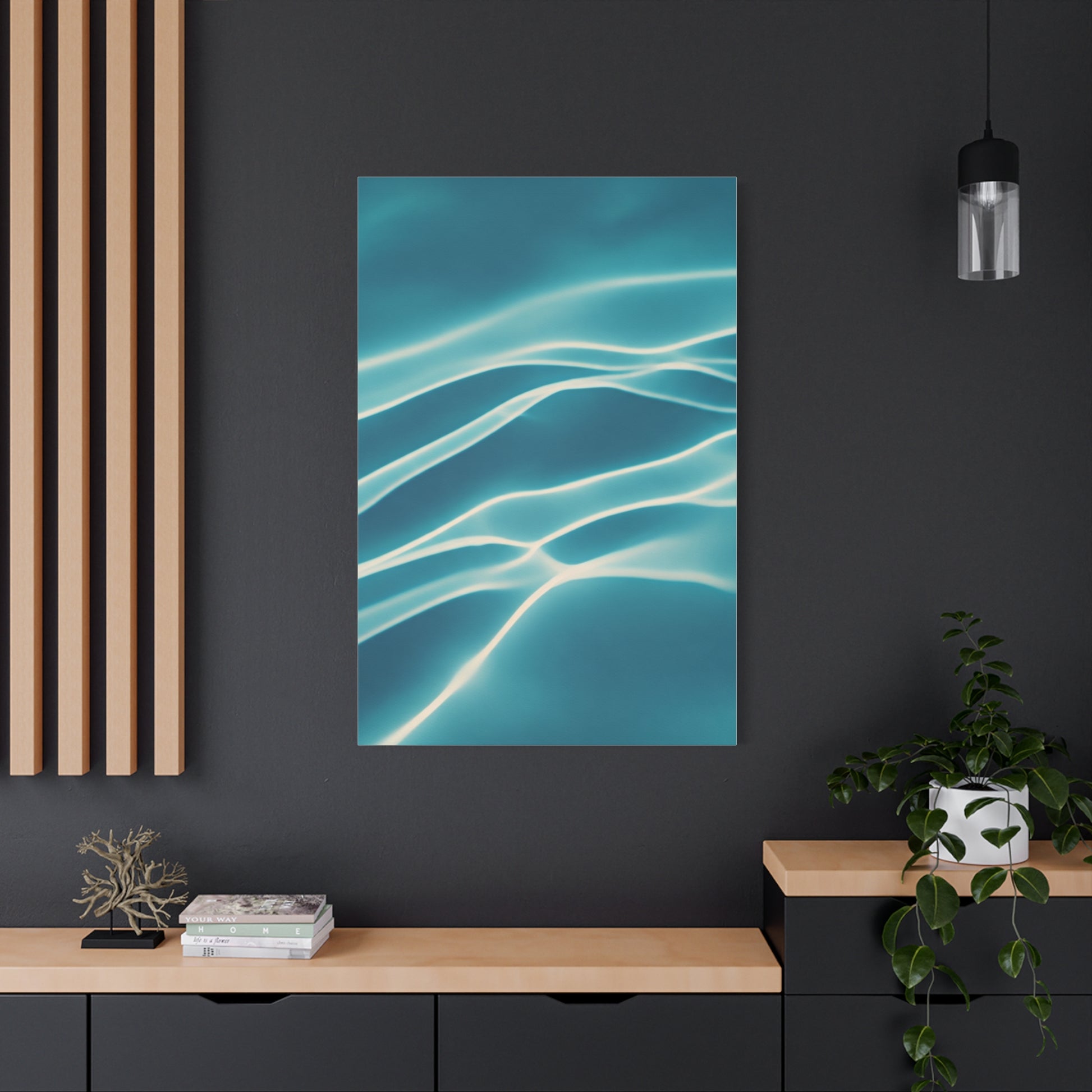 This modern artwork captures gentle light ripples dancing across a soft aqua surface, creating an elegant interplay of shadow and movement. The fluid lines and calming blue palette make it a versatile addition to contemporary, minimalist, or coastal interiors. Subtle yet visually engaging, this piece enhances spaces with a fresh and tranquil aesthetic.