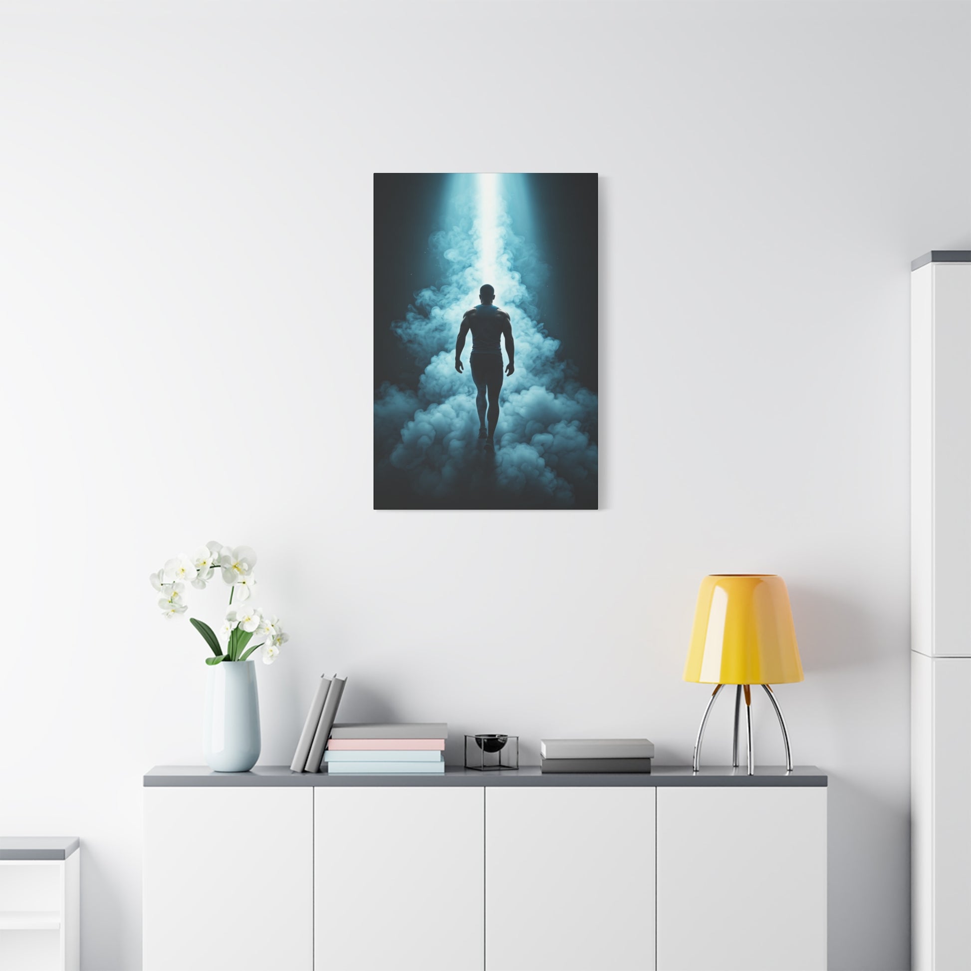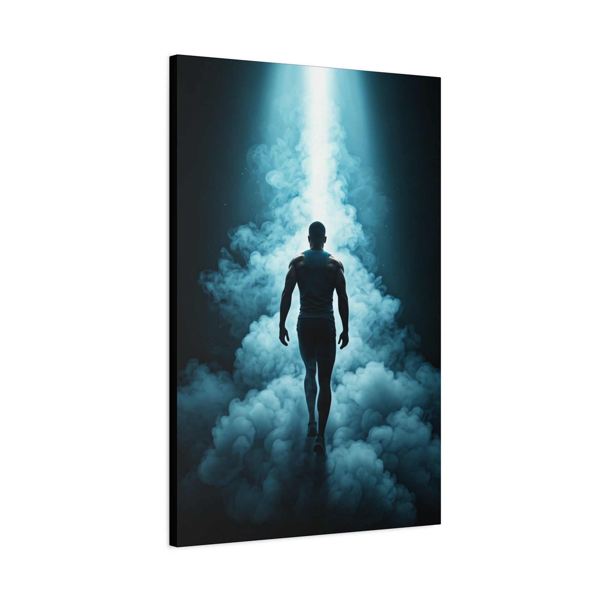 This powerful artwork captures a solitary figure walking forward through dense clouds toward a piercing beam of light above. The composition symbolizes transformation, courage, and the journey toward purpose, where uncertainty gives way to clarity. The contrast between darkness and illumination creates a dramatic sense of motion and hope, making this piece deeply emotional and motivational. Ideal for modern interiors, personal studios, or contemplative spaces, this wall art serves as a reminder that progress often begins in the unseen and strength is found by moving forward despite fear.