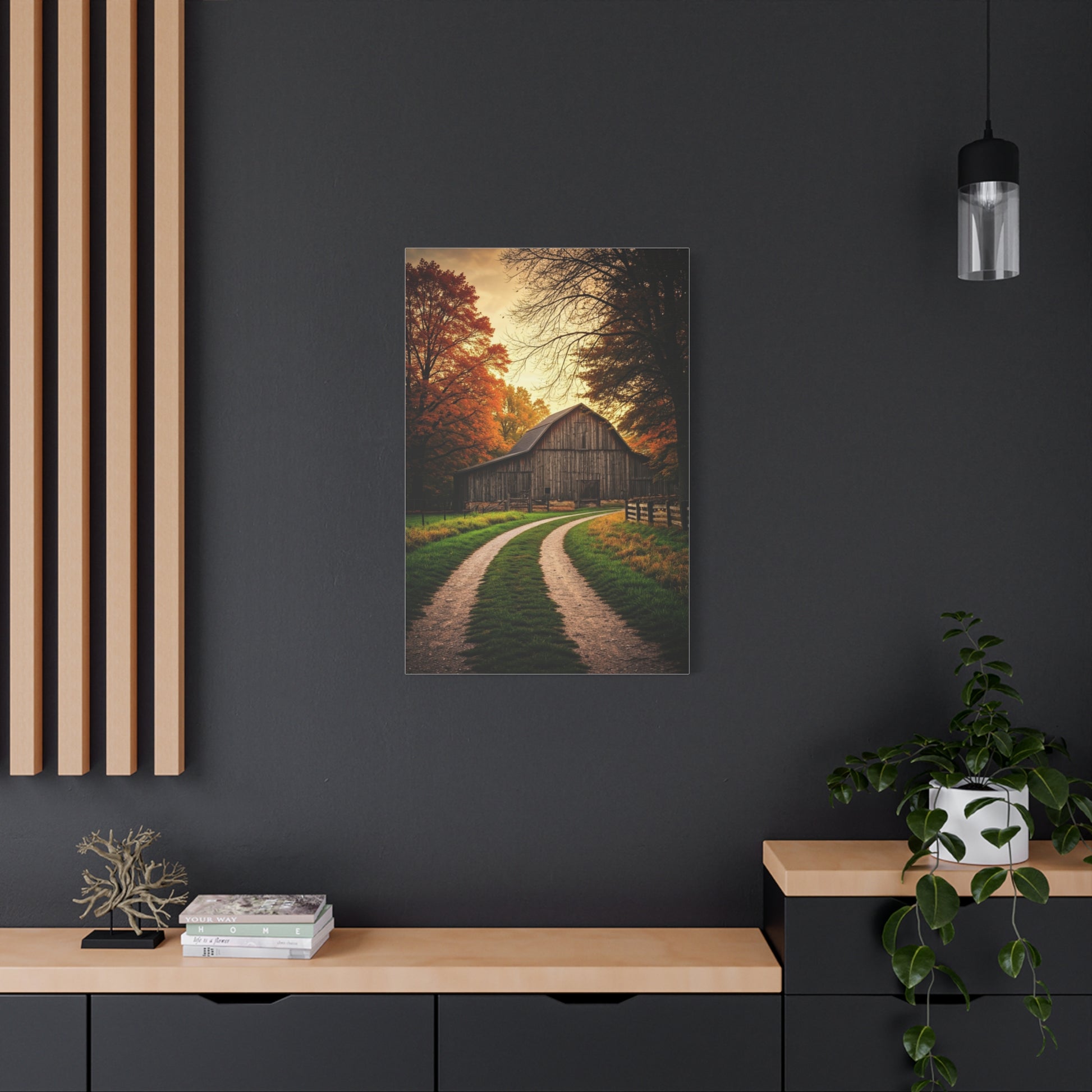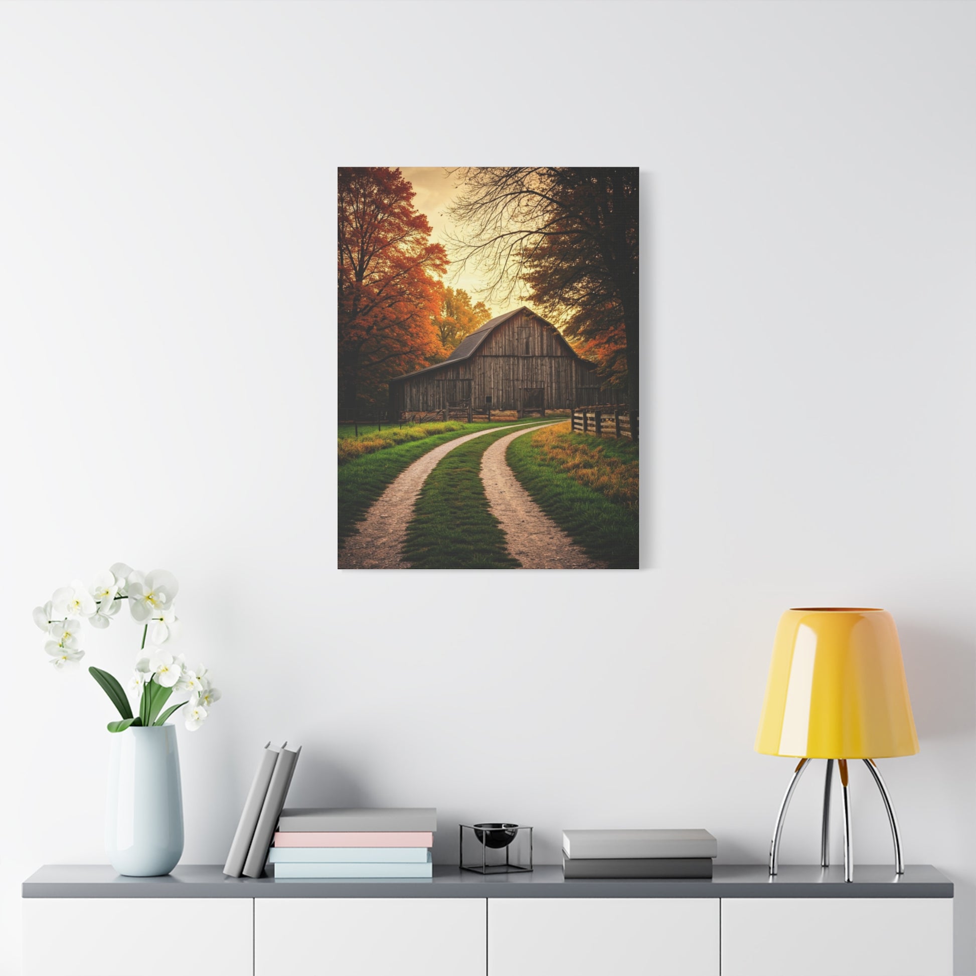 This peaceful countryside artwork features a rustic barn resting at the end of a winding dirt road, surrounded by glowing autumn trees under warm sunset light. The gentle curve of the path draws the viewer inward, creating a sense of journey, nostalgia, and rural calm. With rich seasonal tones and soft atmospheric lighting, this piece is perfect for farmhouse interiors, cozy living spaces, or anyone who loves timeless pastoral landscapes.