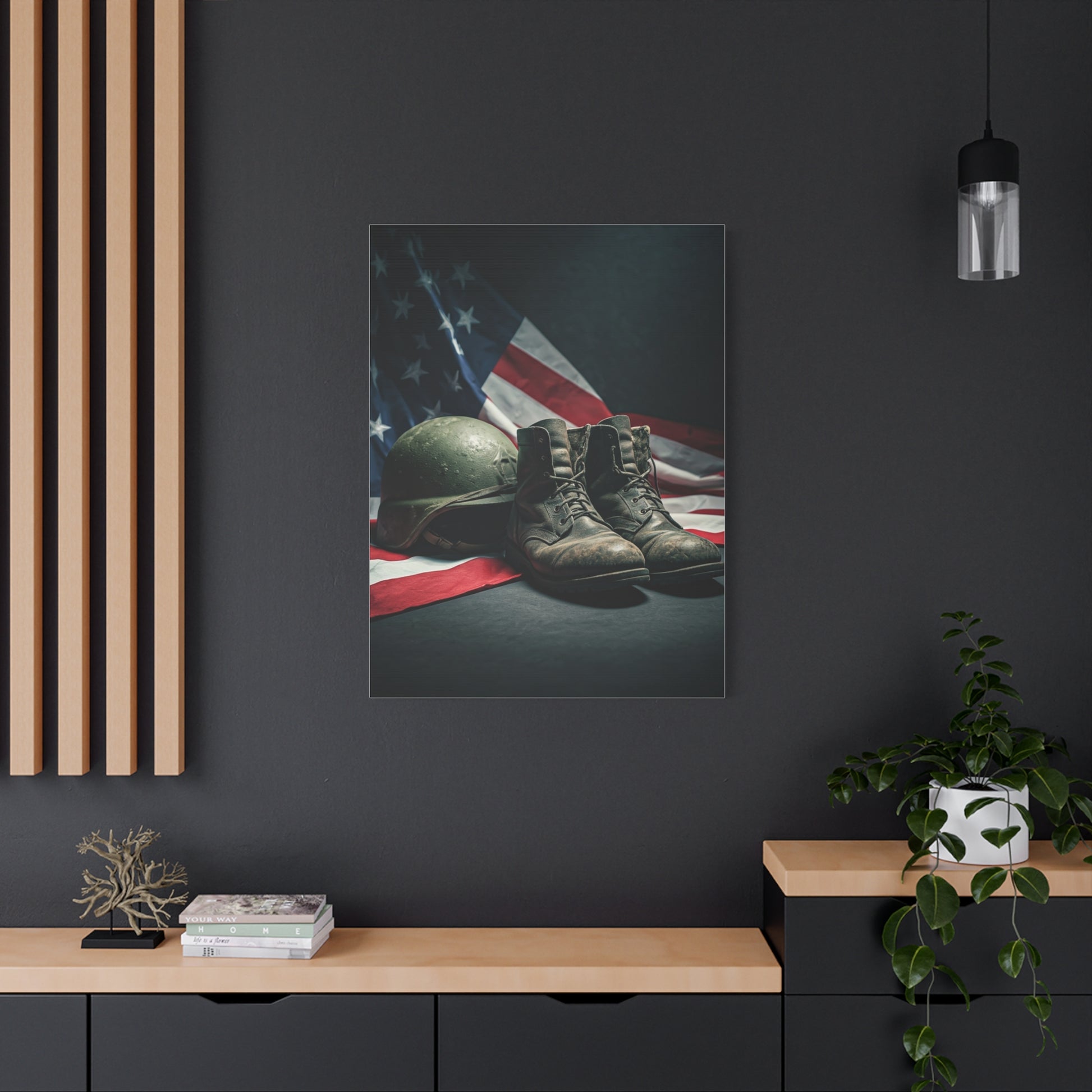 This solemn artwork captures a soldier’s helmet and boots set before the American flag, evoking themes of sacrifice, duty, and honor. Rich shadows and bold symbolism create a deeply respectful memorial piece perfect for veterans’ homes or commemorative décor.
