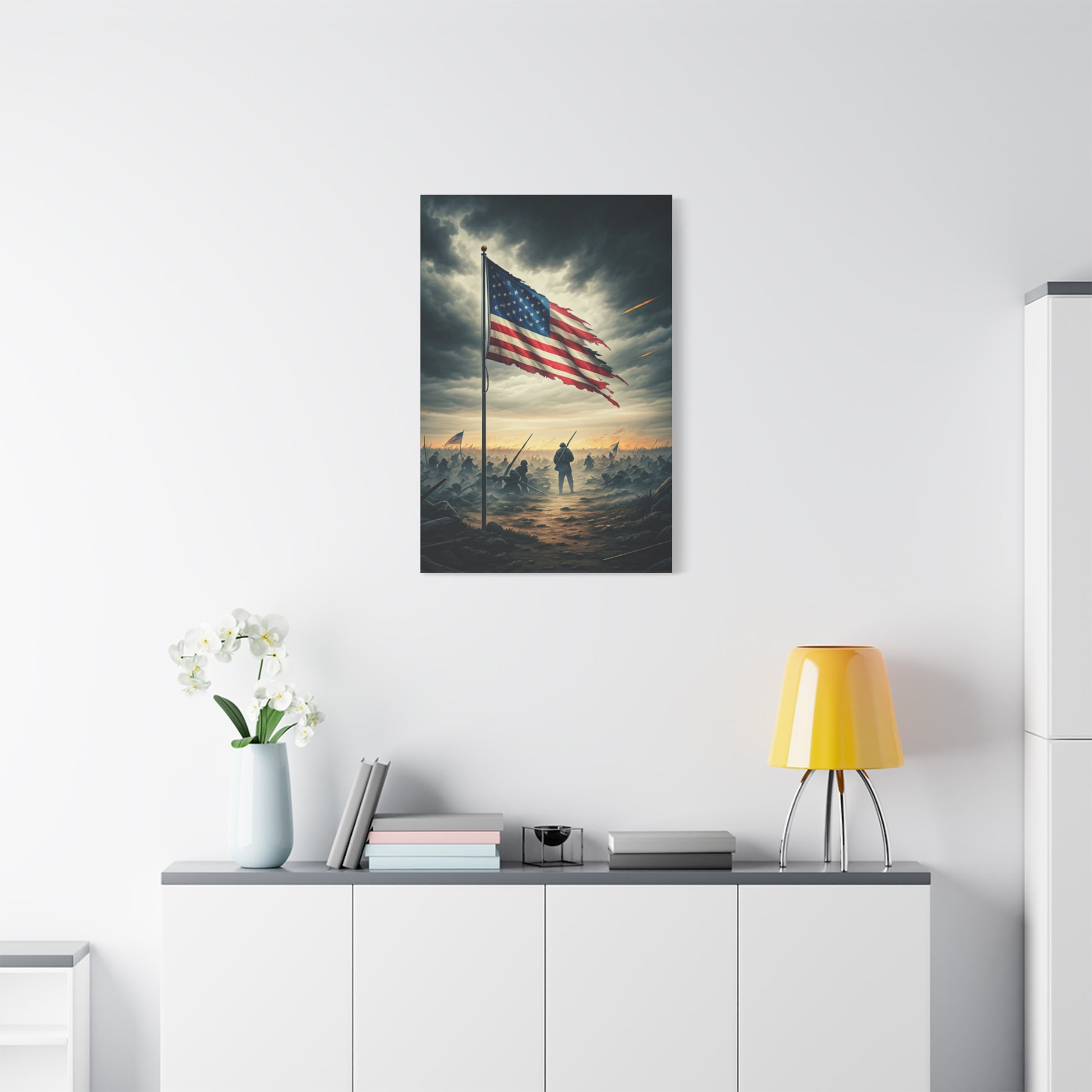 This emotional scene portrays the American flag standing tall over a distant soldier beneath a stormy sky, symbolizing courage, sacrifice, and remembrance. The powerful atmosphere makes this artwork ideal for tribute walls, veterans’ spaces, or patriotic home décor.