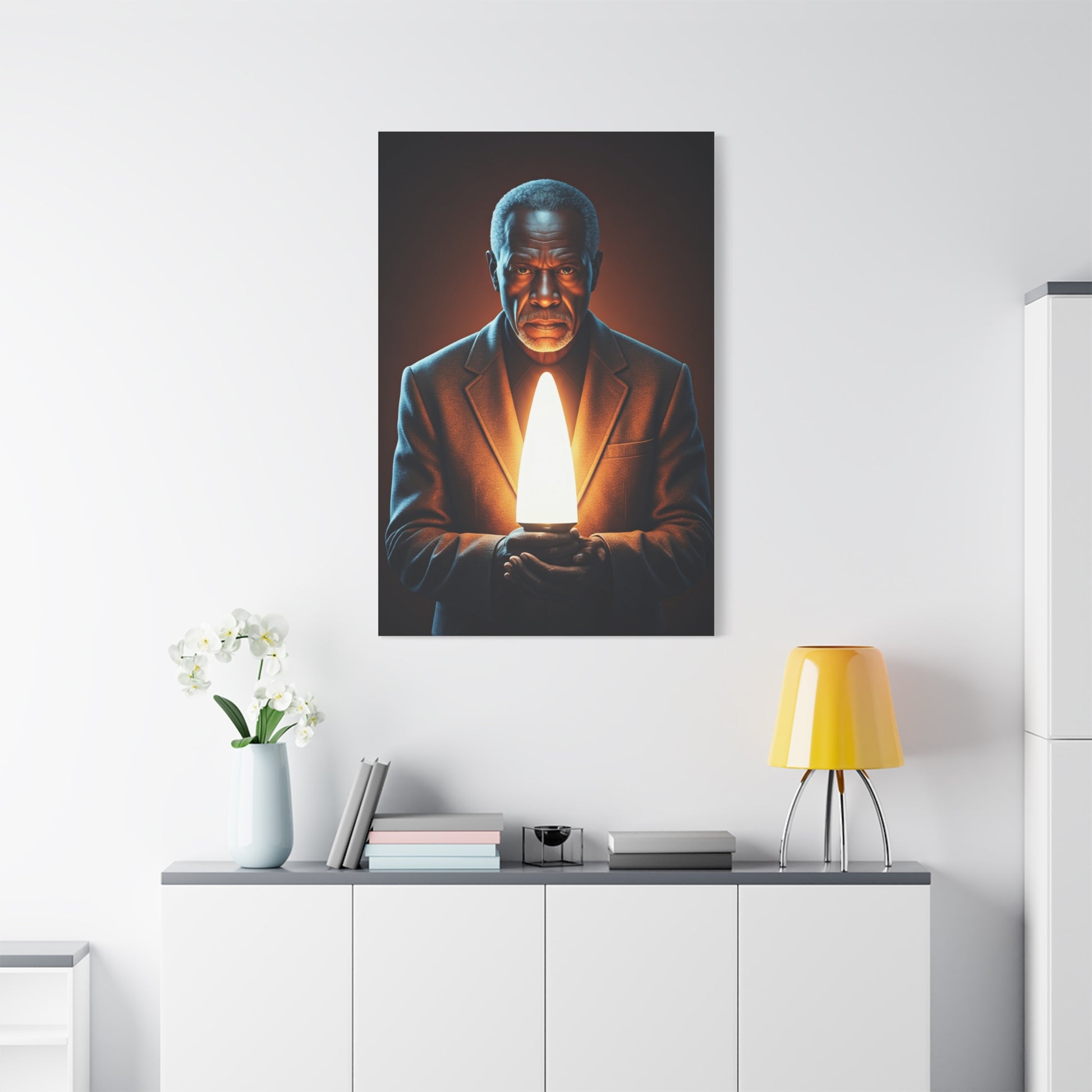 This striking artwork portrays an elder figure holding a radiant flame of light, symbolizing guidance, resilience, and timeless wisdom. The dramatic contrast between the warm glow and the deep surrounding shadows creates an intense, cinematic atmosphere that draws the viewer inward. His calm yet powerful expression reflects strength earned through experience, while the illuminated centerpiece represents hope, leadership, and the passing of knowledge through generations. The realistic detail and warm amber tones give this piece an emotional depth that feels both spiritual and modern. Perfect for meaningful interior spaces, this wall art serves as a bold statement of heritage, inspiration, and inner light.