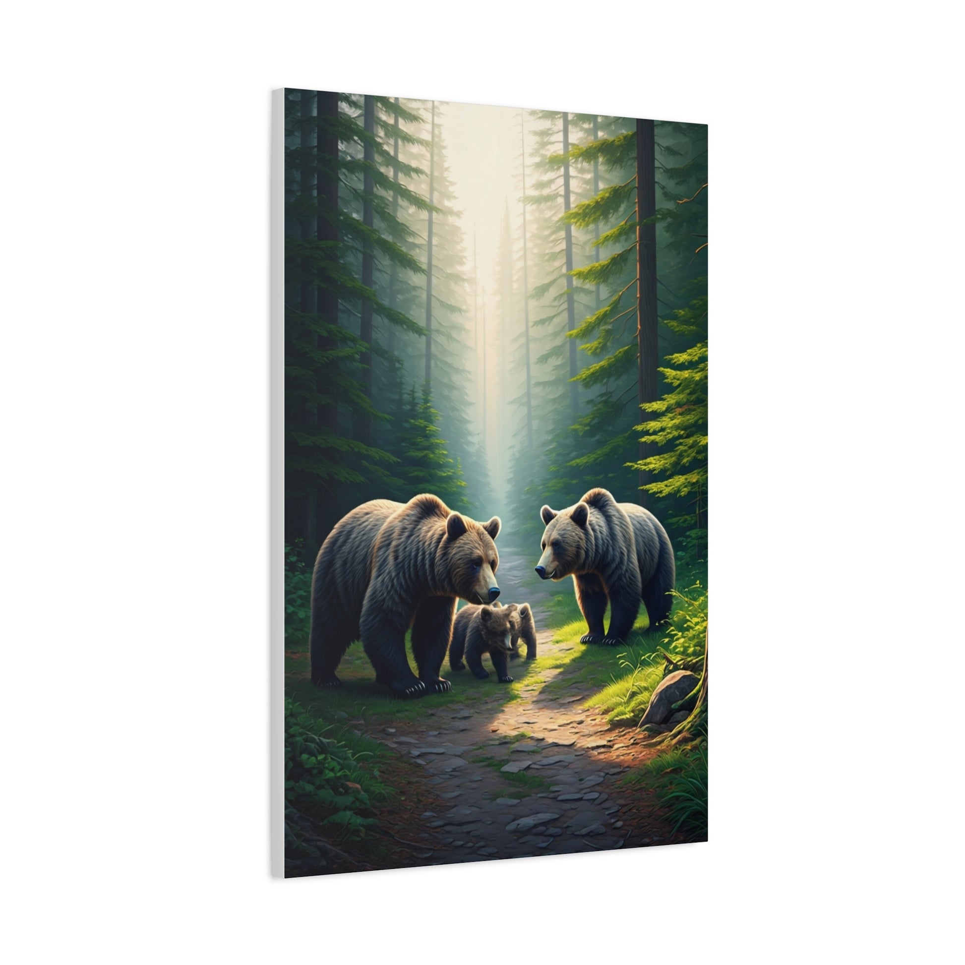 This serene canvas art print captures a family of bears walking peacefully along a sunlit forest path. Soft beams of light filter through towering trees, creating depth and warmth. The balanced composition reflects protection, unity, and the beauty of untouched wilderness. A meaningful centerpiece for rustic homes and nature-inspired interiors.