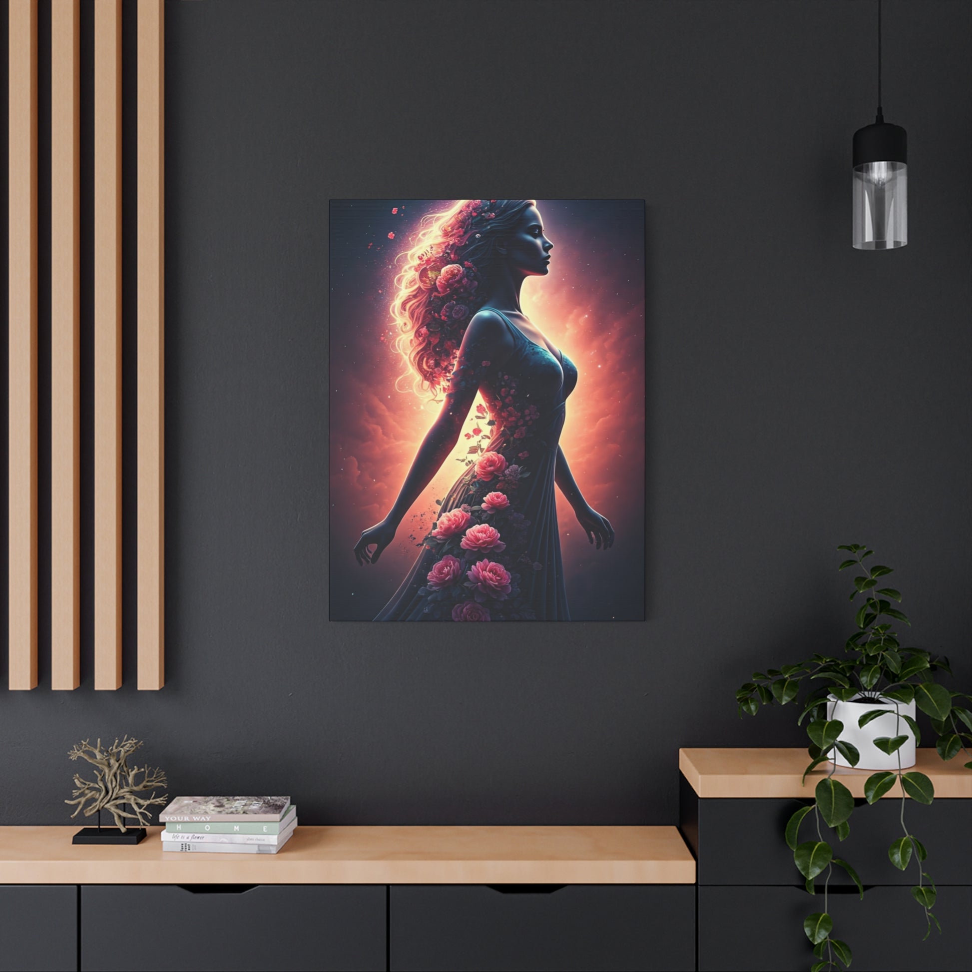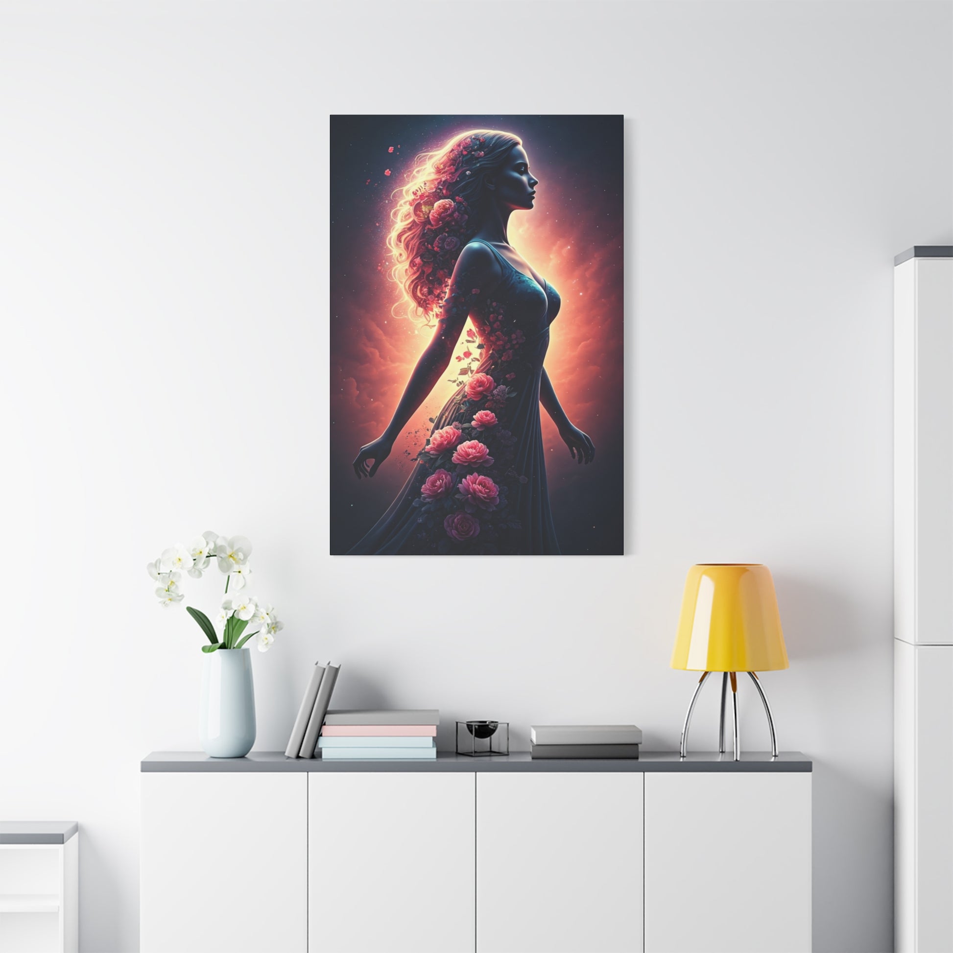 This powerful wall art presents a woman surrounded by flowing light and blooming flowers, symbolizing growth, confidence, and transformation. The dynamic pose and glowing floral accents create movement and emotional depth, blending strength with softness. The warm color palette and expressive design make this artwork both inspiring and visually striking. Perfect for modern homes, creative spaces, or statement walls, this canvas print celebrates feminine energy and artistic expression.