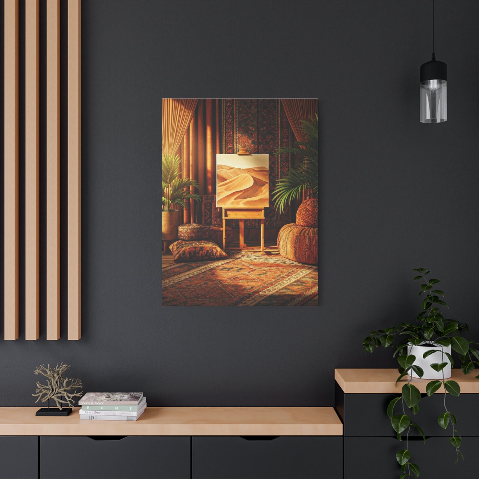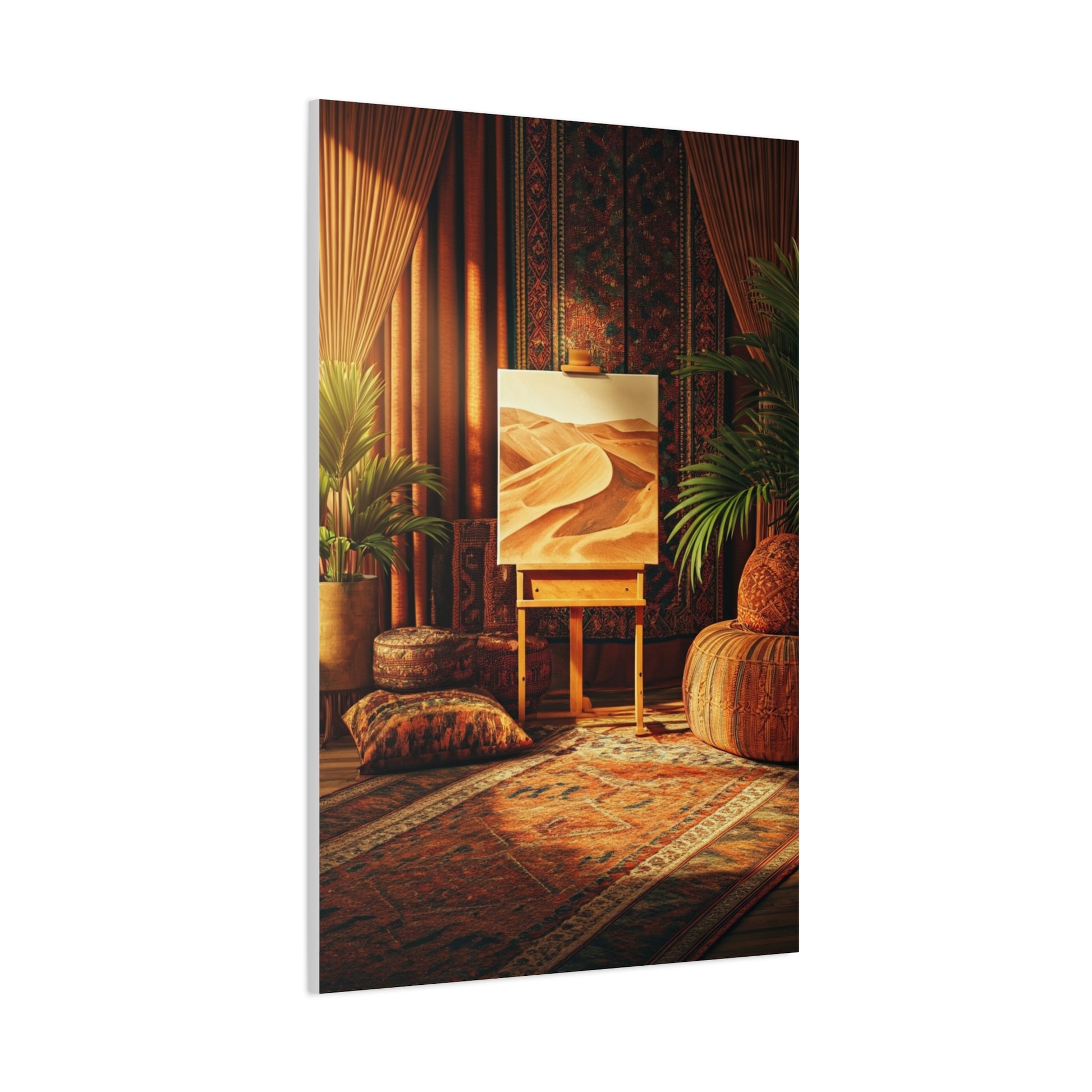 This warm, inviting artwork captures the essence of bohemian living through layered textiles, earthy tones, and a tranquil desert-inspired canvas on an easel. Rich rugs, woven cushions, and natural plants create a soulful interior that feels both artistic and grounded. The soft lighting enhances the textures and patterns, evoking creativity, calm, and cultural depth. Ideal for living rooms, studios, or meditation spaces, this piece brings handcrafted charm and timeless boho elegance into modern interiors. A perfect statement for lovers of art, travel, and earthy design aesthetics.