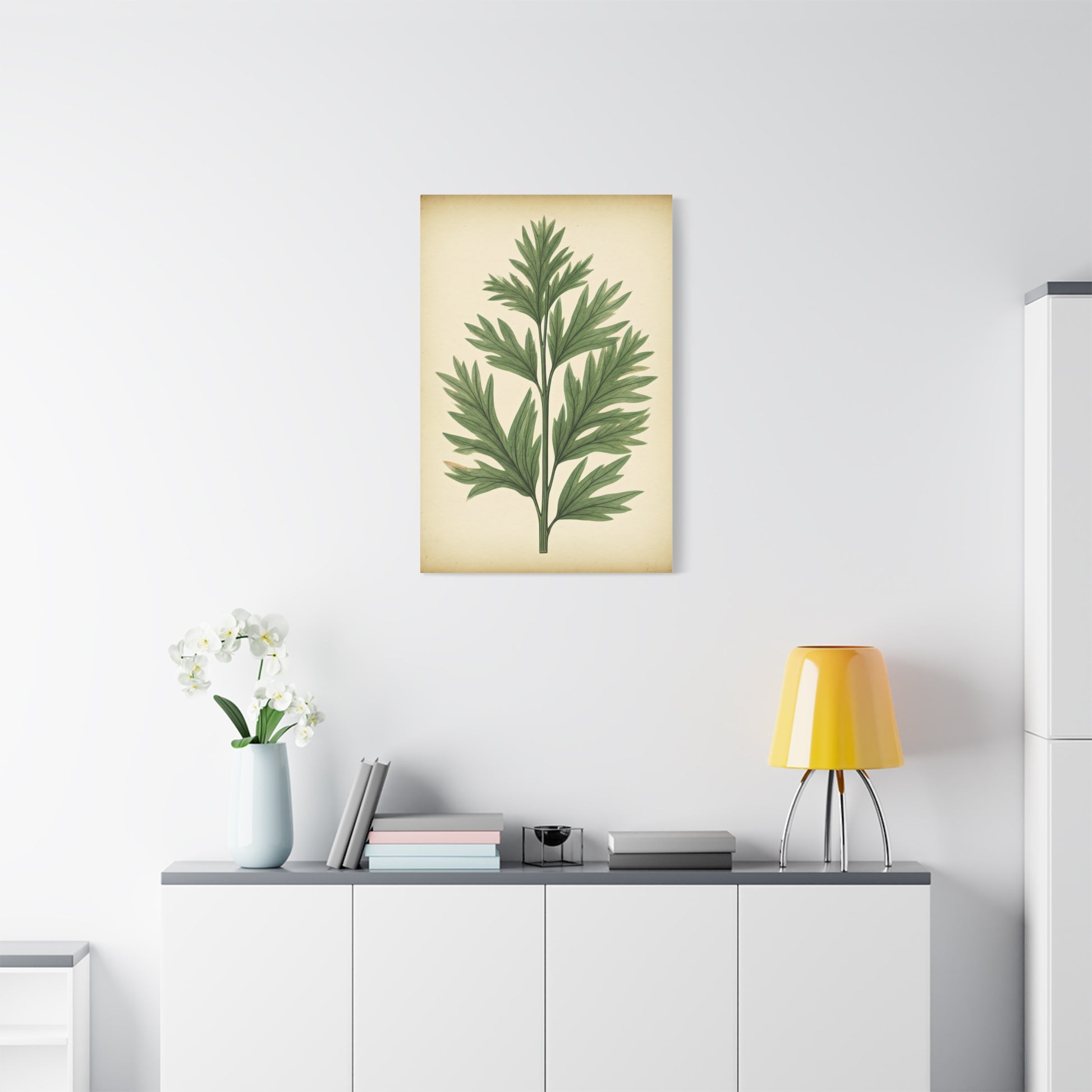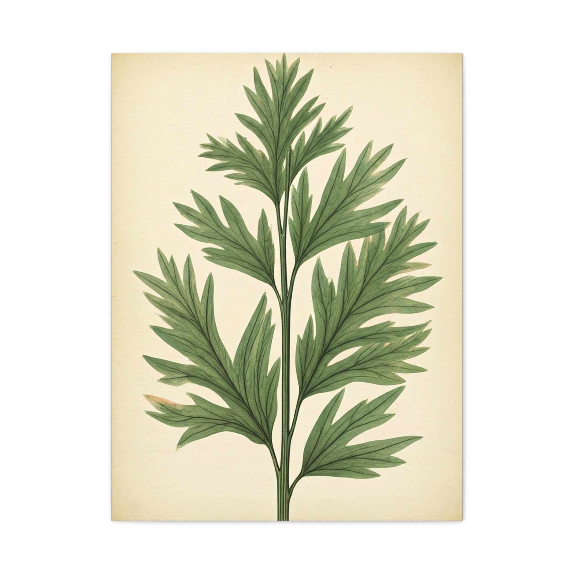 This elegant botanical artwork showcases a delicately illustrated herb specimen rendered in a classic scientific illustration style. Set against a warm parchment-toned background, the finely detailed green leaves and slender stem evoke the charm of antique botanical journals and natural history studies. The minimalist composition highlights organic symmetry and natural beauty, creating a calming and refined aesthetic. Perfect for kitchens, dining areas, studios, or nature-inspired interiors, this timeless piece brings subtle vintage sophistication and a sense of botanical serenity to any space.