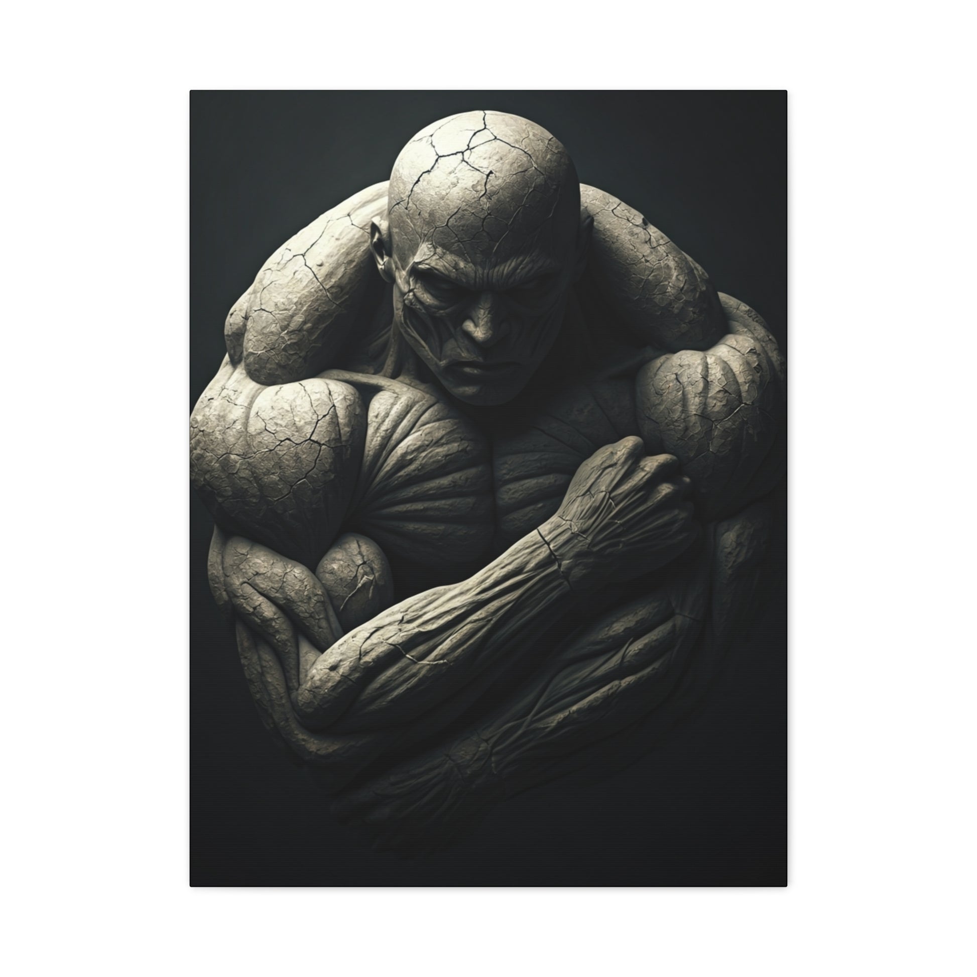 This striking sculpture-like figure appears carved from stone, arms wrapped tightly around itself in a moment of intense introspection. The cracked textures and heavy musculature convey emotional weight, resilience, and inner struggle. The dark, minimal background allows the form to command attention, making the artwork both raw and profound. A compelling piece for modern, minimalist, or monochrome interiors, it represents endurance, self-reflection, and the quiet strength required to carry one’s own burdens.