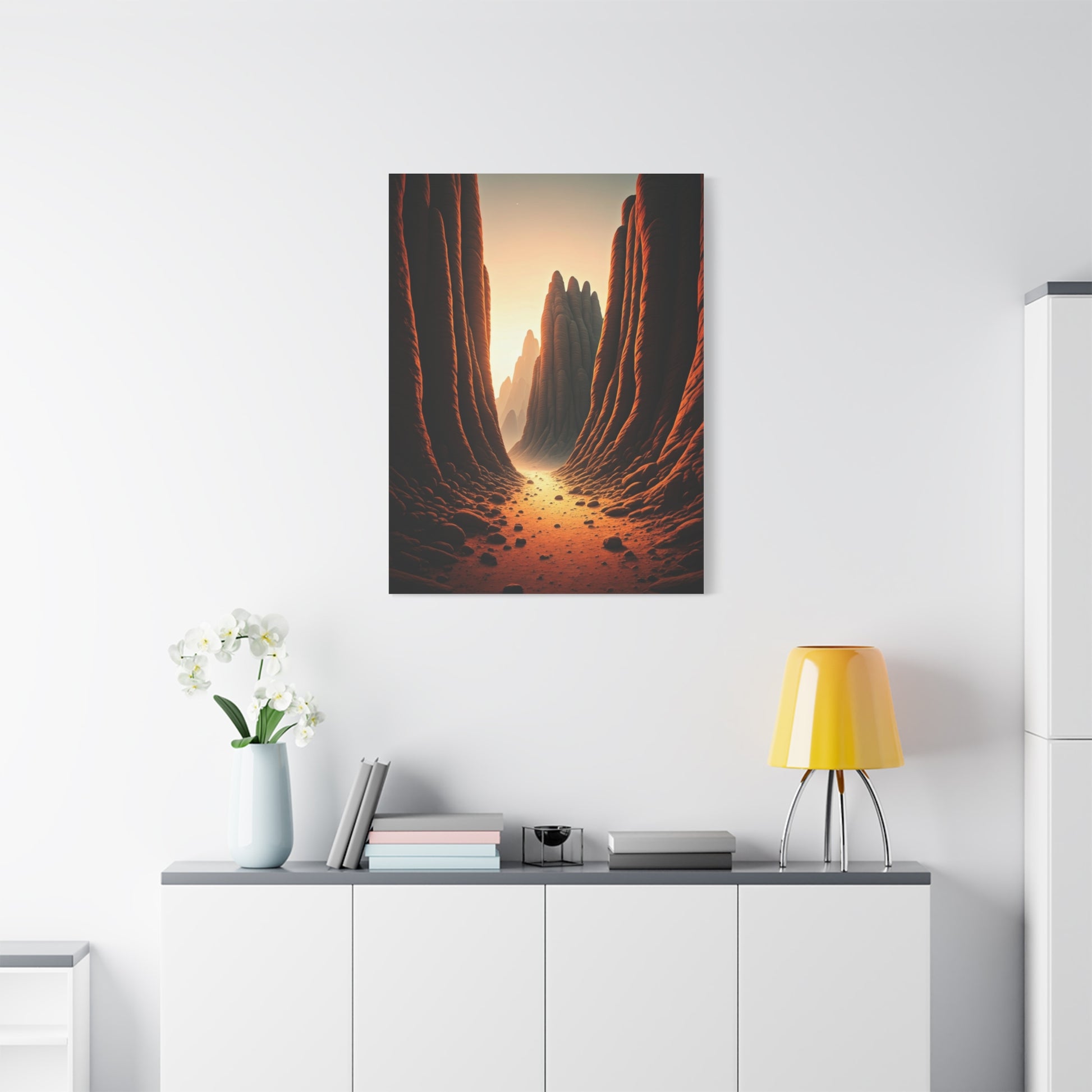 This dramatic landscape reveals a glowing pathway cutting through towering canyon walls, symbolizing adventure, discovery, and the journey forward. Warm sunlight pours into the scene, creating cinematic depth and atmosphere. Ideal for statement walls, modern décor, or nature-inspired interiors.