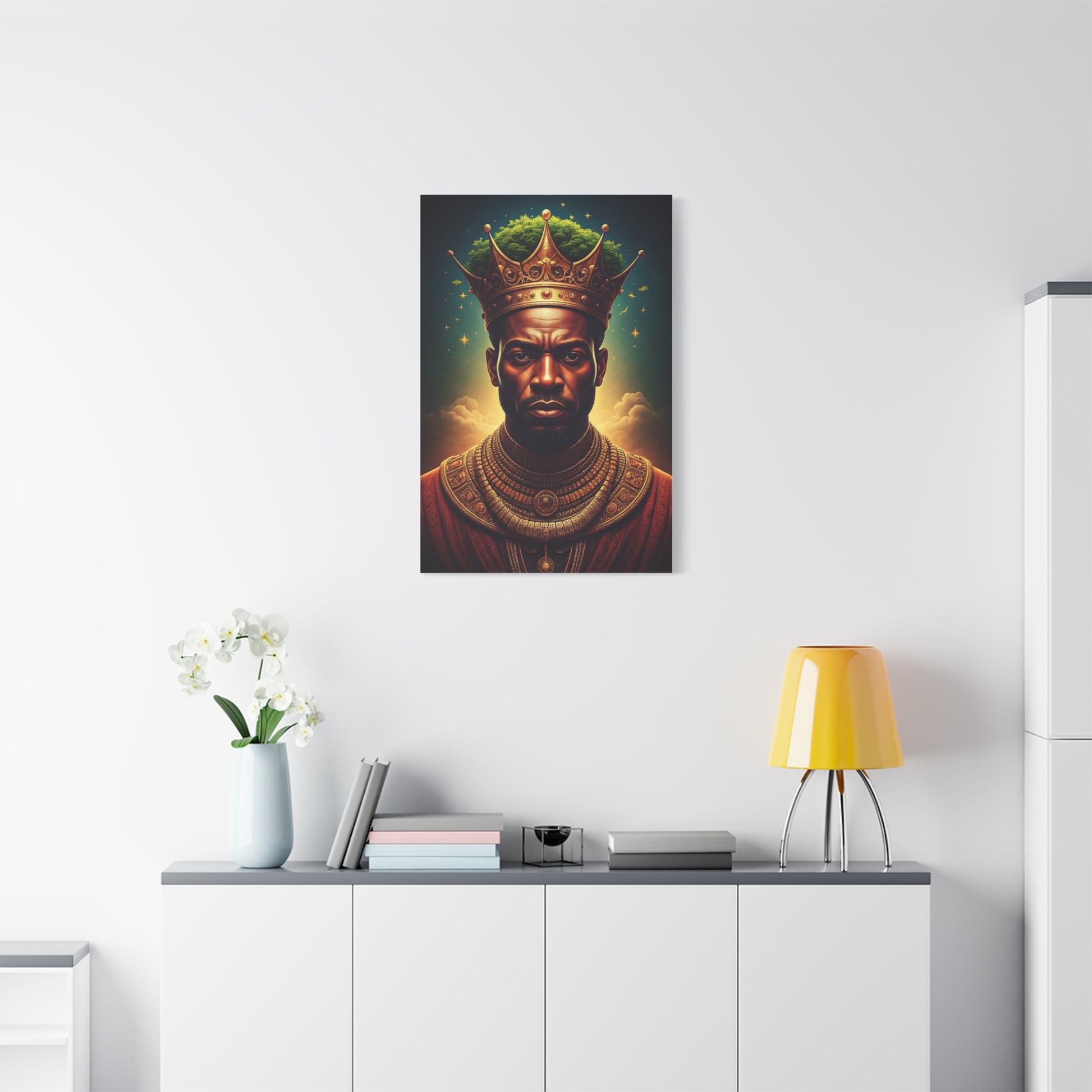 Radiating power and divine presence, this breathtaking artwork portrays an African king crowned beneath a celestial sky of stars and glowing light. The ornate golden crown rises with majestic elegance, symbolizing authority, destiny, and leadership beyond time. Rich ceremonial jewelry and detailed royal attire enhance the sense of heritage and grandeur, while the luminous background creates an almost spiritual atmosphere. This portrait is a celebration of strength, culture, and royal legacy, making it an unforgettable statement piece for living rooms, offices, or luxury interiors. Perfect for those drawn to Afrocentric art, regal symbolism, and bold modern décor with timeless meaning.