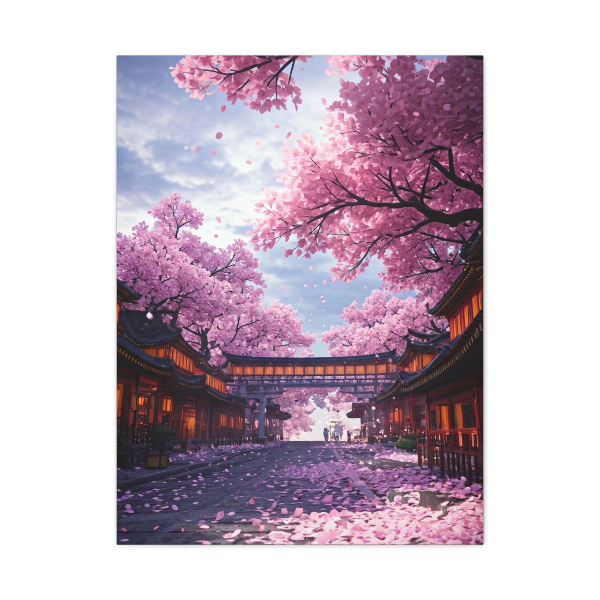 This enchanting artwork captures a tranquil street lined with traditional architecture beneath blooming cherry blossom trees, as soft pink petals drift gently through the air. The warm glow from the buildings contrasts beautifully with the cool sky, creating a peaceful and romantic atmosphere that feels both timeless and immersive. Perfect for adding elegance and calm to living rooms, bedrooms, or creative spaces, this canvas print brings a sense of serenity, cultural charm, and natural beauty into any interior.