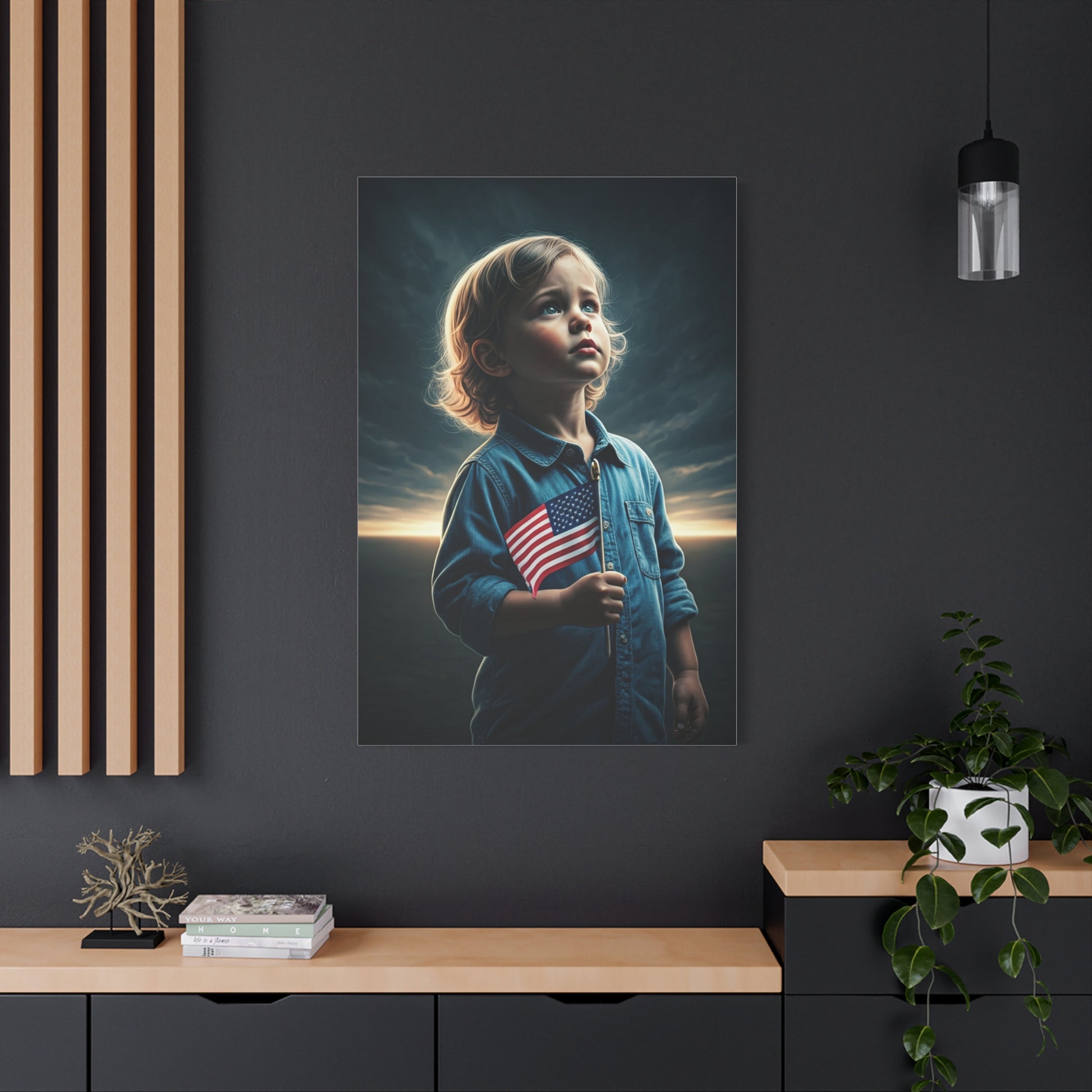 This touching piece captures a young child holding the American flag with a look of hope and innocence. Representing future generations, pride, and the promise of freedom, it makes a heartfelt addition to any patriotic home, office, or memorial space.