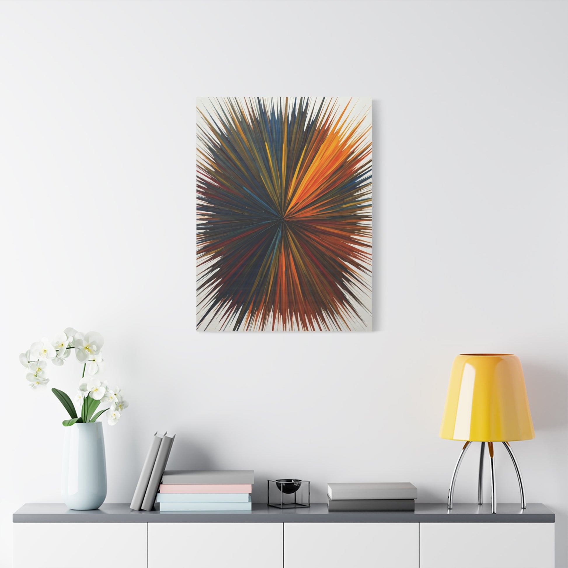 Chromatic Energy Convergence combines gold, blue, red, and deep charcoal spikes in a dynamic radial explosion. The layered colour palette and balanced symmetry convey movement and creativity, making this piece perfect for bold interiors and contemporary art collections.