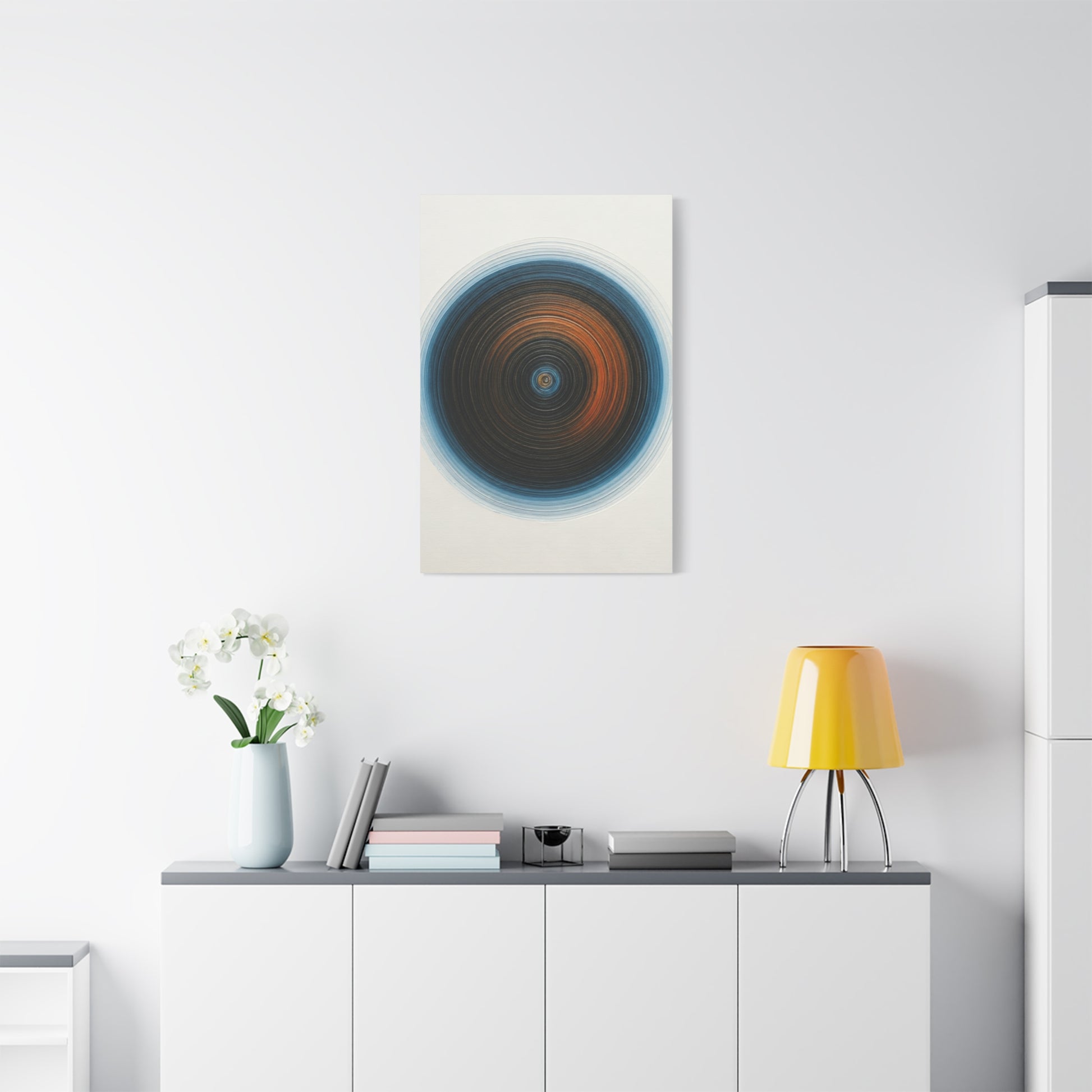 This captivating abstract piece features layered circular forms in deep blue and warm amber tones, drawing the eye inward toward a calm, centered focal point. The smooth radial motion creates a sense of balance and contemplation. Ideal for modern interiors, this artwork adds depth, harmony, and a sophisticated artistic finish.