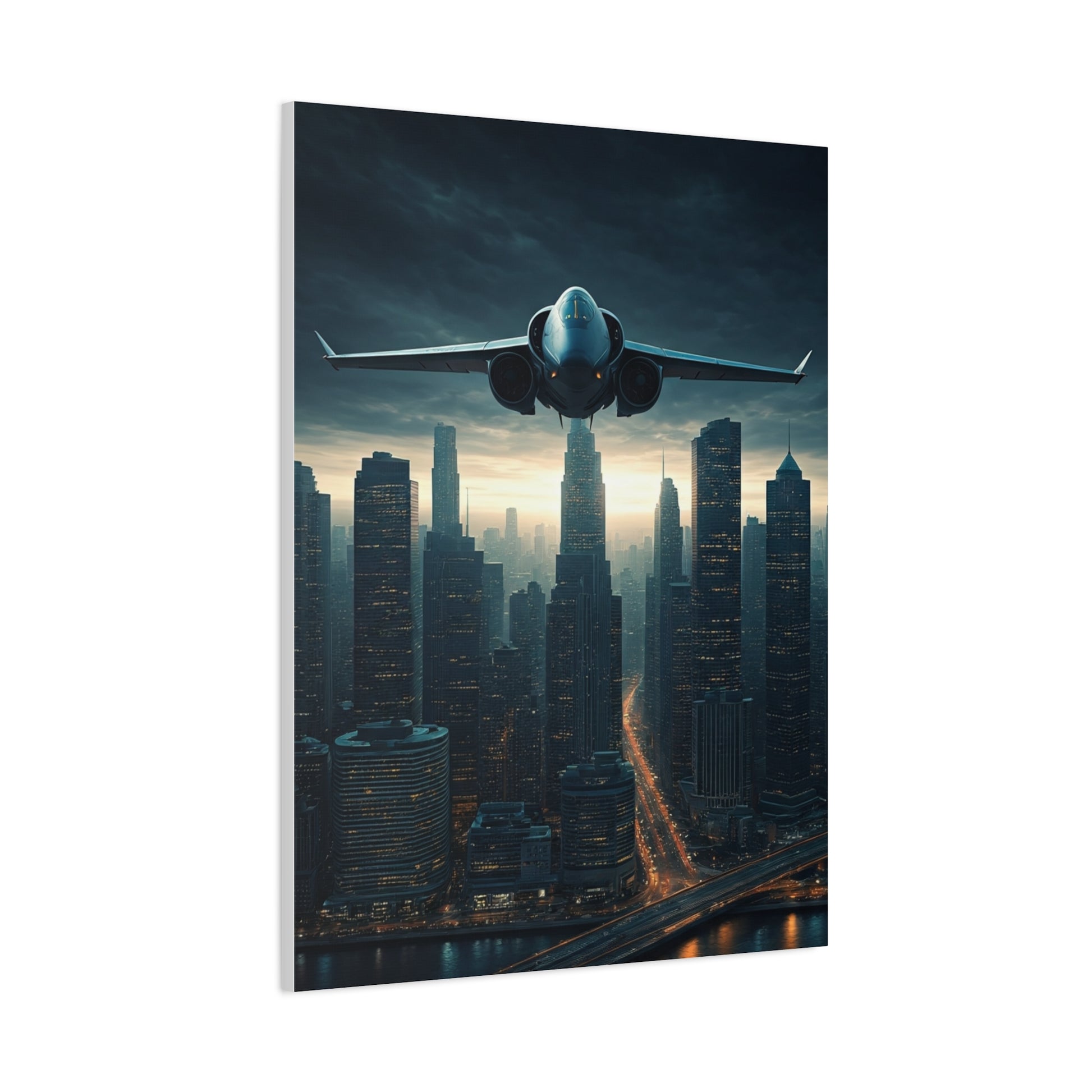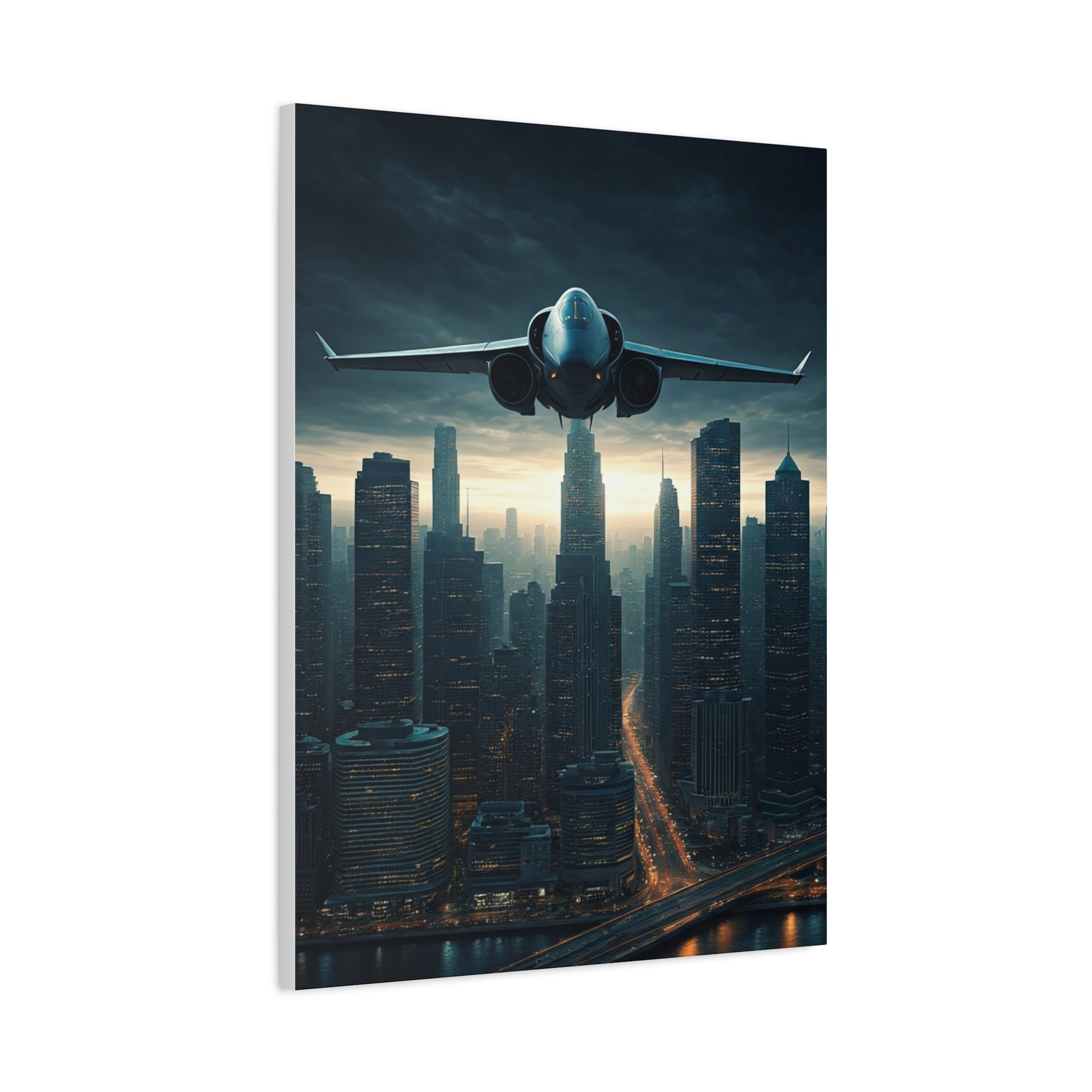 Flying above towering skyscrapers, this dramatic aviation scene blends futuristic energy with the modern beauty of an illuminated cityscape. The aircraft dominates the skyline, symbolizing innovation, strength, and the excitement of urban exploration. Moody lighting and detailed architecture create a powerful contrast that draws the viewer into the moment. Perfect for modern offices, living rooms, or travel-inspired décor, this artwork brings a bold metropolitan spirit into any space.
