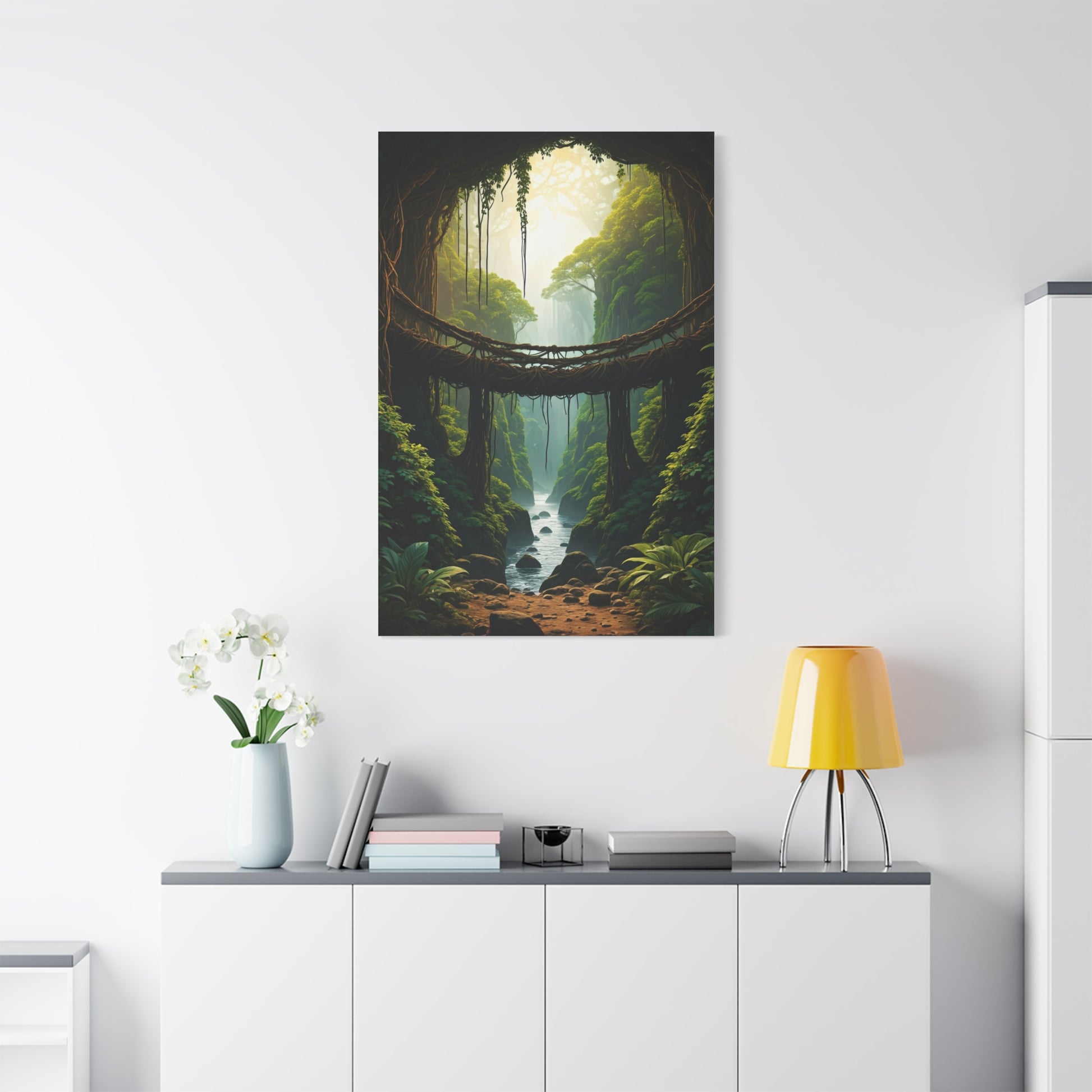 This lush forest artwork showcases a hidden bridge surrounded by glowing greenery and cascading light, evoking wonder, escape, and natural serenity. The rich depth and magical atmosphere make it an inspiring centerpiece for any modern or nature-inspired room.