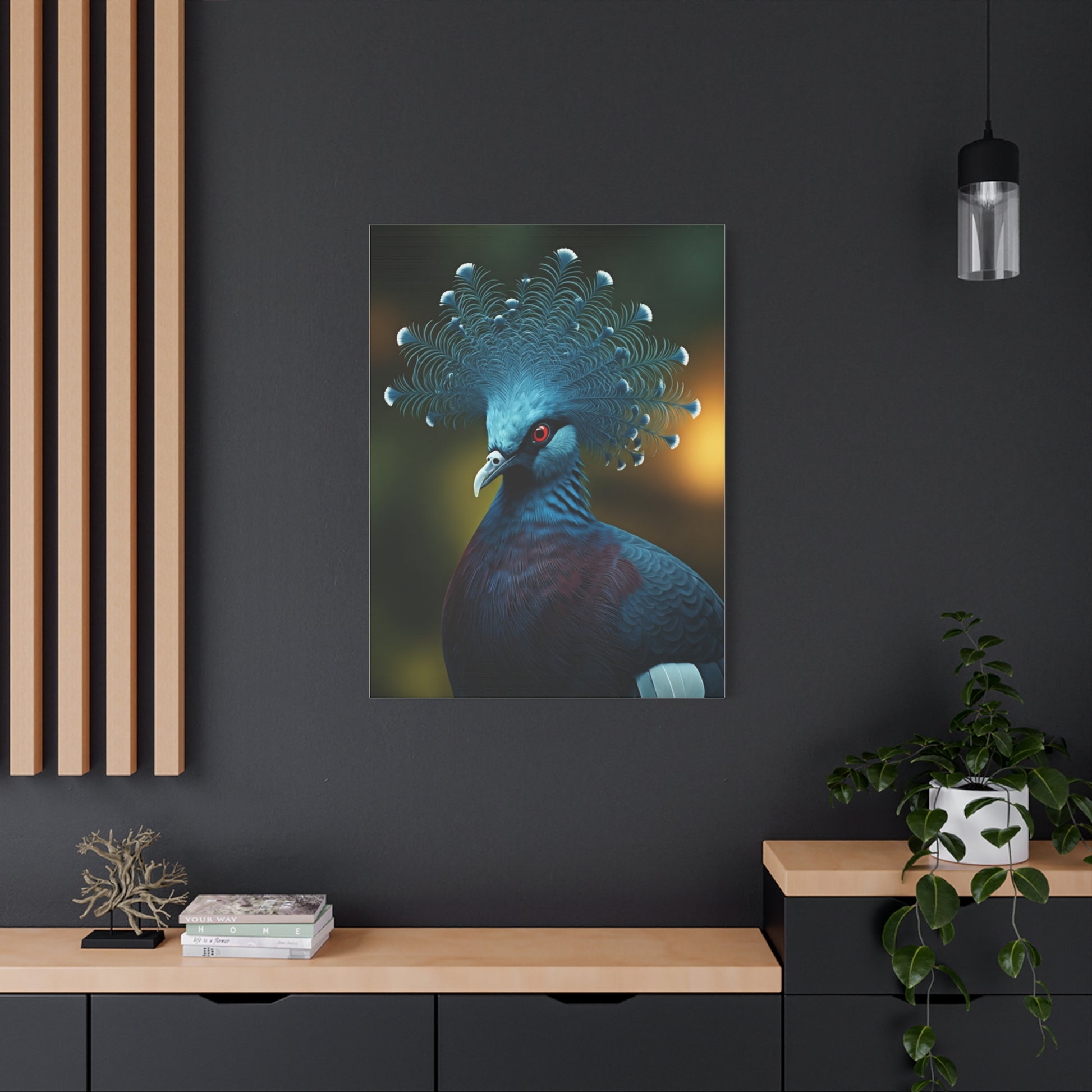This striking artwork features a dramatic bird adorned with an intricate, crown-like feathered crest that radiates outward in stunning detail. The unique plumage and soft bokeh background create depth and artistic contrast. Its bold presence and refined textures make it a captivating focal point. Ideal for contemporary homes, luxury interiors, or eclectic décor styles. This canvas adds personality, elegance, and a sense of rare wildlife wonder to your walls.