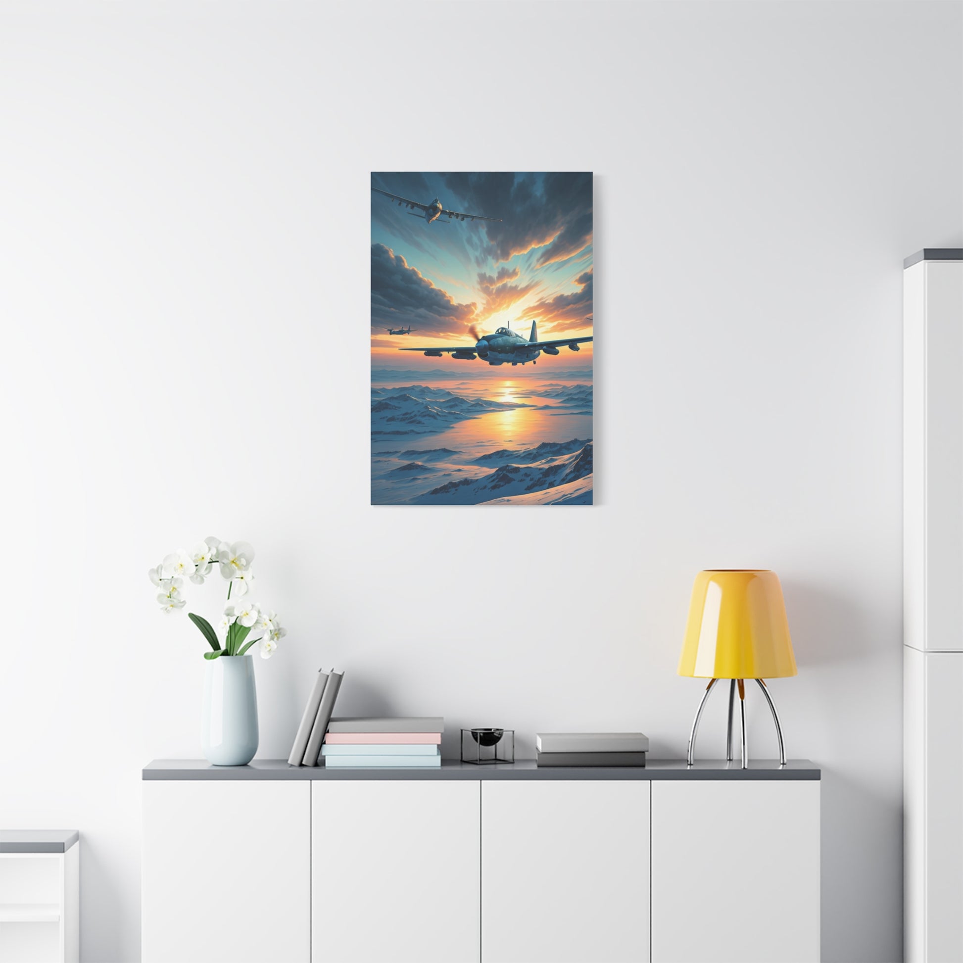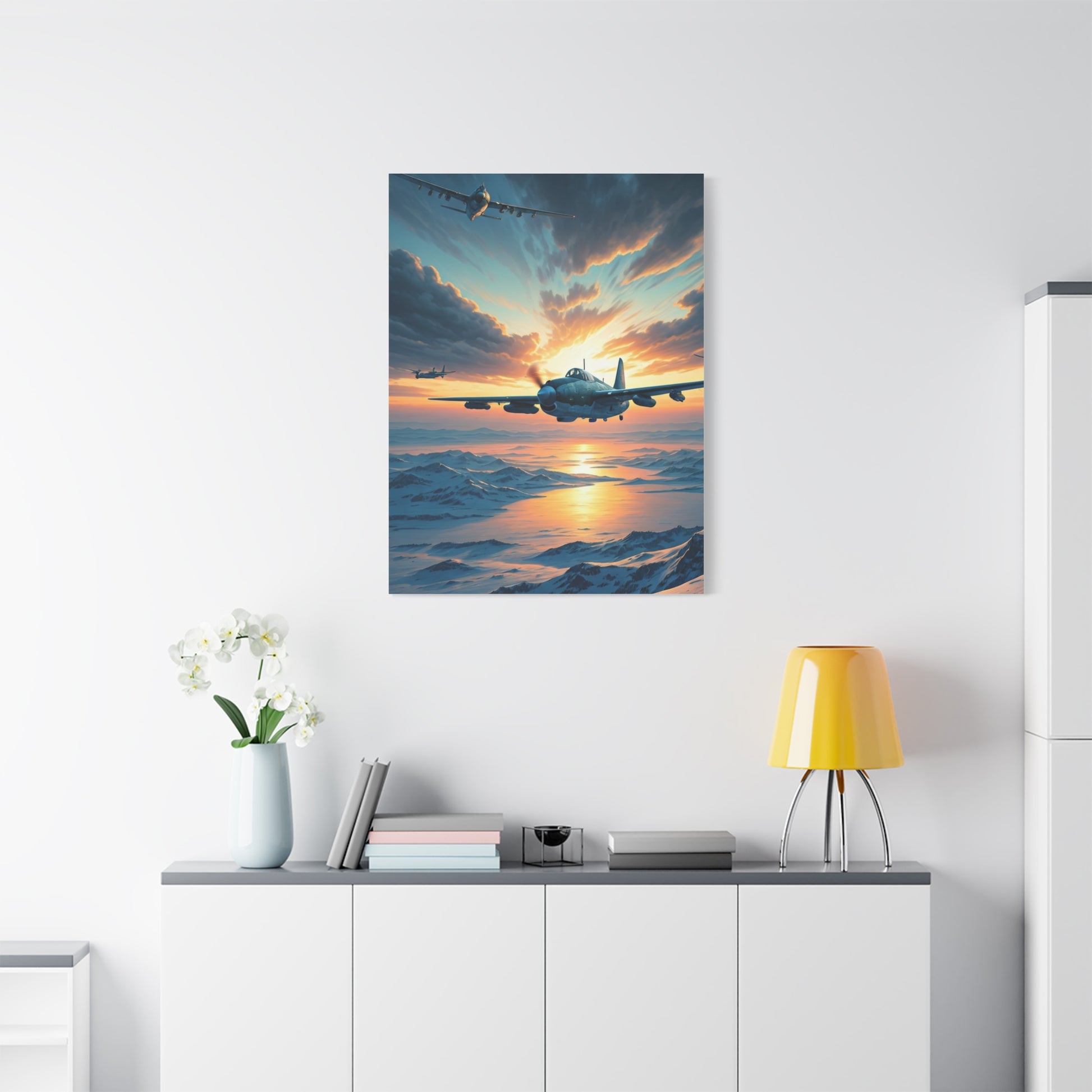 This inspiring wall art captures a sleek aircraft emerging into the sunrise above glowing cloud layers, symbolizing progress, hope, and limitless horizons. The vivid light and peaceful power make it a stunning centerpiece for modern interiors and aviation lovers.