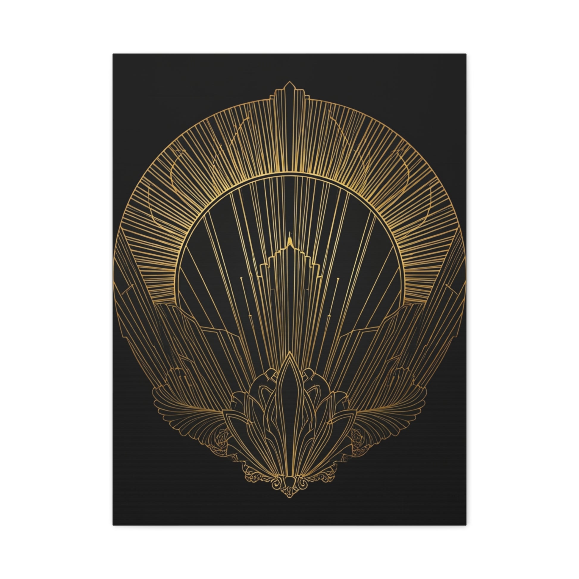 A luminous circular Art Deco emblem radiates outward with intricate golden linework and ornamental detailing. This piece combines vintage luxury with modern minimalism, creating a powerful centerpiece for stylish contemporary interiors.
