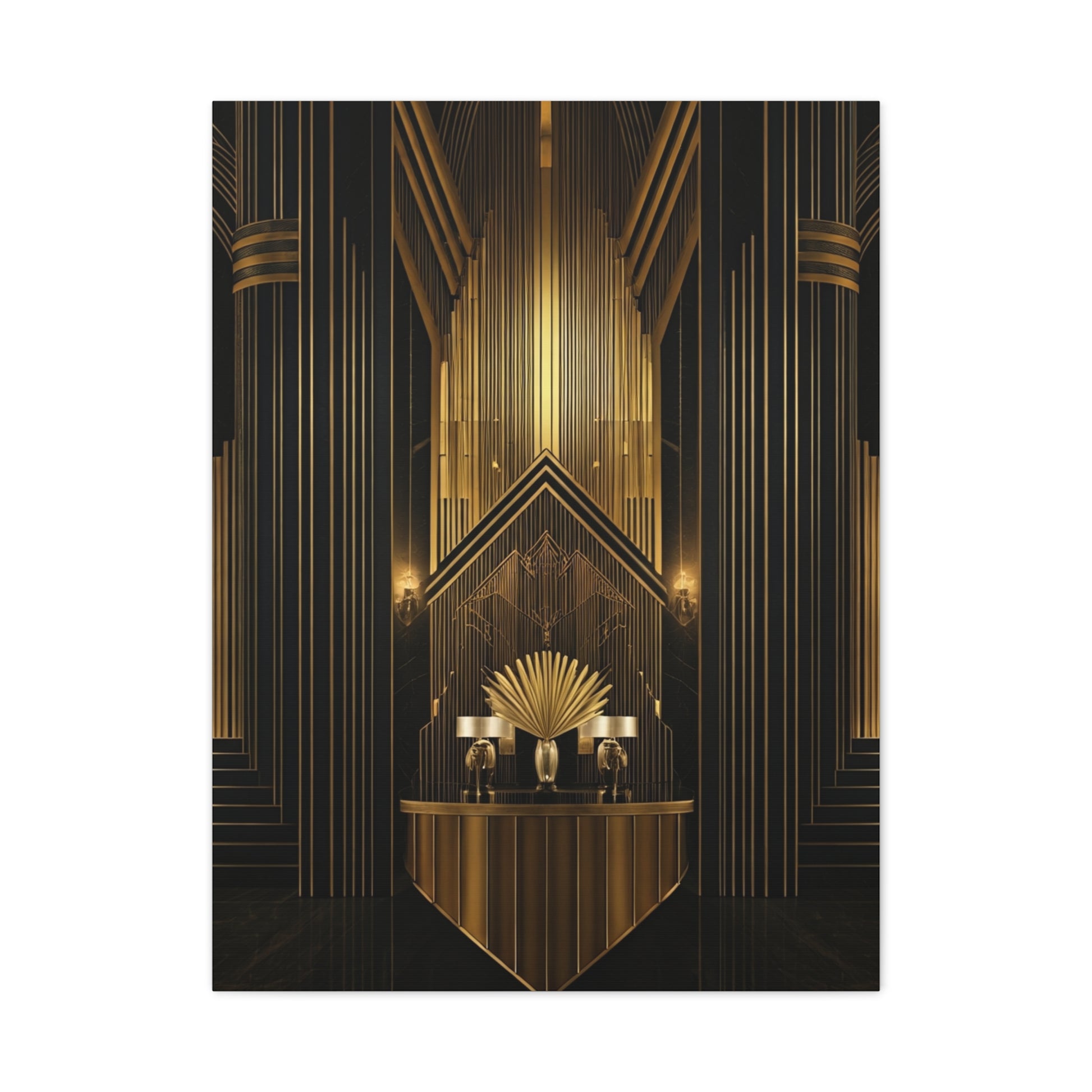This breathtaking Art Deco interior scene captures the atmosphere of a grand golden lobby filled with towering vertical lines, warm lighting, and luxurious symmetry. With its refined geometric structure and cinematic elegance, this artwork evokes the glamour of vintage hotels and jazz-age sophistication. Perfect for upscale décor, modern luxury spaces, or anyone seeking bold architectural statement art.