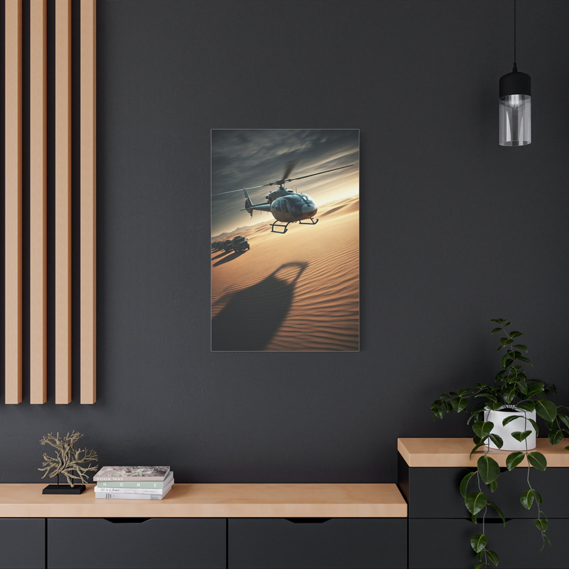This dynamic aviation scene captures a helicopter flying low over golden desert dunes, accompanied by vehicles below, evoking the intensity of exploration and mission-driven adventure. The sweeping motion, dramatic shadows, and cinematic landscape create a bold and powerful composition, ideal for modern interiors, masculine spaces, or anyone drawn to action, travel, and the spirit of discovery.