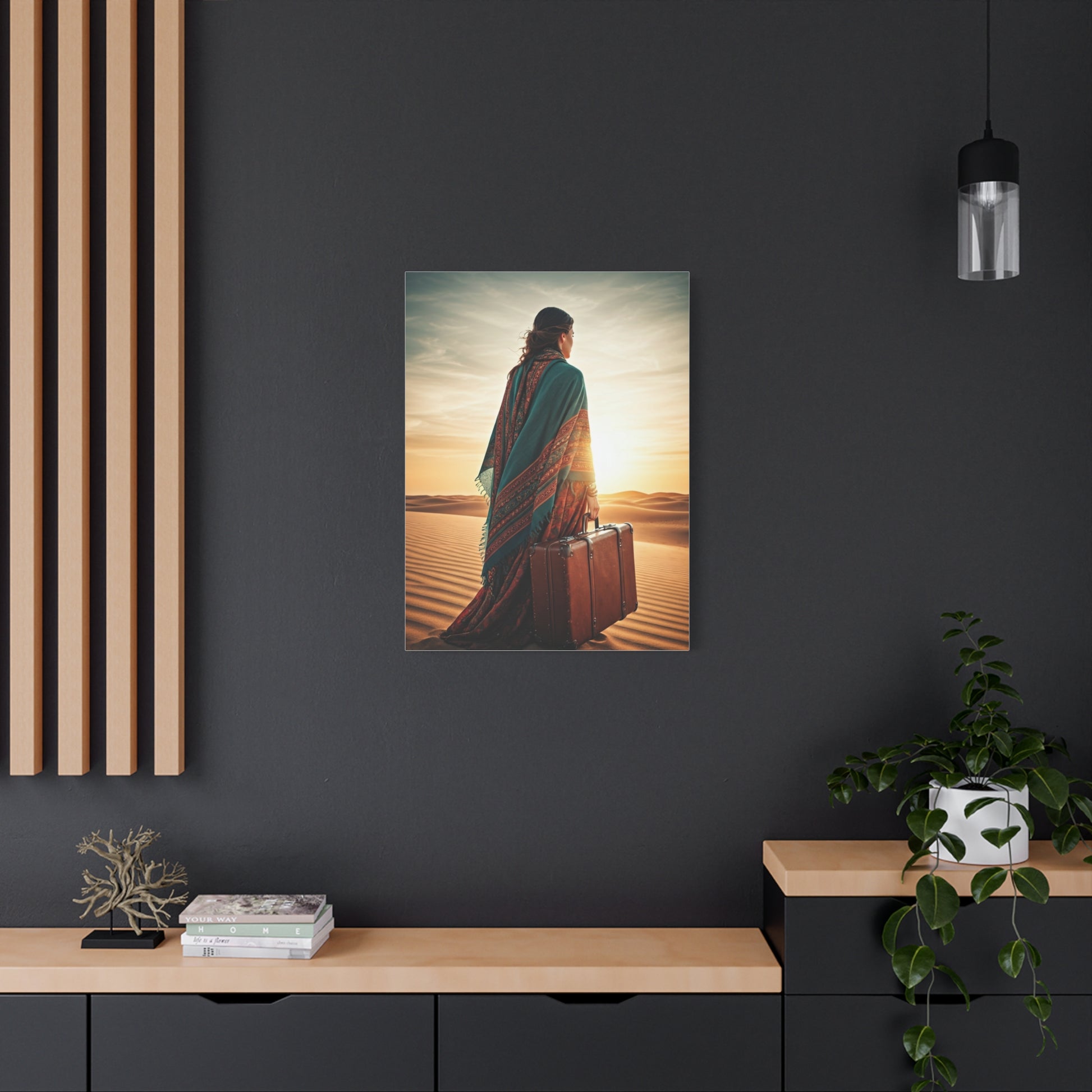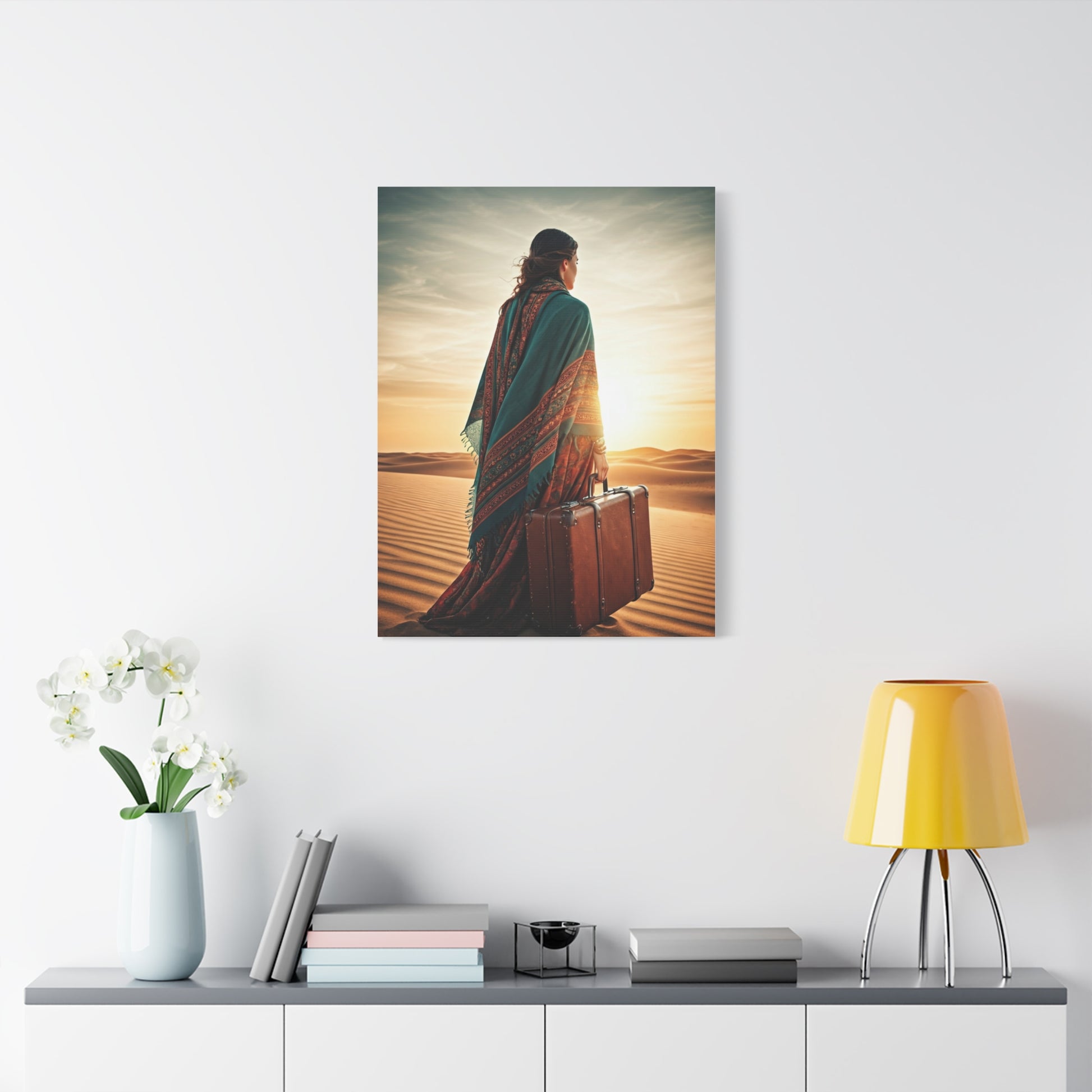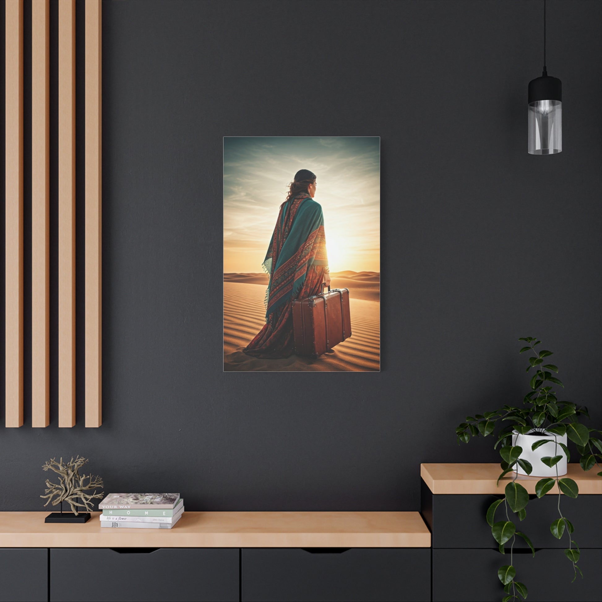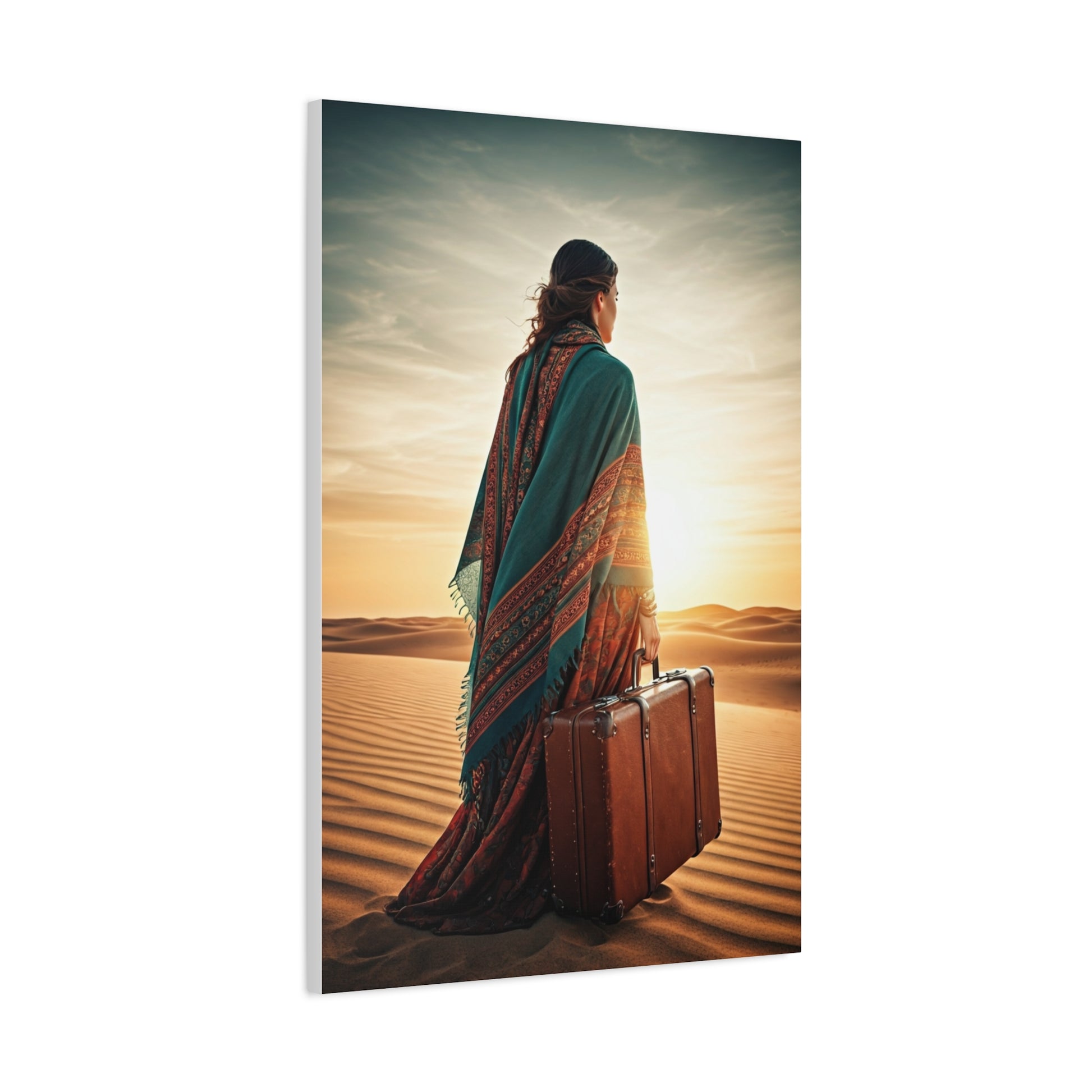 This bohemian artwork captures a lone traveler standing in vast desert dunes, suitcase in hand, facing a glowing horizon. The flowing shawl, earthy textures, and soft sunset tones evoke freedom, self-discovery, and soulful wandering. Every detail reflects a nomadic spirit and timeless adventure. Ideal for boho interiors, travel-inspired spaces, or homes that celebrate independence and inner journeys. This piece adds warmth, depth, and storytelling to any wall.