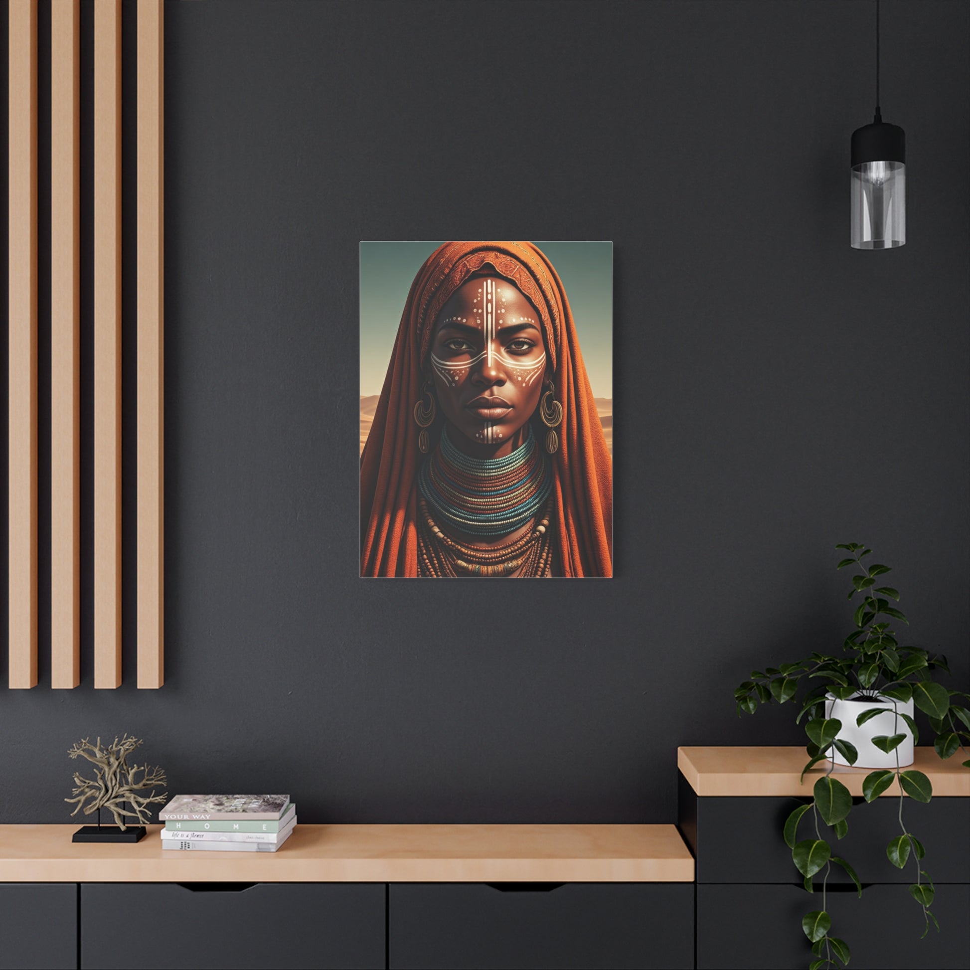 A powerful and serene portrait reflecting ancestral strength, spiritual identity, and cultural pride. The detailed face markings, layered beadwork, and flowing fabric symbolize deep-rooted traditions and connection to the land. Warm desert hues and soft lighting enhance the emotional depth of the composition. This artwork creates a bold yet soulful focal point, perfect for bohemian, earthy, or eclectic décor styles. It radiates dignity, resilience, and timeless beauty.
