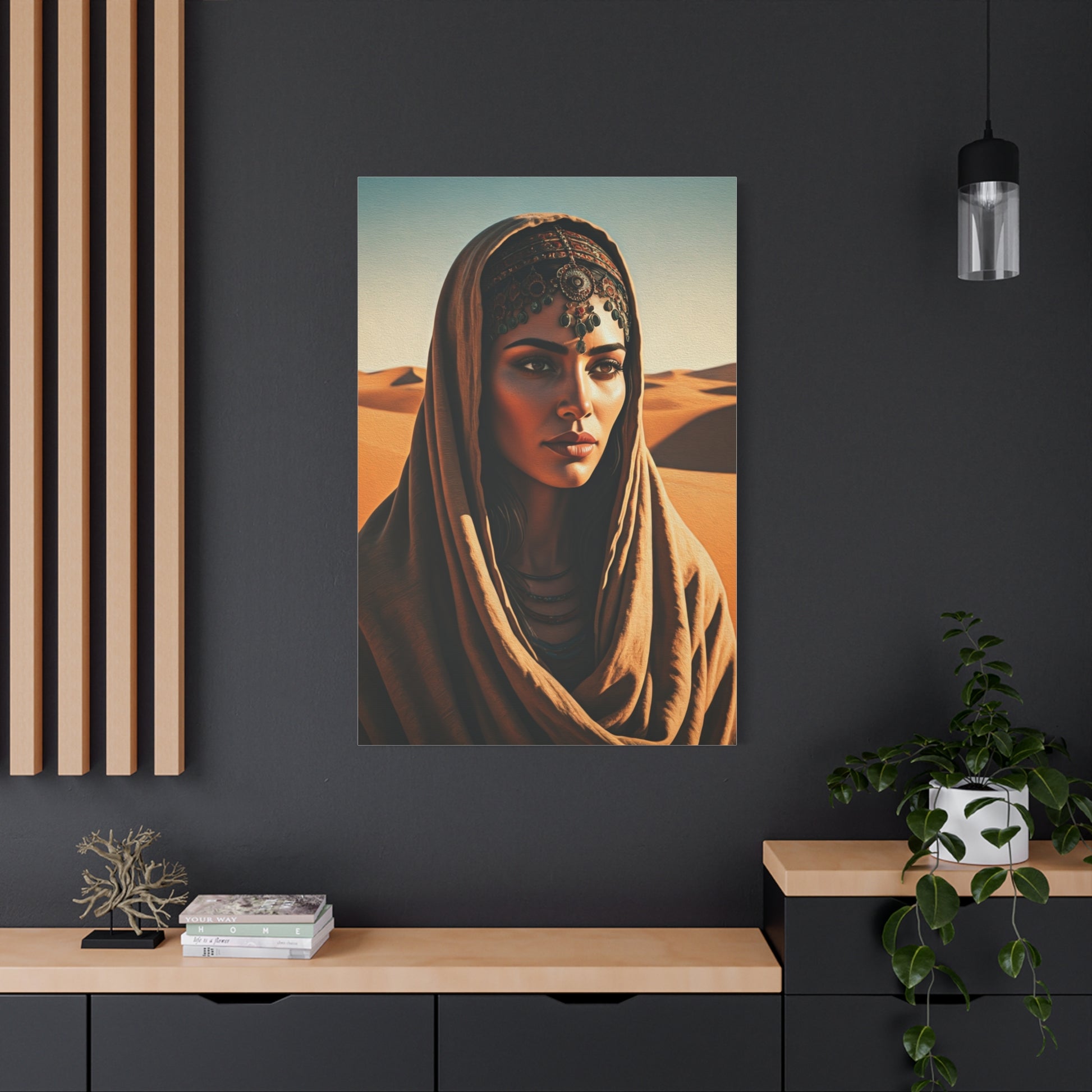 This captivating portrait features a serene woman wrapped in flowing desert fabrics, adorned with delicate metallic head jewelry. The warm sand dunes in the background enhance the earthy tones, creating a sense of timeless beauty and quiet strength. Soft natural light highlights her facial features and layered textures, adding depth and elegance. The composition evokes mystery, resilience, and inner calm. Perfect for bohemian, desert-inspired, or culturally rich interiors seeking warmth and sophistication.