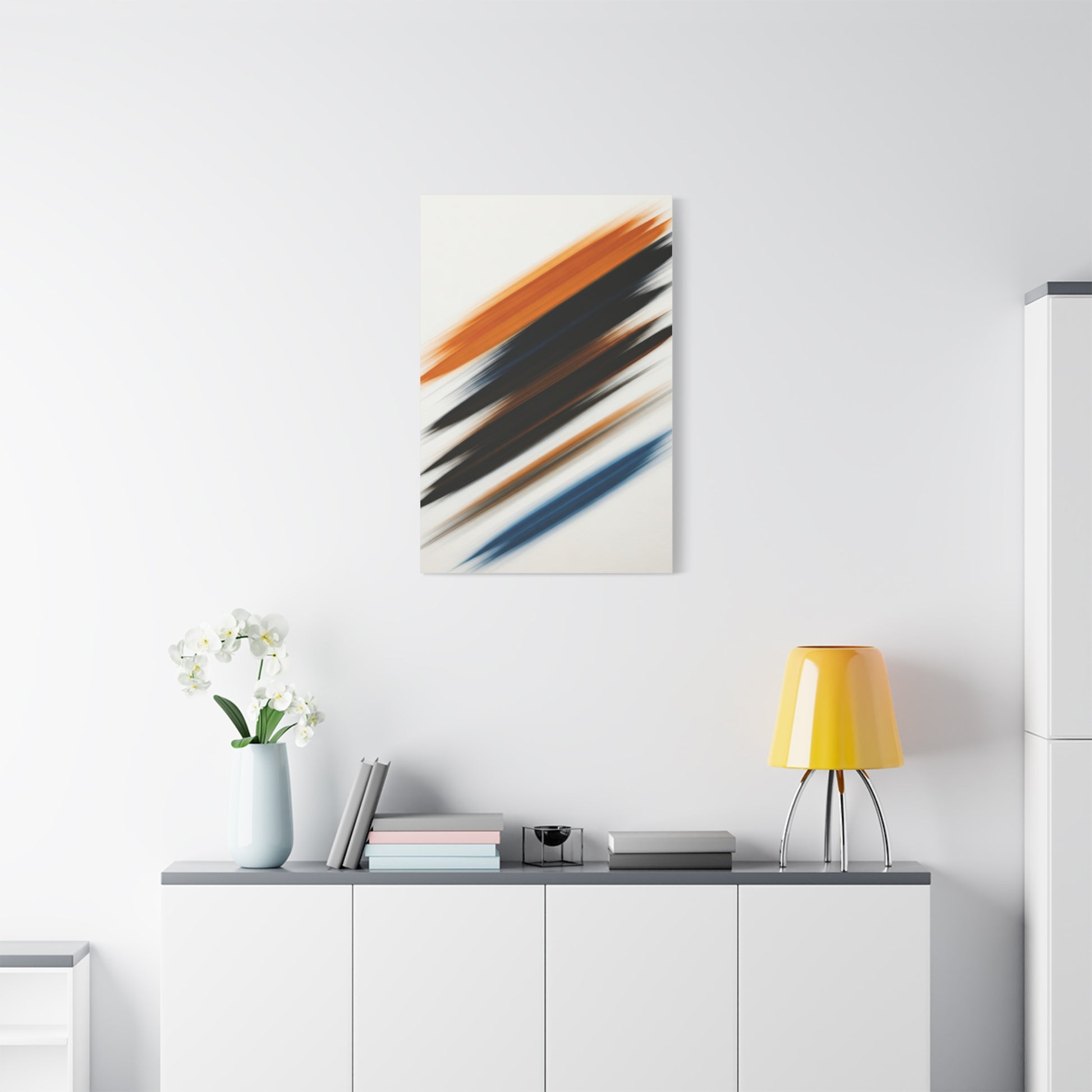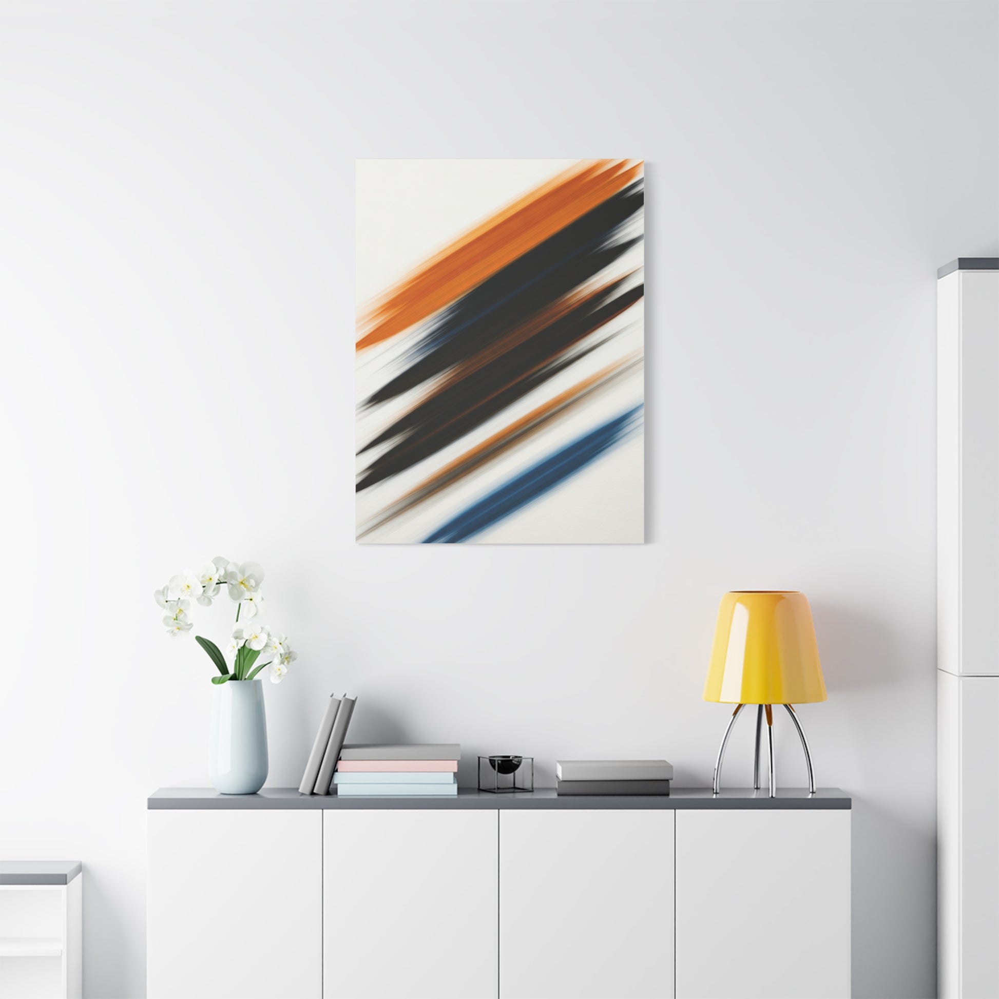 Dynamic diagonal strokes in warm amber, charcoal, and muted blue sweep across the canvas, creating a sense of speed and energy. The layered movement feels expressive yet controlled, making this artwork perfect for modern interiors that embrace creativity and bold design. A strong visual accent for offices, studios, or contemporary homes.