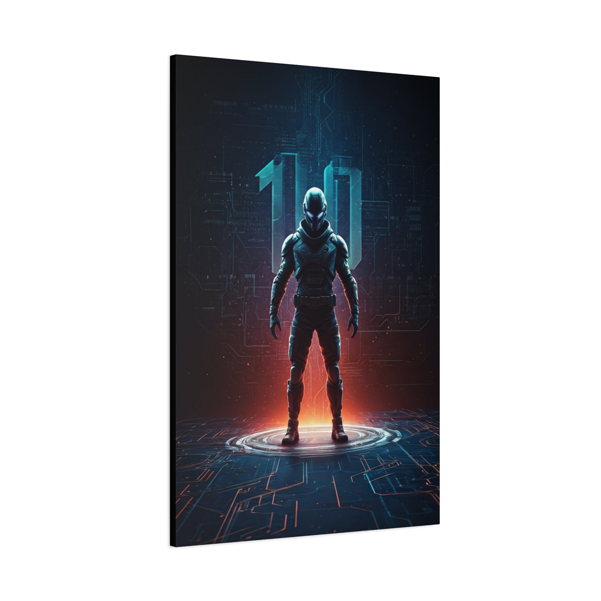 This futuristic wall art features an armored figure standing confidently on a glowing platform, framed by digital circuitry and the number eleven rising behind. The composition symbolizes evolution, technology, and ascension into a higher state of power. Cool tones and sharp lighting give the artwork a cinematic sci-fi atmosphere, making it ideal for modern interiors, game rooms, or creative studios. This canvas print represents progress, strength, and the merging of human presence with advanced digital worlds.