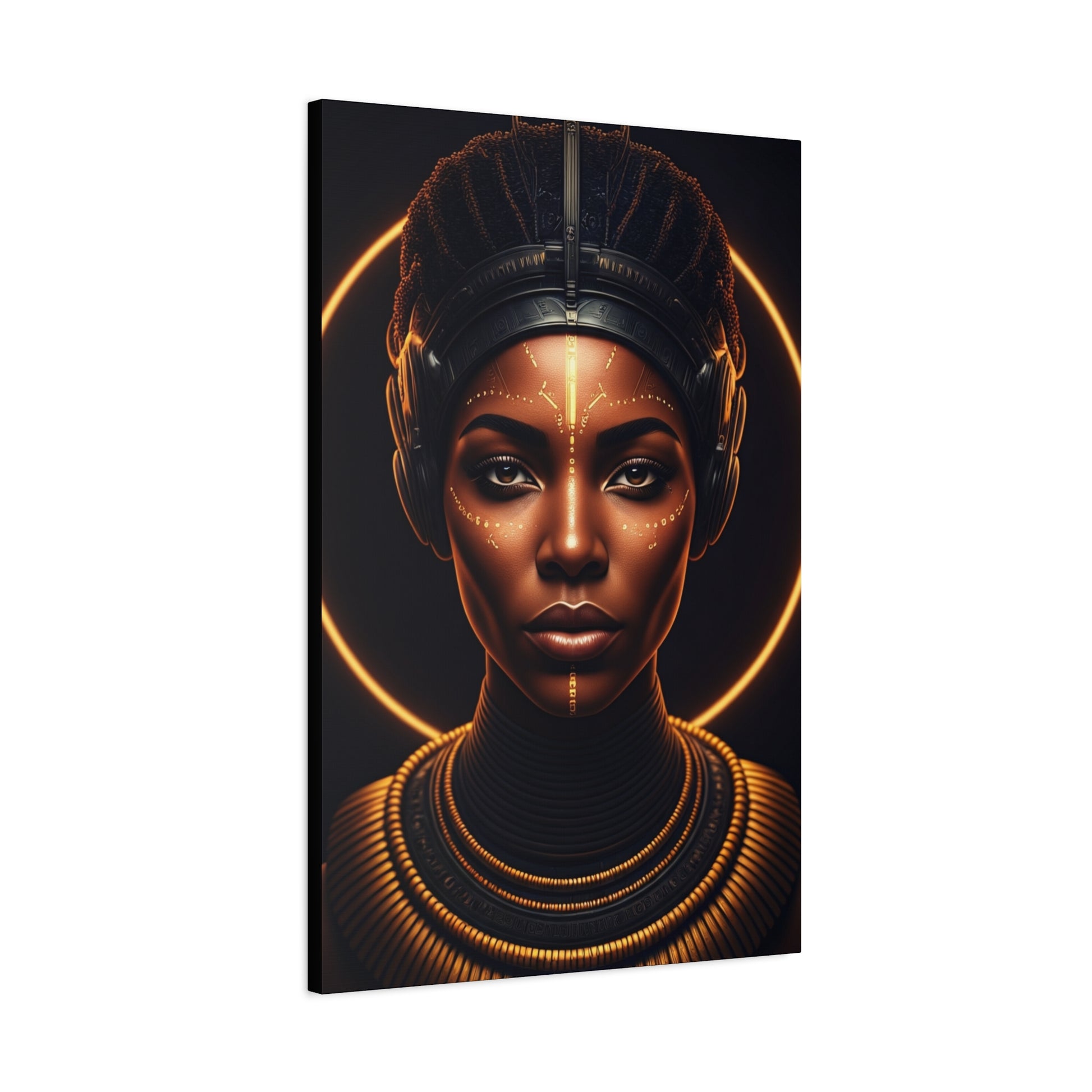 This mesmerizing portrait showcases a regal African queen framed by glowing circular light, symbolizing divinity, balance, and inner power. Her calm gaze and ornate gold details evoke spiritual elegance and royal authority. The cinematic lighting and modern symmetry make this piece ideal for luxury interiors, statement walls, or empowerment-themed décor.