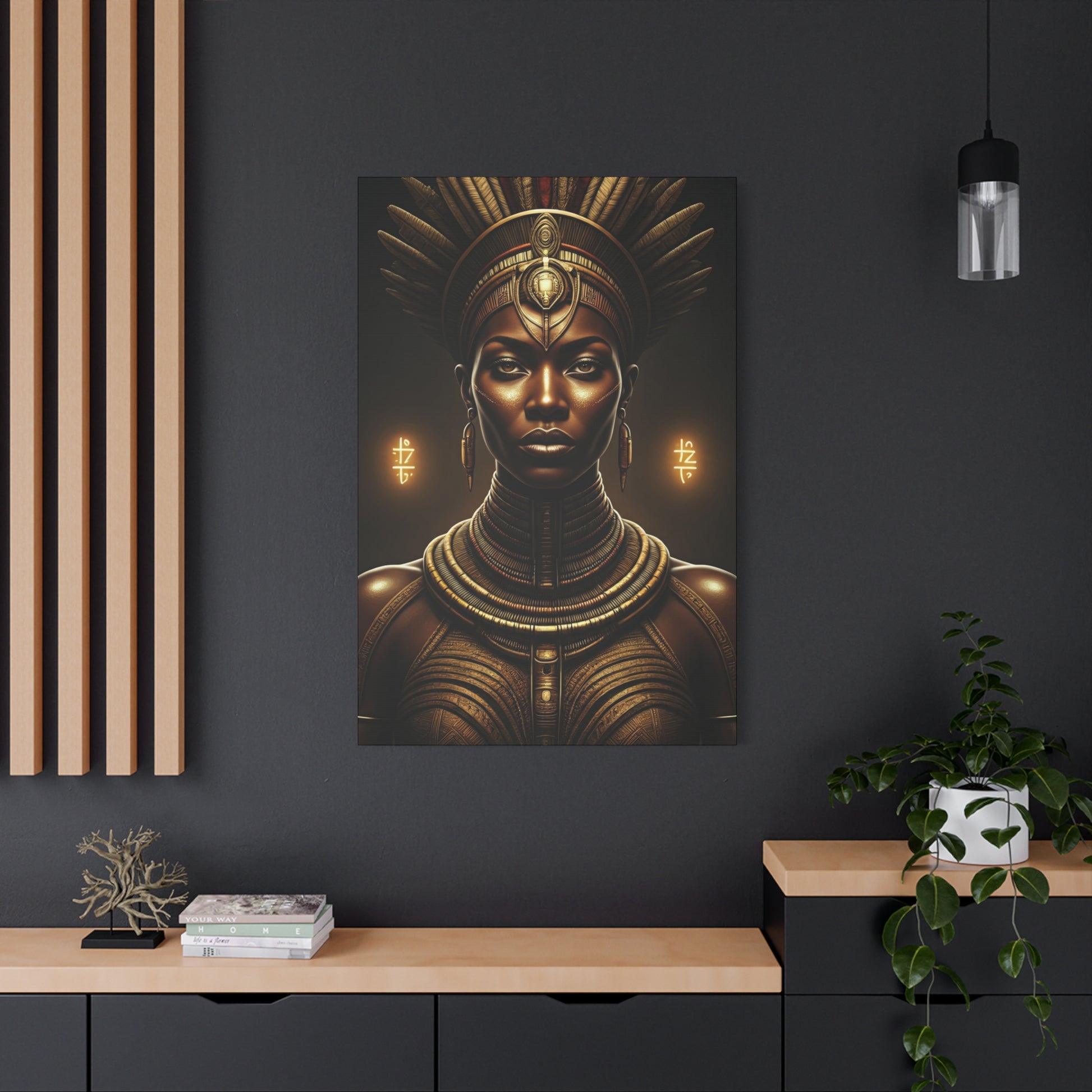 This elegant portrait showcases an African empress crowned in golden regalia, framed by symmetrical sacred lighting that evokes spirituality and royal authority. The cinematic depth and metallic detail make this artwork a luxurious centerpiece for sophisticated spaces, cultural décor themes, or collectors of timeless power imagery.