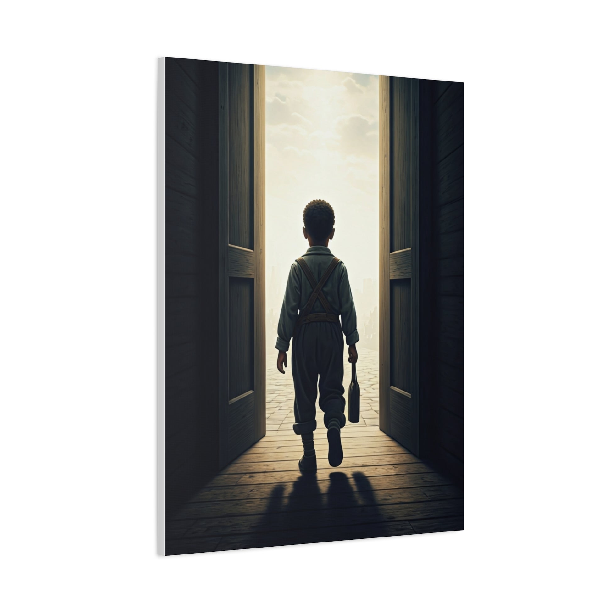 This evocative artwork portrays a small figure standing in an open doorway, gazing into a world filled with light and possibility. The contrast between the dark interior and the illuminated beyond creates a strong emotional narrative of choice, growth, and new beginnings. The minimal composition allows symbolism to take center stage, making the scene feel universal and deeply personal. Perfect for modern, minimalist, or inspirational interiors, this piece adds hope, curiosity, and quiet anticipation to any space.