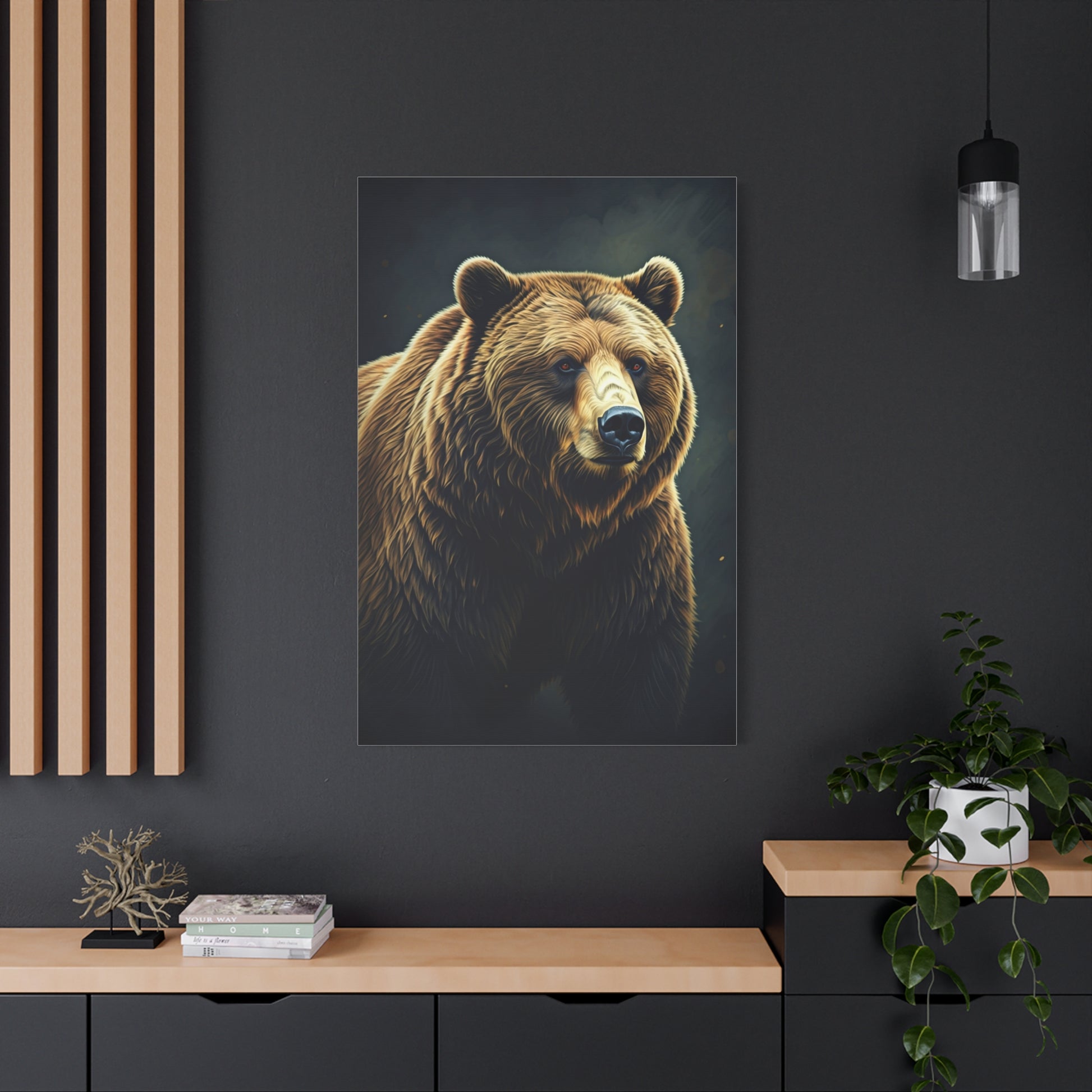 This breathtaking artwork captures a dominant grizzly set against an expansive, moody wilderness backdrop. The layered lighting and depth create a cinematic atmosphere that feels both powerful and serene. Detailed textures bring the bear to life with remarkable realism. An exceptional centrepiece for nature-inspired or masculine interior spaces.