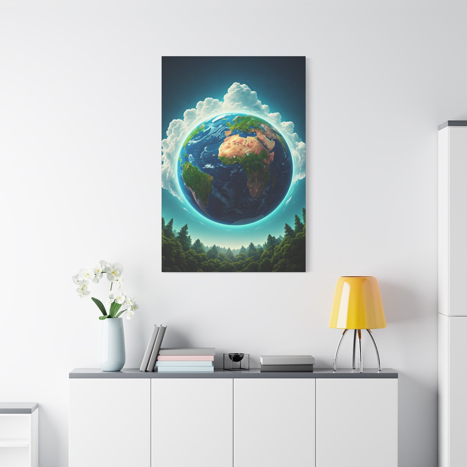 This uplifting wall art presents the Earth floating above a lush forest landscape, wrapped in soft clouds and glowing light. The composition beautifully blends planetary scale with natural elements, symbolizing harmony between humanity and nature. The vibrant greens, blues, and gentle atmosphere create a hopeful and inspiring visual that feels both grounding and expansive. Ideal for living rooms, offices, or eco-conscious interiors, this canvas print celebrates environmental balance, natural beauty, and the connection between Earth and life.