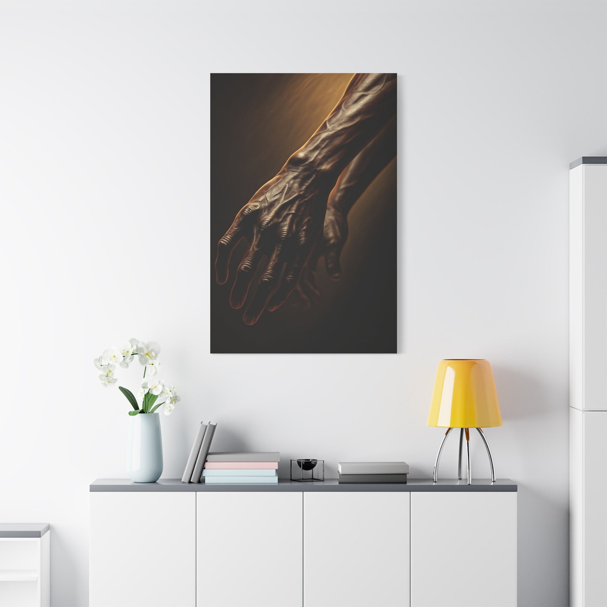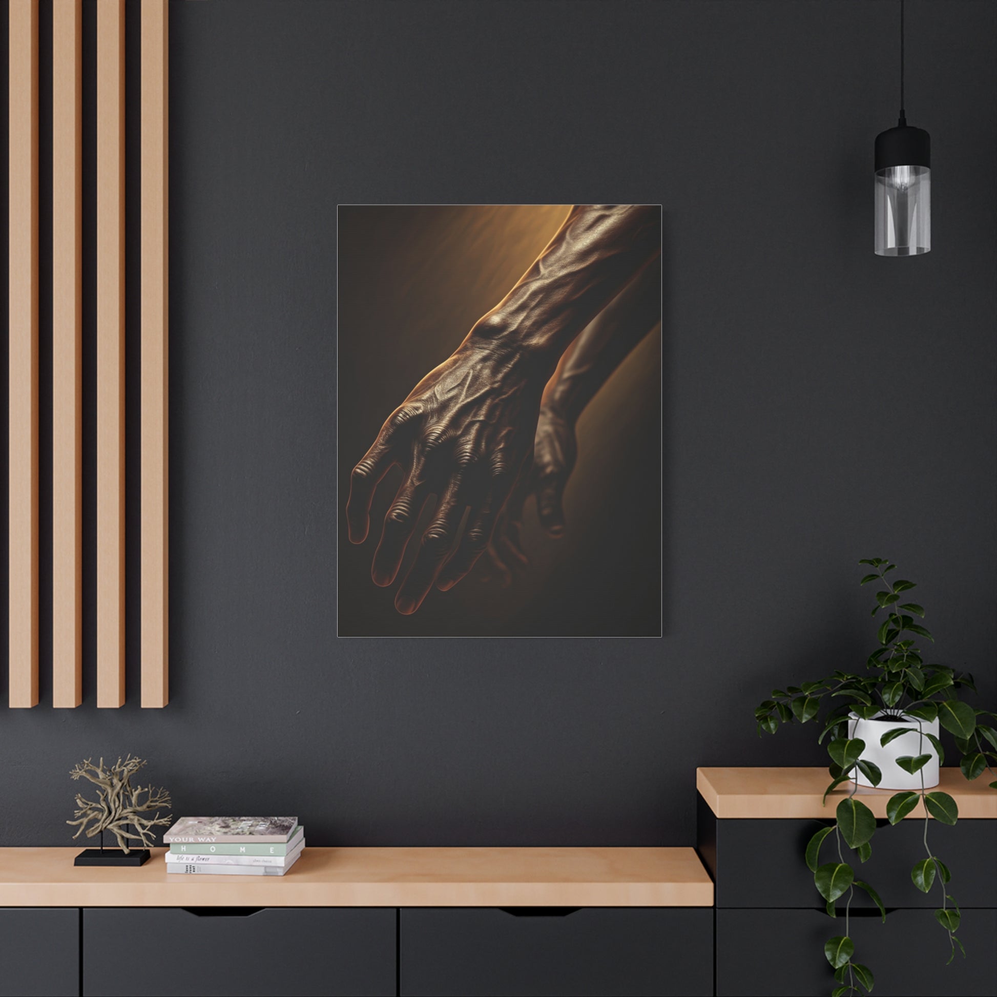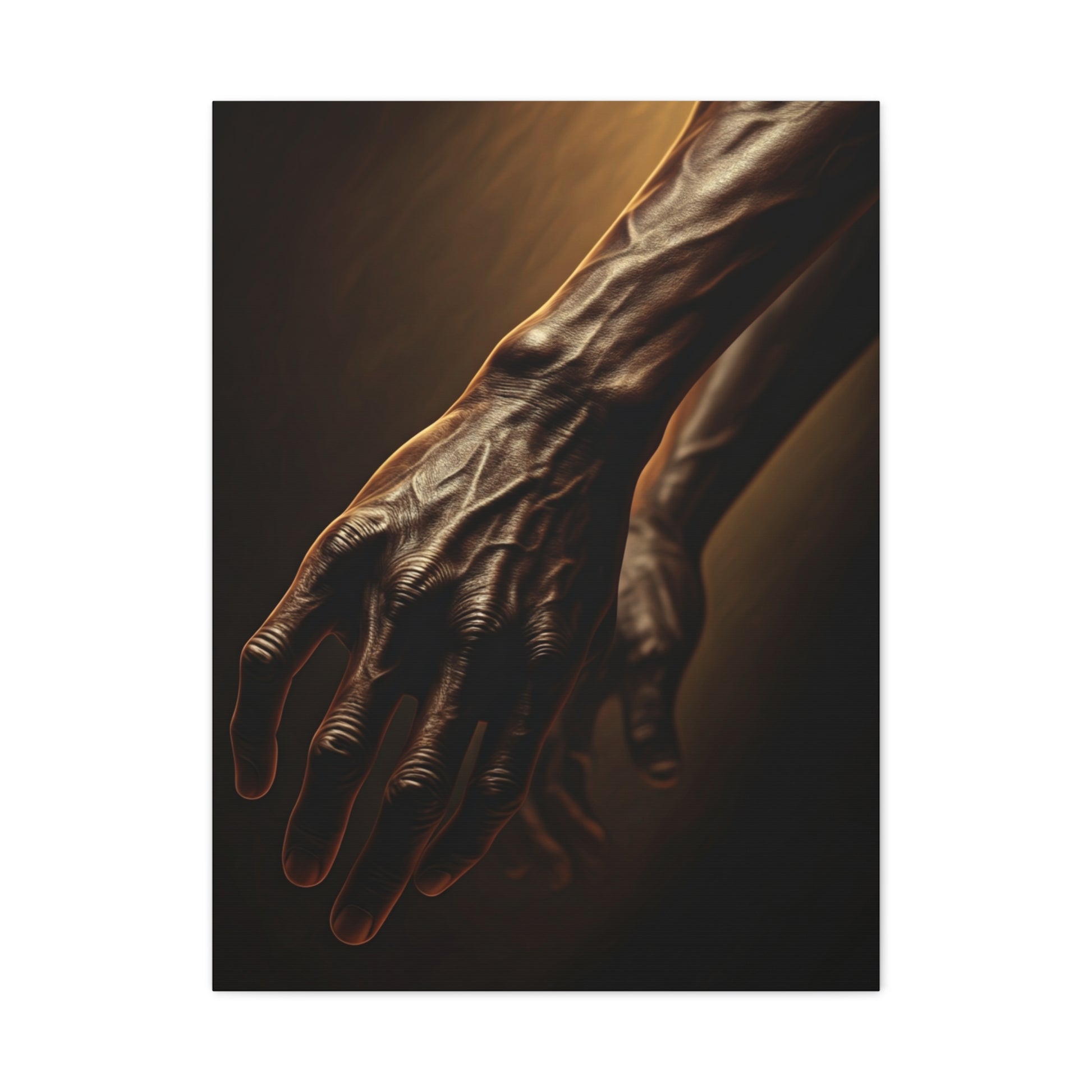 This powerful minimalist artwork captures the raw beauty of human strength through an intimate close-up of an outstretched hand, illuminated in warm bronze and shadowed depth. The detailed textures of veins, skin, and subtle movement create a striking sense of realism, symbolizing endurance, vulnerability, and survival. Soft gradients of light wrap around the form, giving the piece a dramatic yet elegant atmosphere that feels both emotional and timeless. Ideal for modern, contemporary, or symbolic interiors, this artwork serves as a bold statement of resilience, connection, and the quiet power held within human touch.