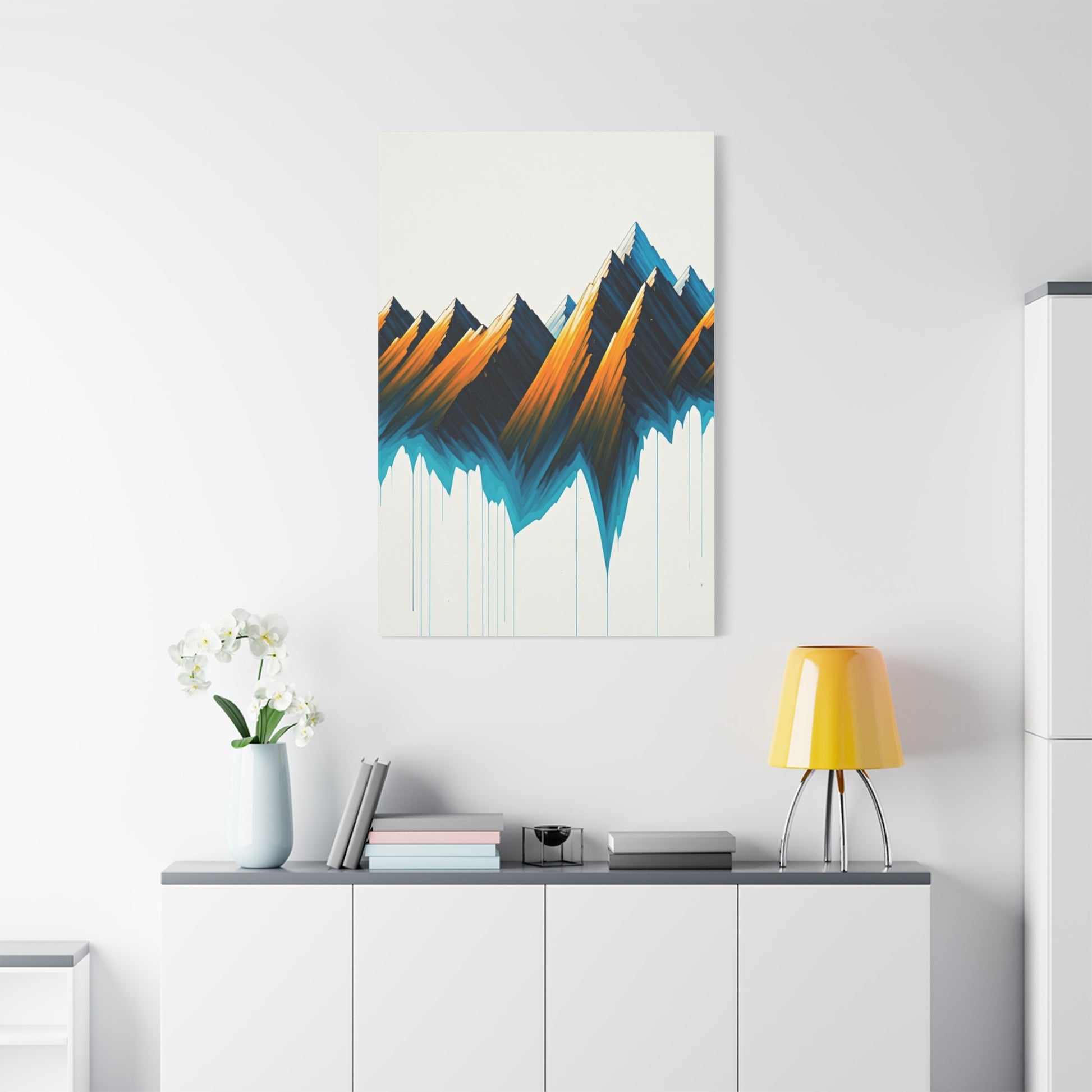 Echoing Peaks presents a striking abstract mountain formation where sharp blue ridges and warm golden tones flow downward in fluid motion. The blend of structure and softness creates a modern landscape-inspired composition that brings depth, movement, and refined energy to contemporary interiors.