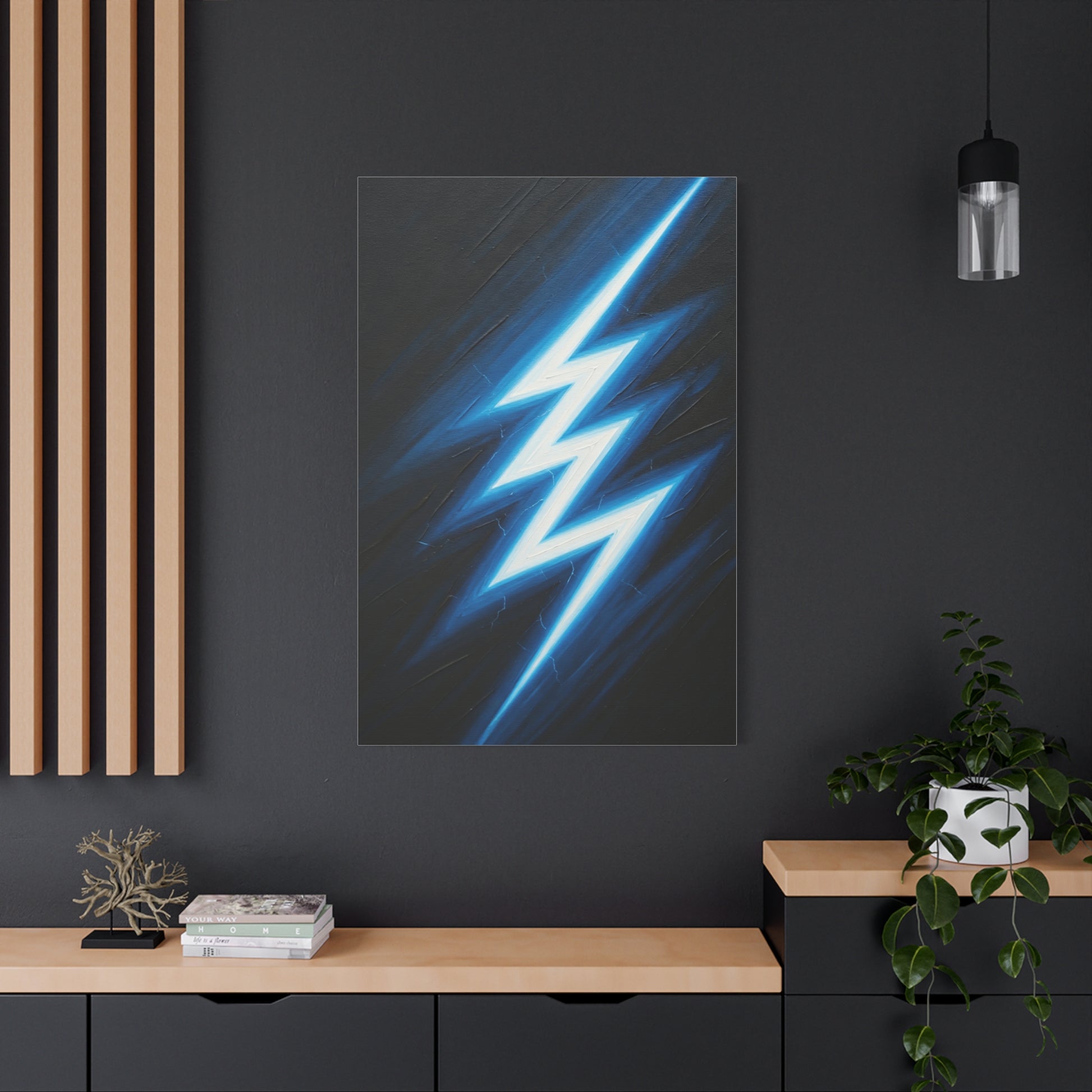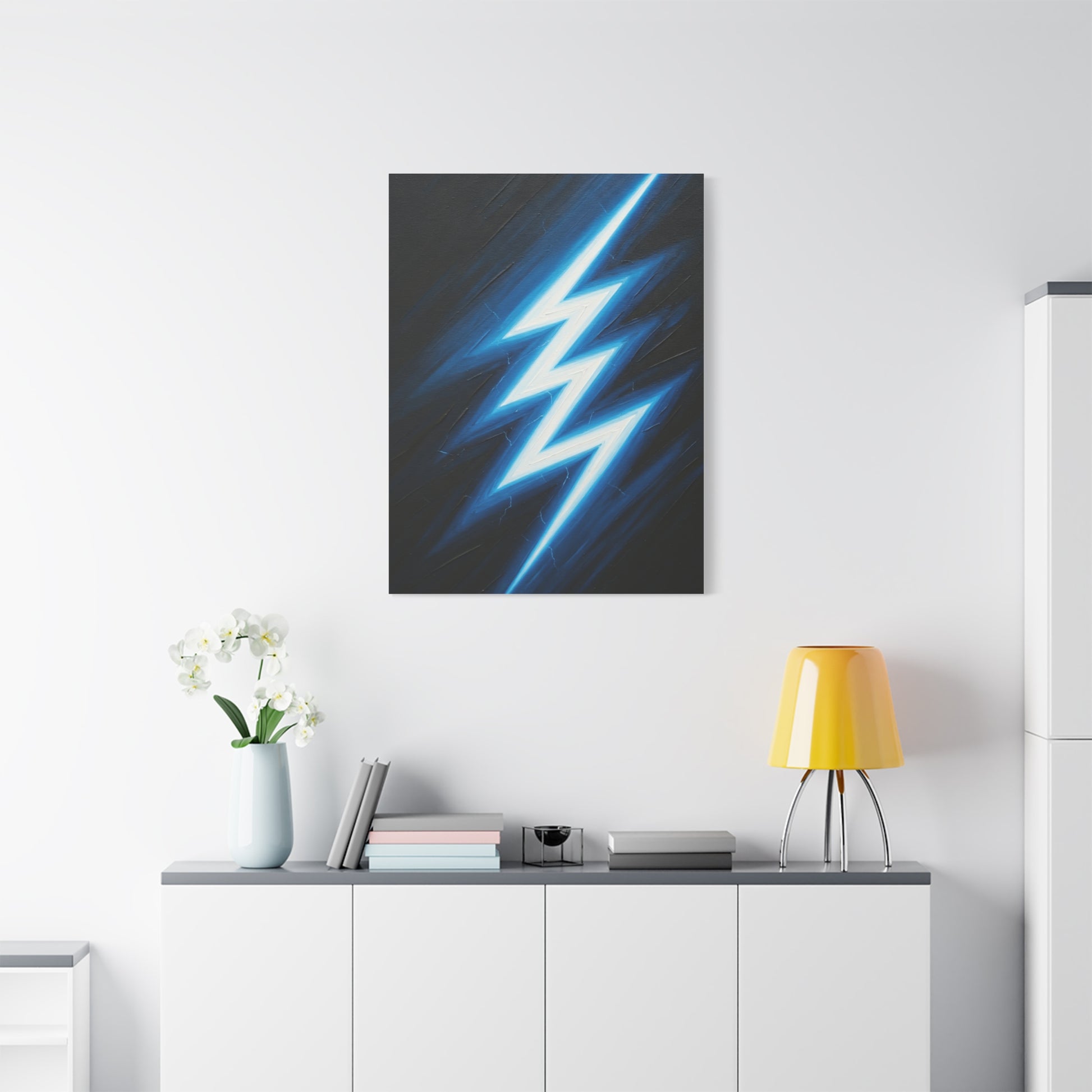 A bold lightning bolt cuts through a dark background in this powerful abstract artwork, symbolizing energy, speed, and impact. The sharp contrast and glowing highlights make it a dynamic focal point. Ideal for modern interiors, offices, or creative spaces, this piece adds intensity, motion, and contemporary edge to your décor.