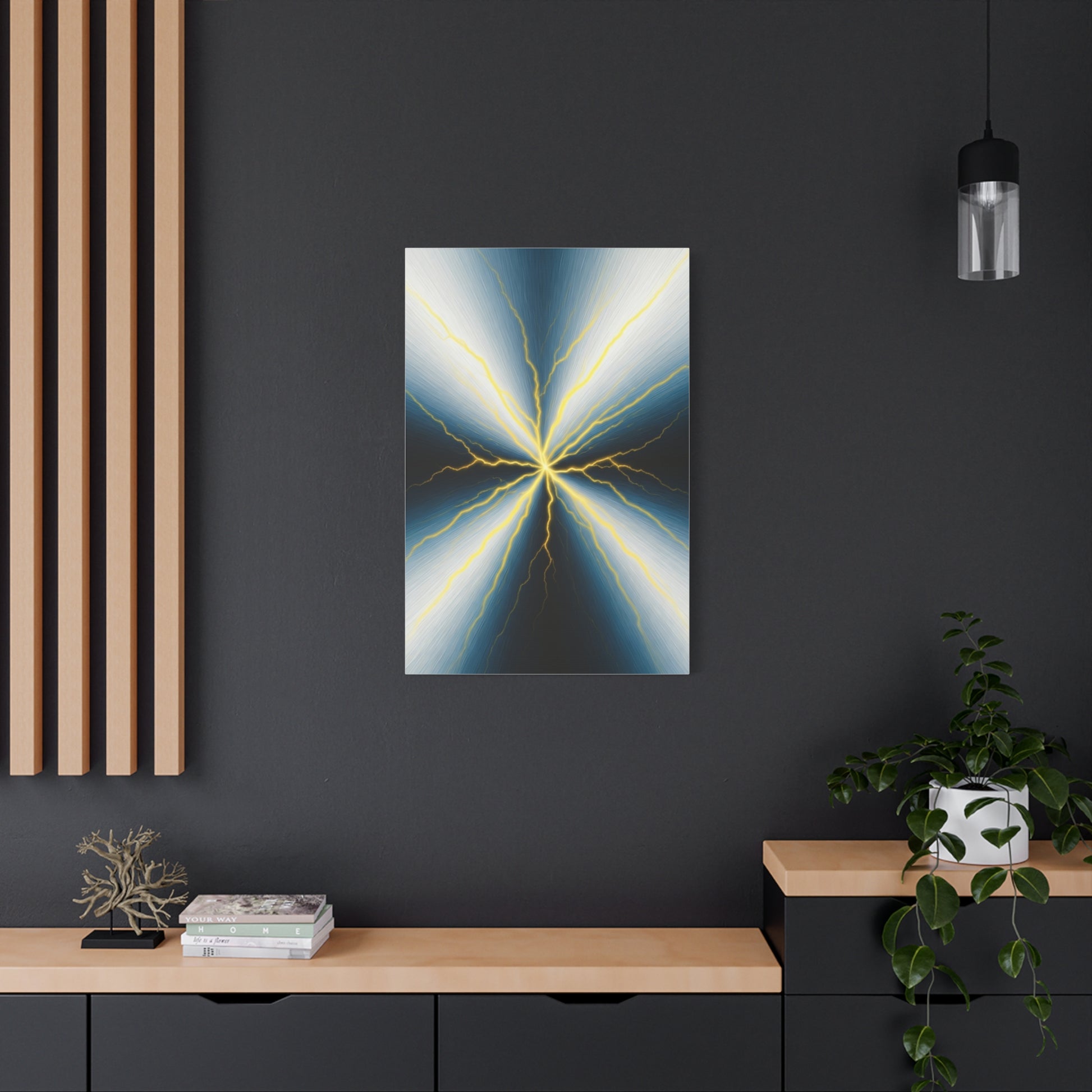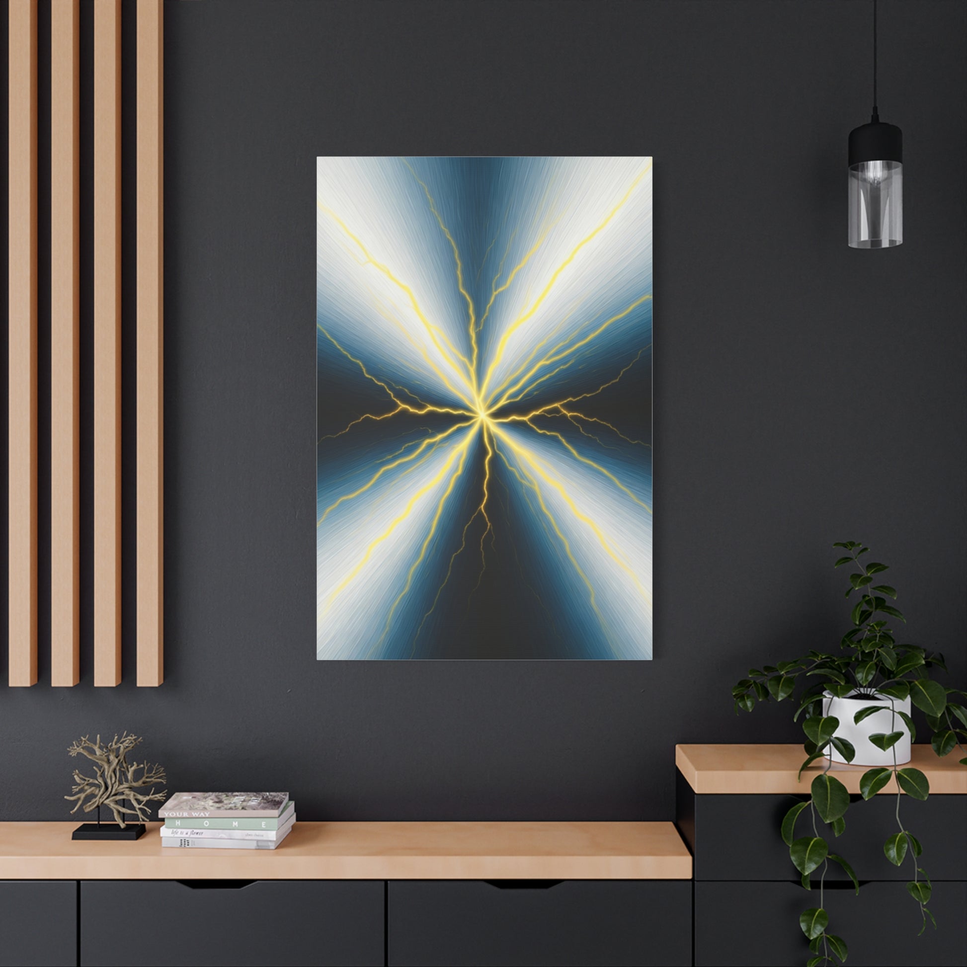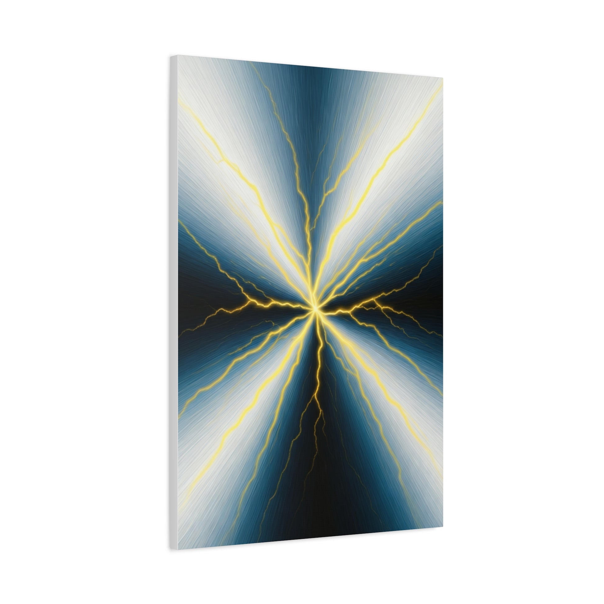 Electric Nexus showcases raw energy through symmetrical lightning forms radiating from a central core. The dramatic contrast and sharp lines create a commanding presence, making this artwork an eye-catching centrepiece for modern, high-impact interiors.