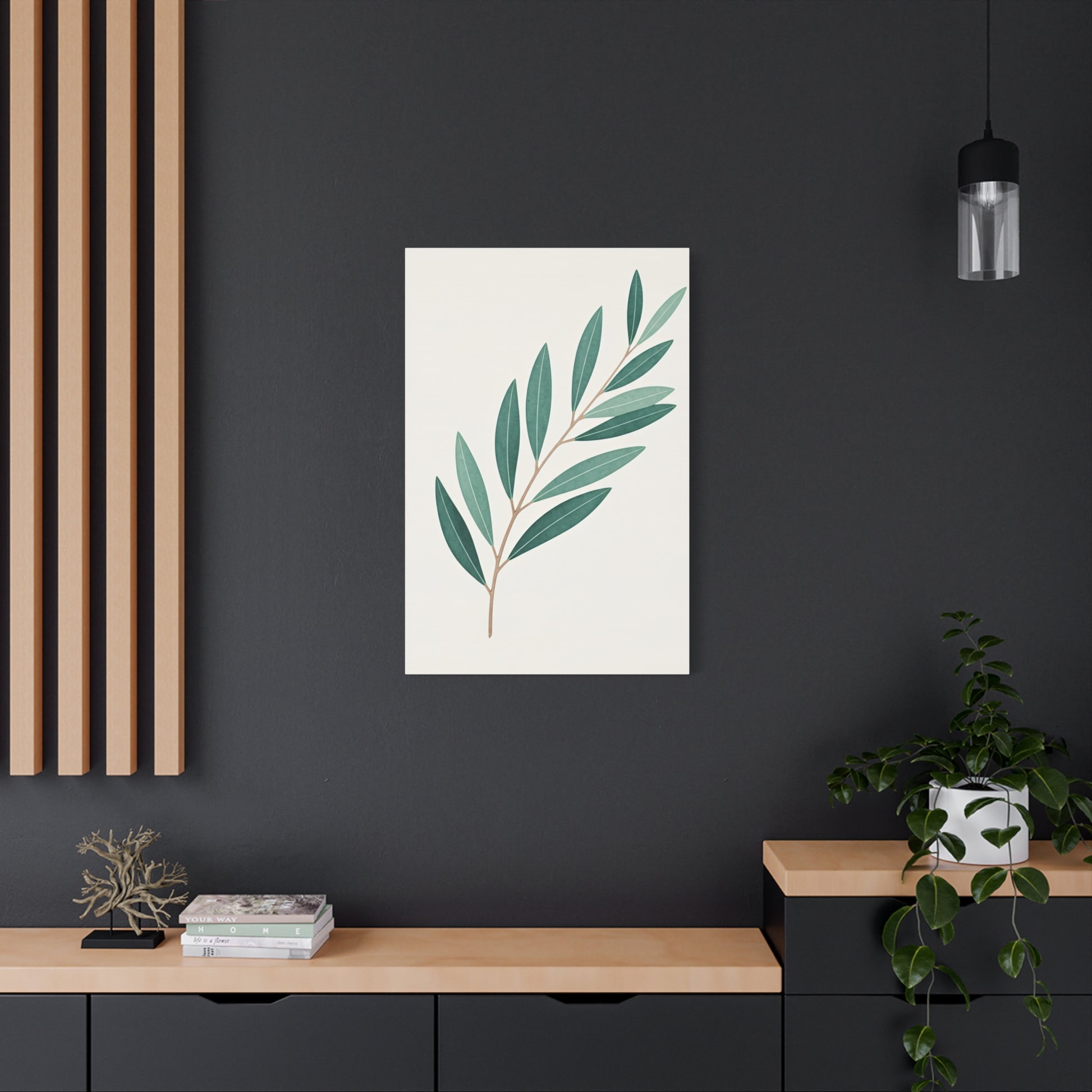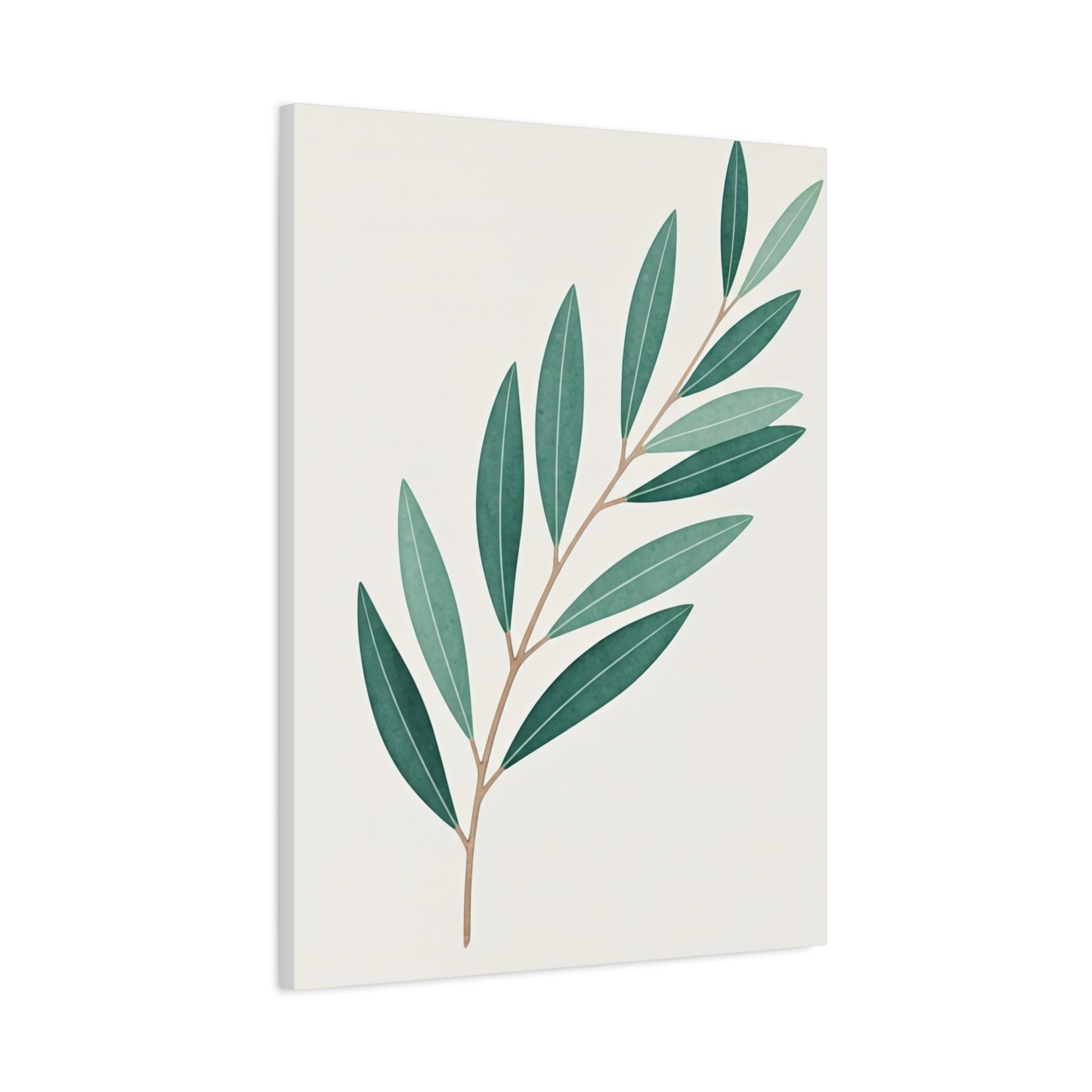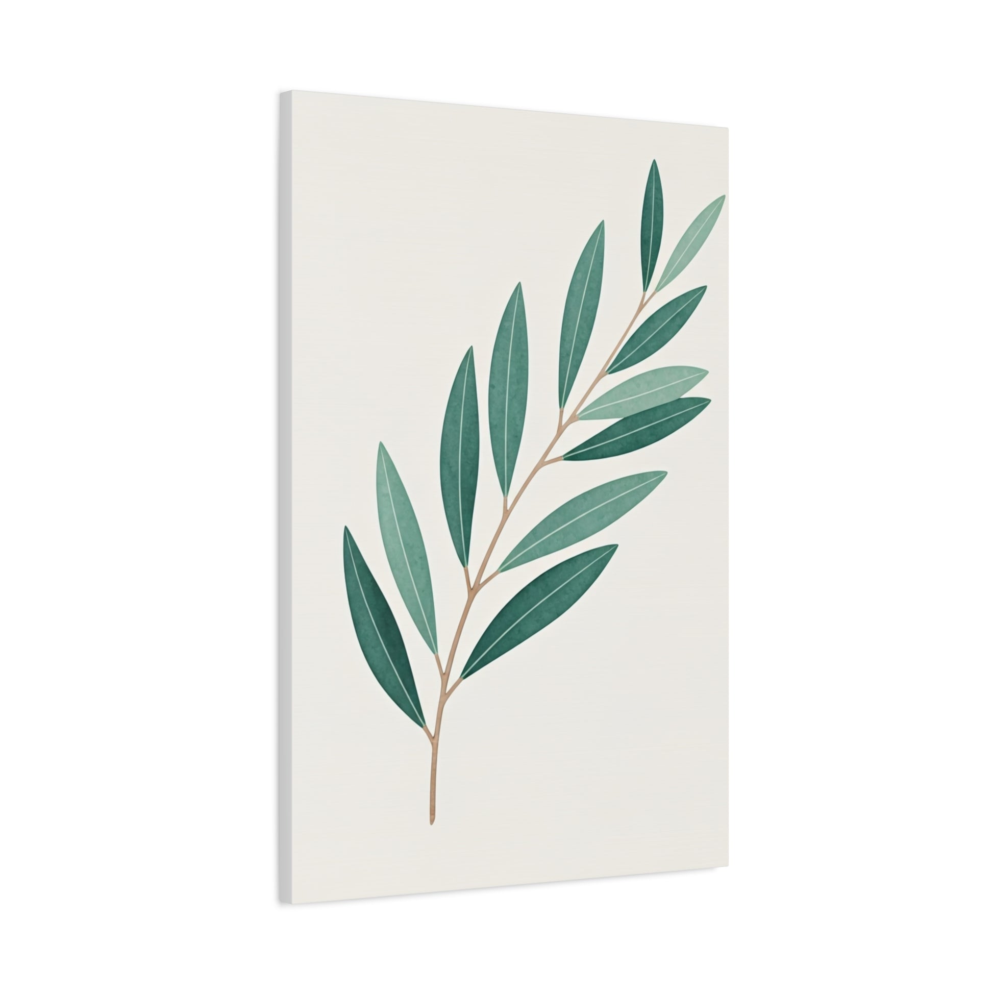 A delicate botanical artwork showcasing a graceful olive branch with muted green leaves arranged against a soft cream background. The minimal style and balanced spacing evoke simplicity and harmony, bringing a refined natural touch to bedrooms, offices, or contemporary living spaces.