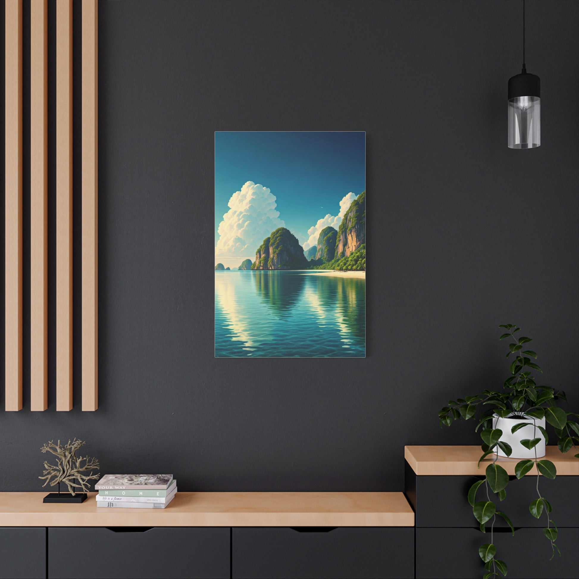 A stunning coastal lagoon scene where towering green cliffs reflect across still waters under expansive clouds. The quiet beauty and cinematic atmosphere create a luxurious, calming statement for modern interiors.