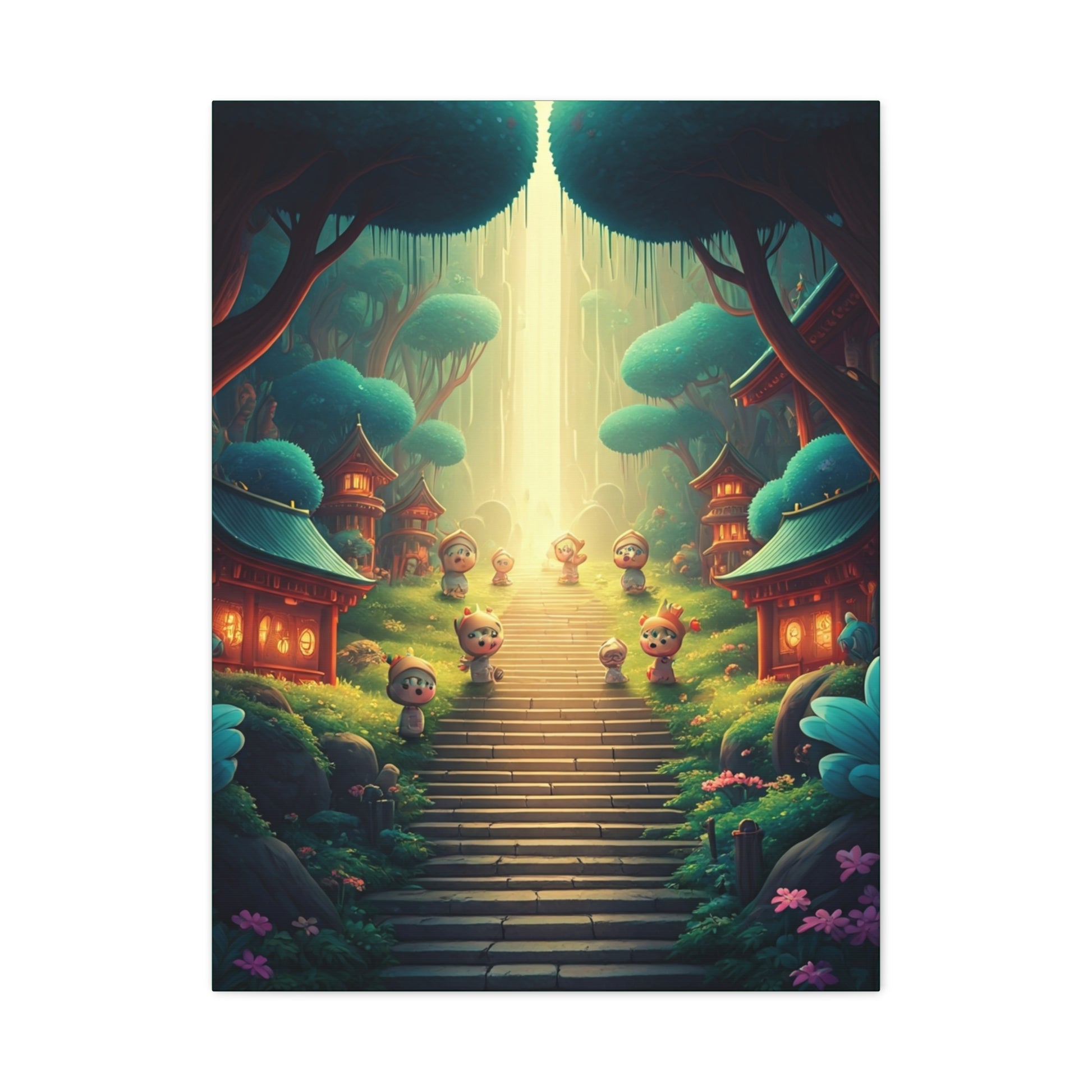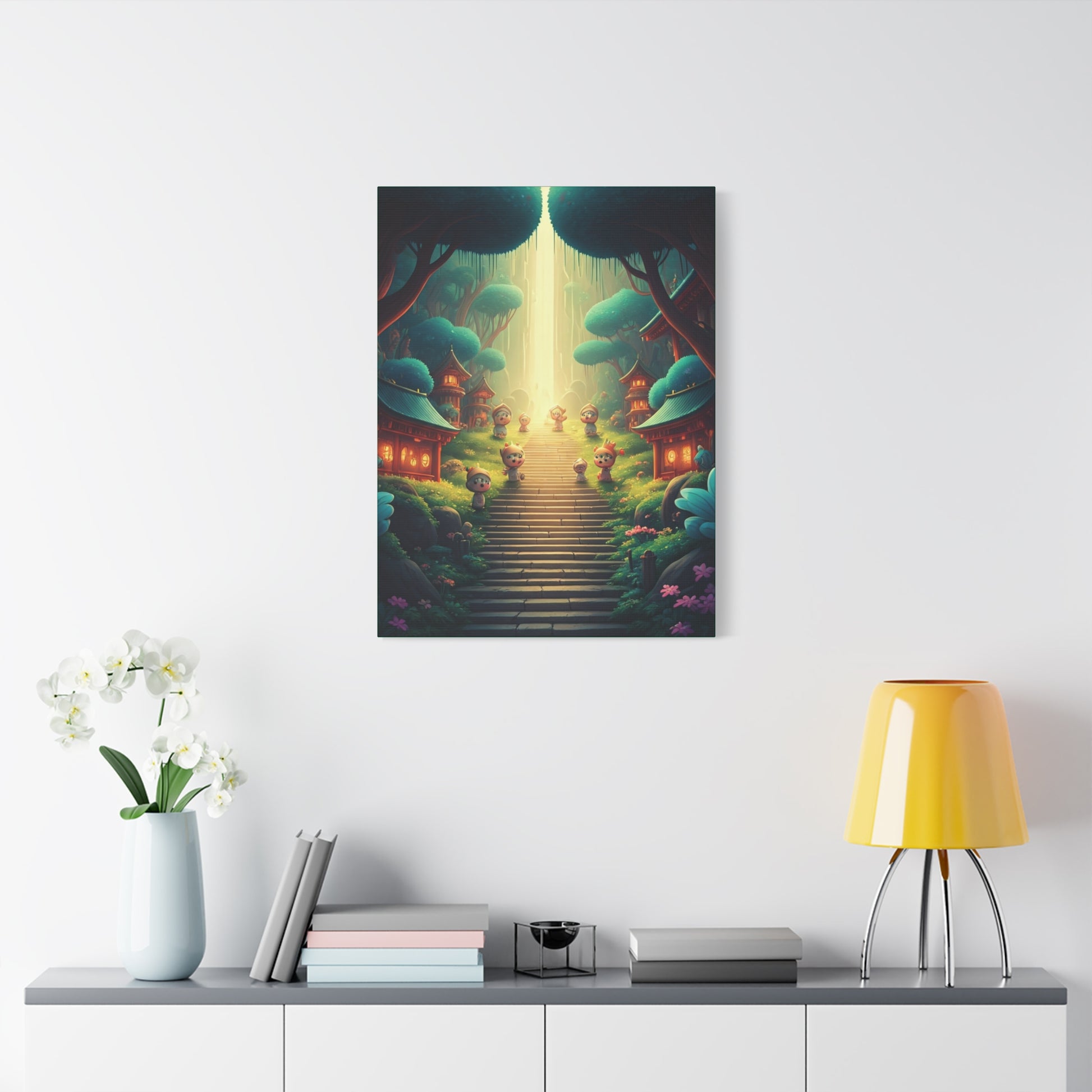 This magical wall art presents a serene forest stairway leading toward a radiant beam of light, surrounded by charming houses and playful figures. The soft colors and glowing atmosphere evoke a storybook feeling filled with wonder and calm. The upward path symbolizes hope, discovery, and peaceful journeys. Perfect for bedrooms, children’s rooms, or cozy living spaces, this canvas print brings imagination, warmth, and gentle fantasy into your home.