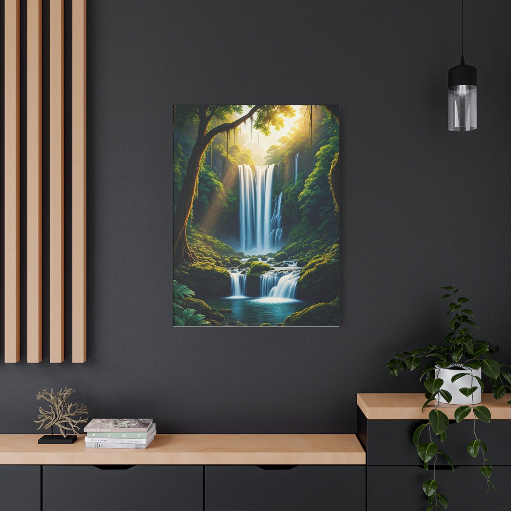 This breathtaking landscape artwork showcases a cascading waterfall flowing through a lush green forest sanctuary. Sunlight filters through the trees, creating a magical atmosphere of peace, renewal, and wonder. Perfect for calming interiors, spa-like spaces, or anyone who loves immersive nature scenery.