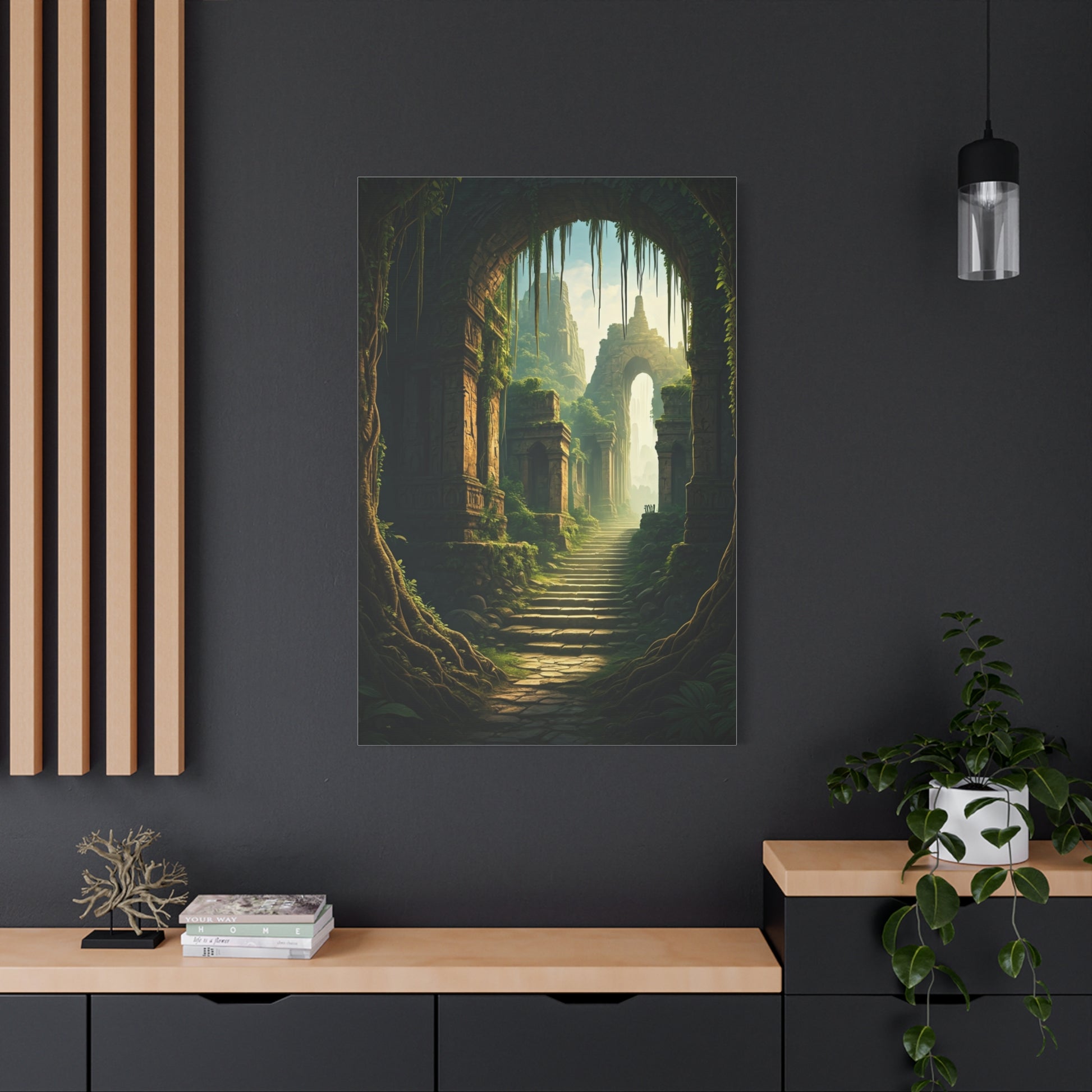 This mystical artwork depicts an ancient stone gateway hidden within lush greenery, leading into a forgotten world of wonder and mystery. Soft light streams through towering arches, evoking imagination, adventure, and timeless fantasy landscapes. Perfect for dreamlike interiors, book lovers, or spaces seeking an atmospheric escape.