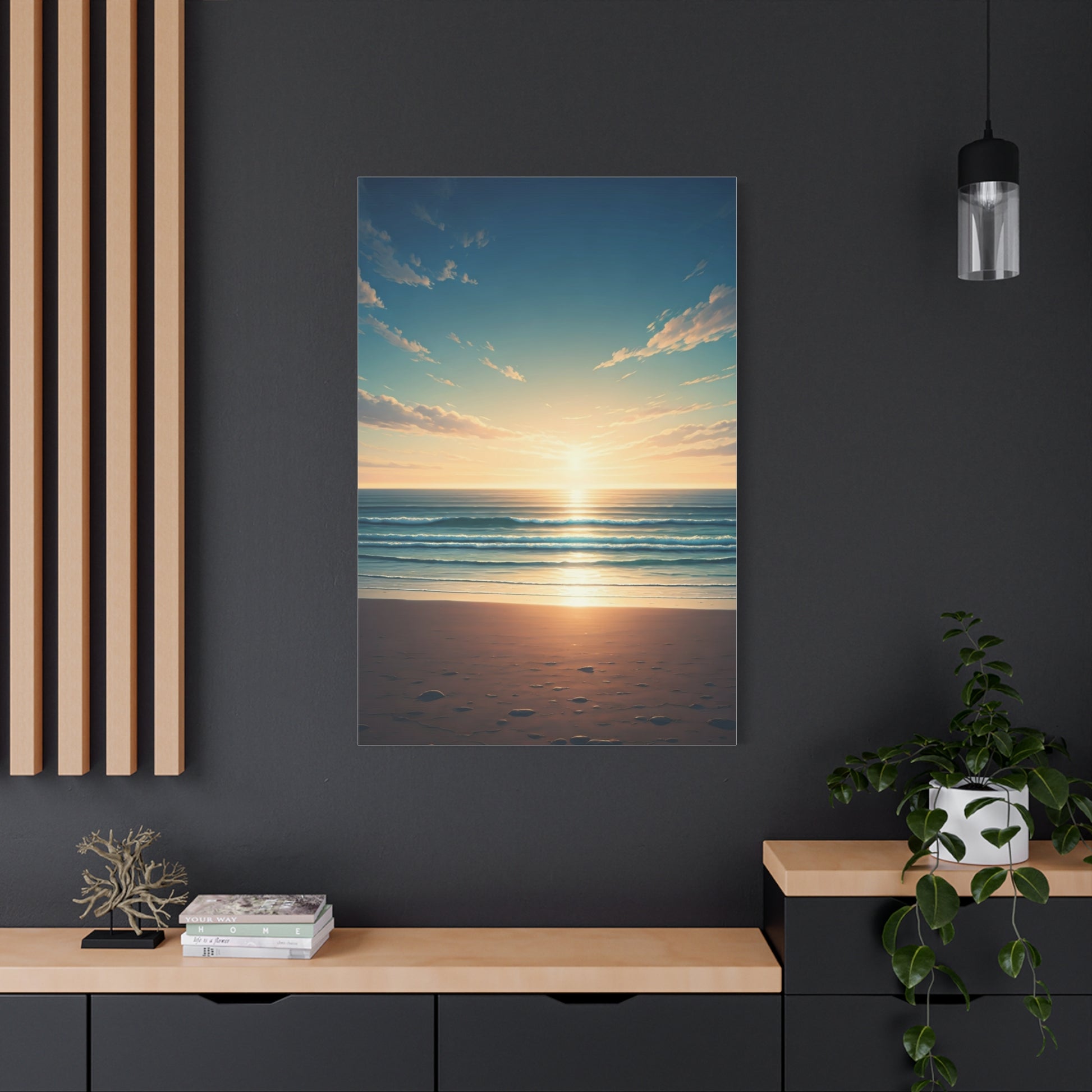 A cinematic ocean sunrise scene where soft sunlight stretches across layered waves and quiet shoreline sand. The dreamy horizon and subtle warmth evoke calm renewal, perfect for elegant minimalist beach décor.