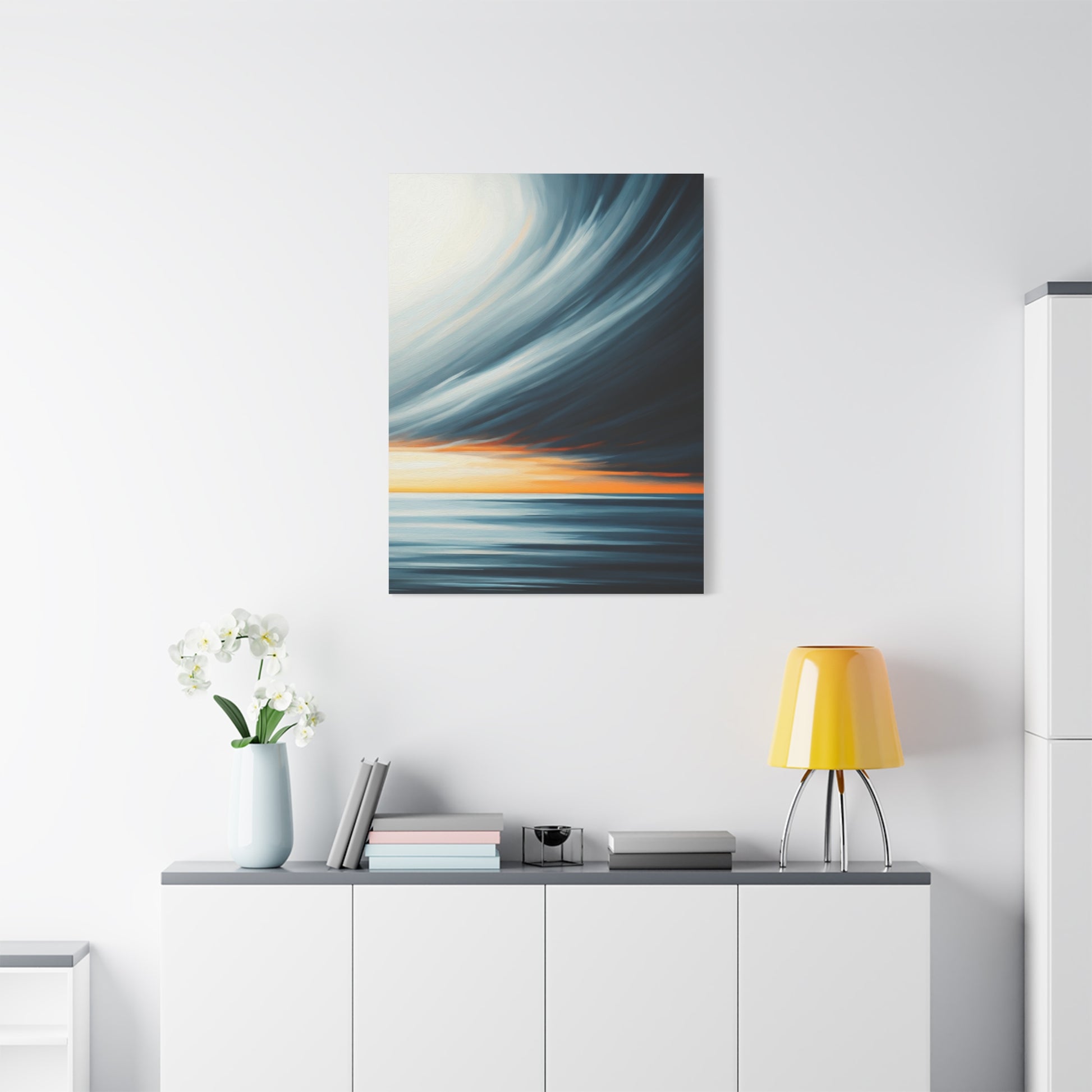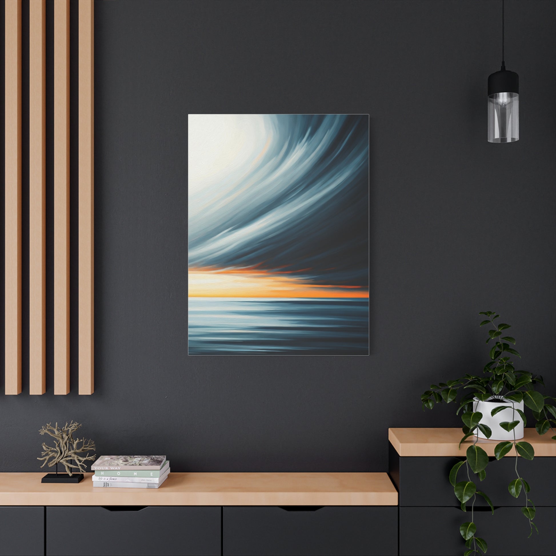 This captivating abstract artwork evokes the quiet drama of an ocean horizon at dusk, where sweeping bands of cool blues and deep charcoal tones flow effortlessly across the canvas. Soft, elongated brushstrokes arc diagonally through the sky, creating a sense of movement and depth, while a thin line of warm amber and soft gold glows gently along the horizon. Below, calm waters mirror the sky’s shifting tones, adding balance and serenity to the composition. The contrast between light and shadow, warmth and coolness, gives this piece an atmospheric, almost cinematic quality. Perfect for modern, contemporary, or minimalist interiors, this artwork brings a sense of calm, reflection, and understated elegance to living rooms, bedrooms, offices, or tranquil spaces designed for relaxation.